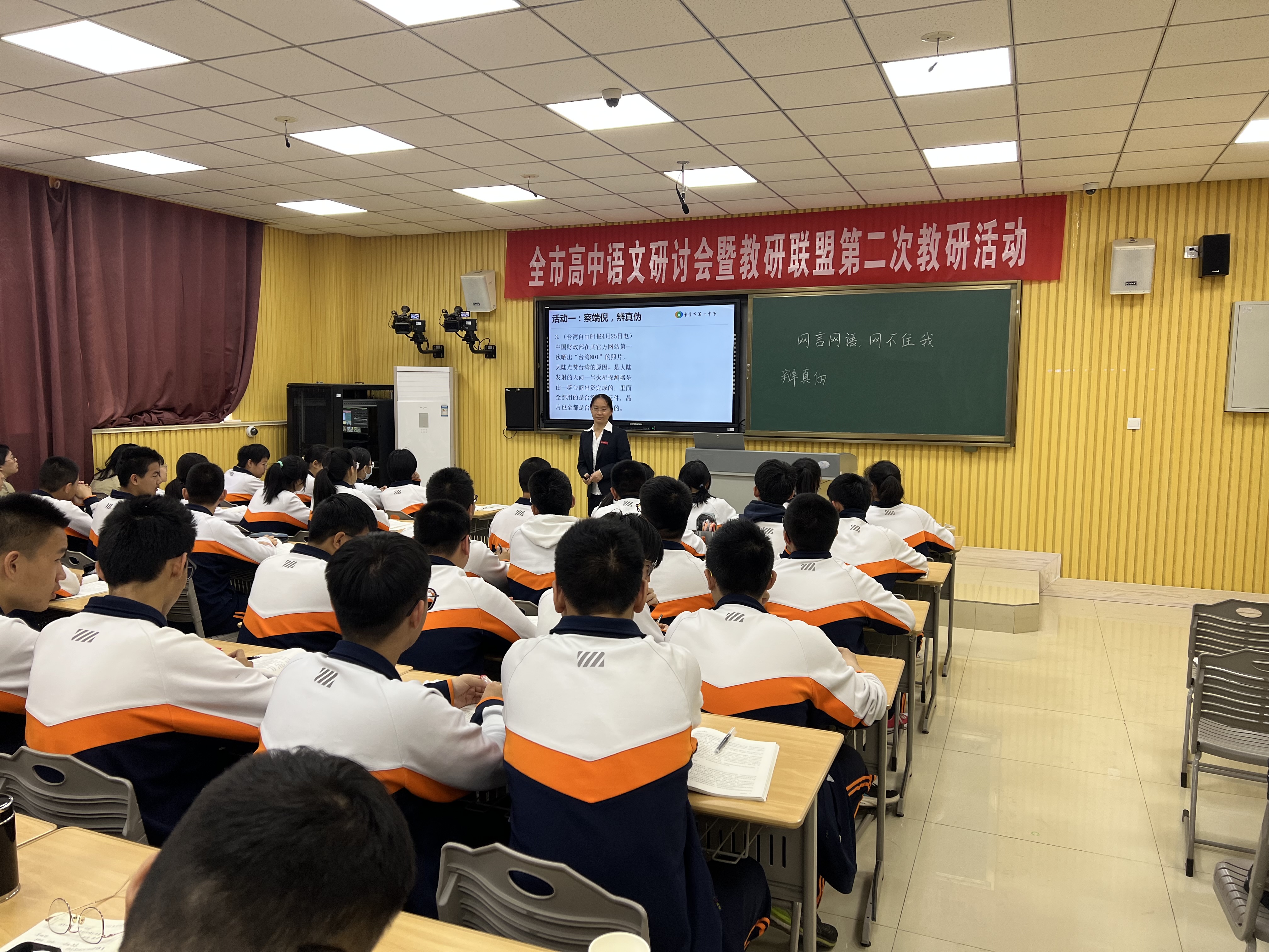 康燕老师的课针对近期网络热点,以学科活动为主要途径,指导学生辨识媒介信息真伪,评判媒介信息良莠。经教科院徐国亮主任指导,康燕老师认识到题目“网言网语,网不住我”中的“网不住”应指向于增强学生的思想性。教学过程中,紧扣单元主题“信息时代的语文生活”,针对“信息时代”媒介信息量大、传播快、传播广却又真伪难辨、良莠不齐的特点,重在指导学生以正确的价值观阅读审视海量信息,能够辨别信息的真假良莠,培养其健康的心理,提升其精神境界。课堂上学生活动充分,讨论、回答问题积极踊跃,达到了良好的效果,也得到了徐主任及与会教师的认可。