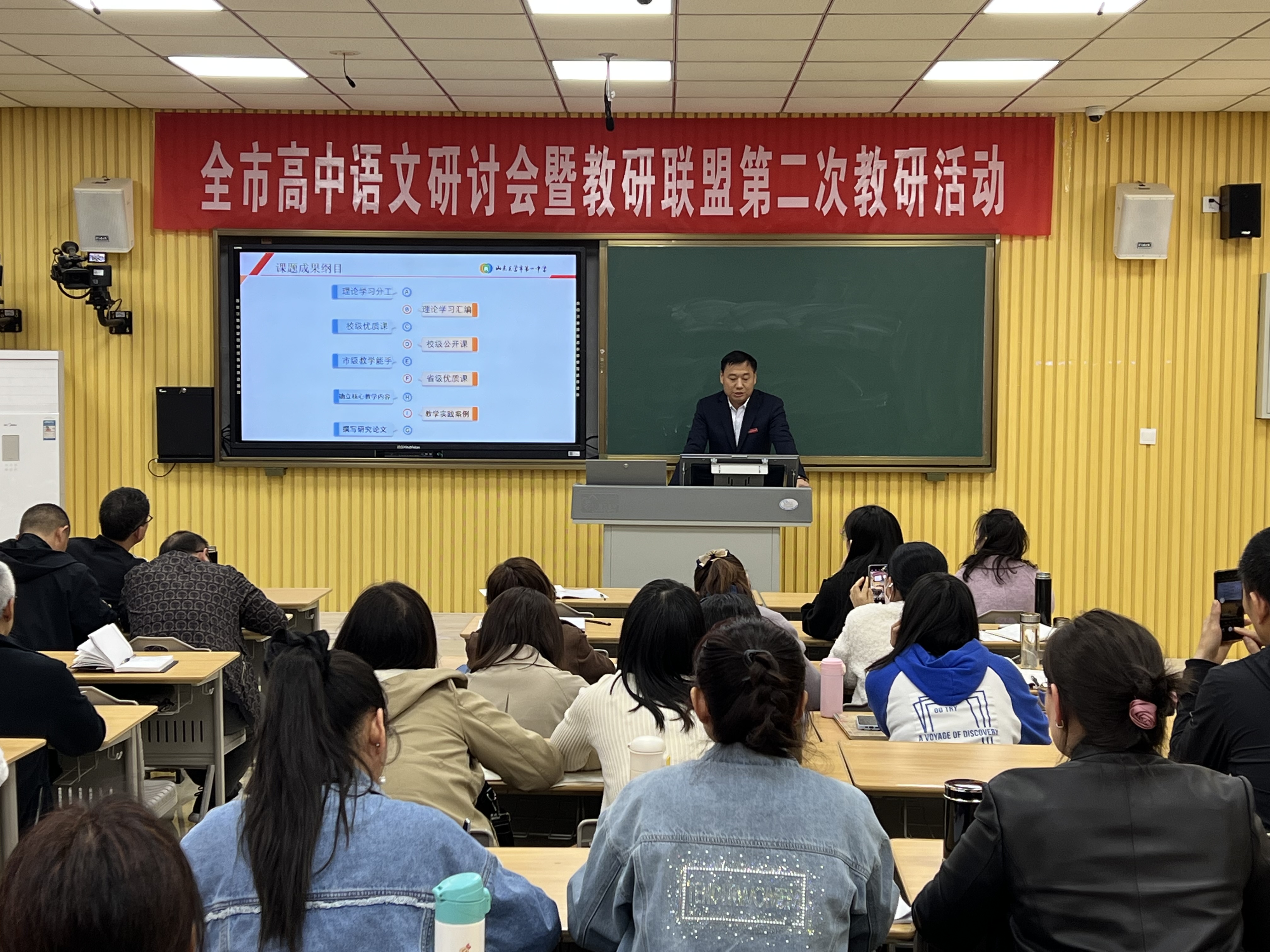 张建辉主任作为研究课题的第一主持人,介绍了课题的研究方向、研究过程、研究分工等,并进行了课题的研究成果展示。也着重介绍了我校作为省级语文特色学科基地的语文特色学科课程体系纲目。东营市第一中学语文组迫切希望以我们的经验为起点,能有更多的学校加入到我们的队伍中来,能为东营市的语文学科建设、语文教师队伍成长迈出成功的第一步。