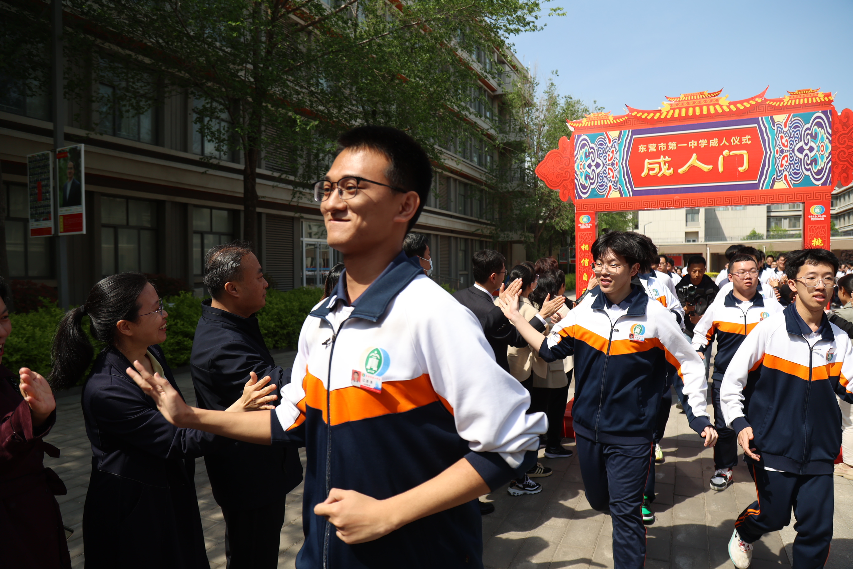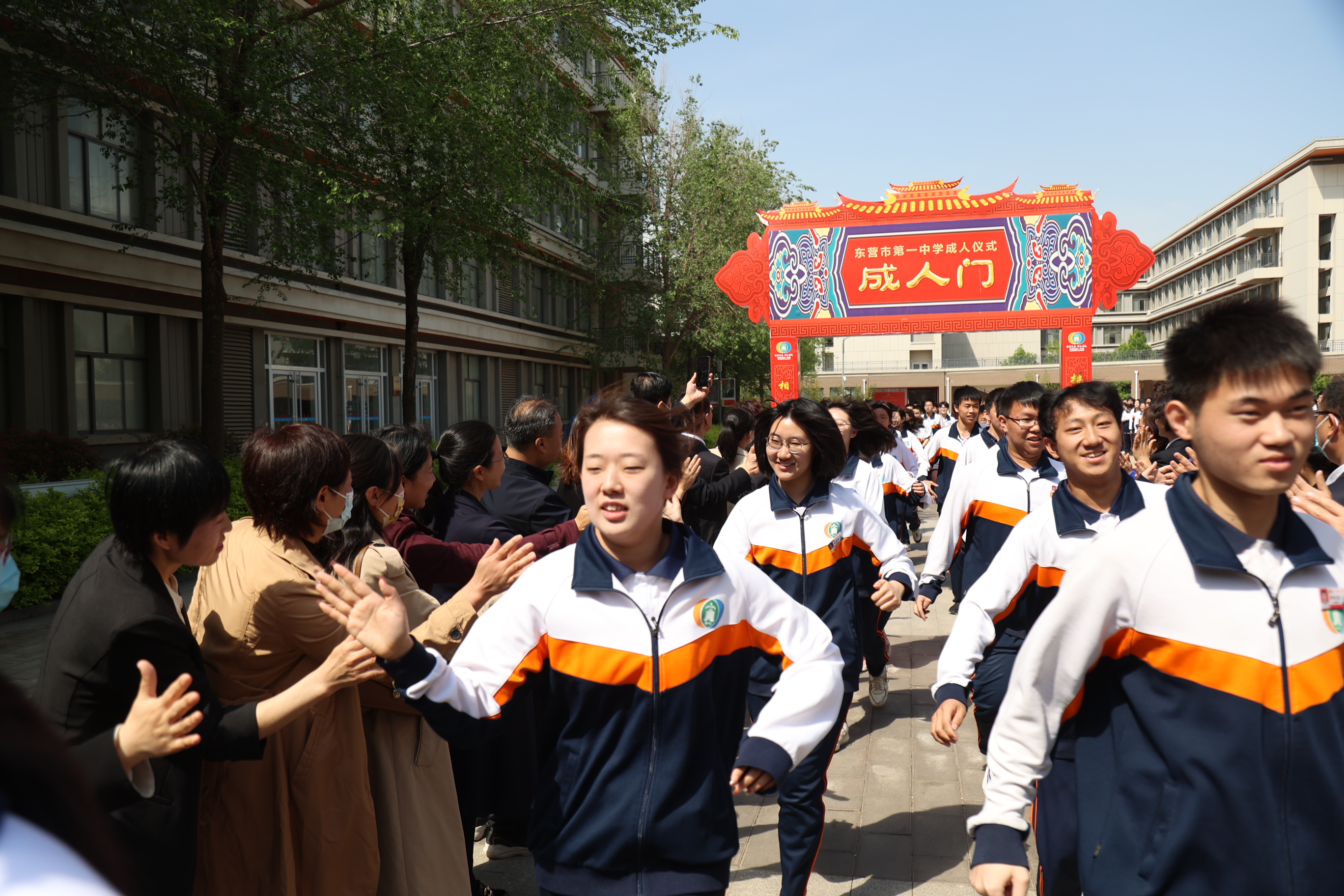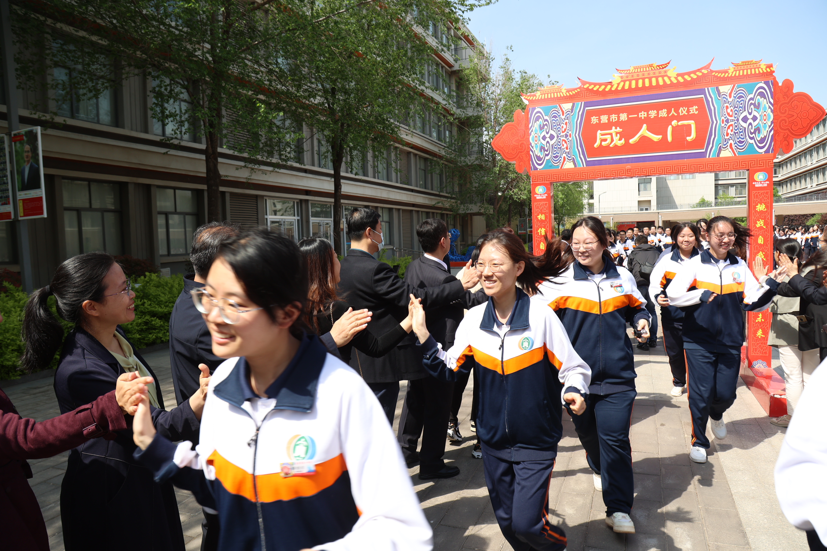 之后,同学们在师长们的注目下,带着沉甸甸的嘱托和祝福,激情奔跑,穿越成人门,与迎接他们成人的老师和家长一一击掌欢庆,昂首迈出了成人之路上坚实的第一步!