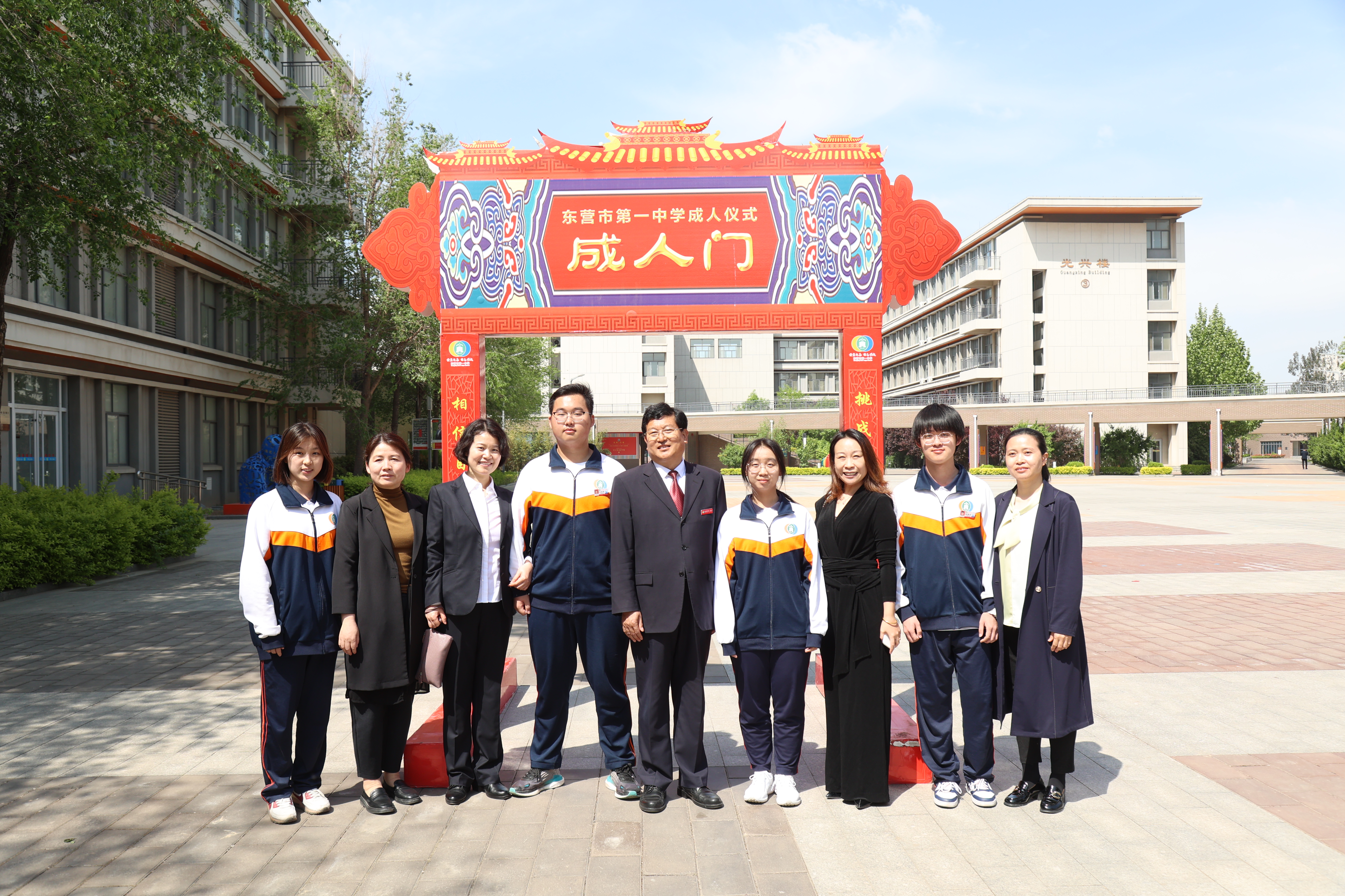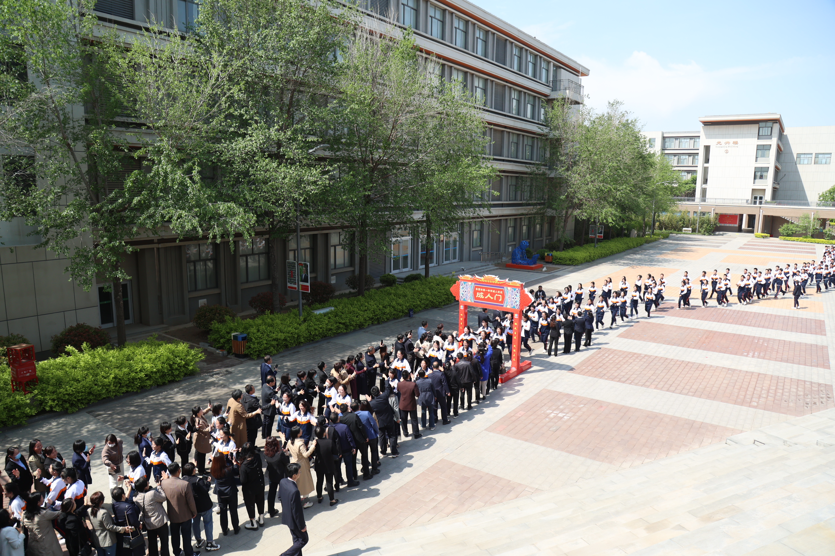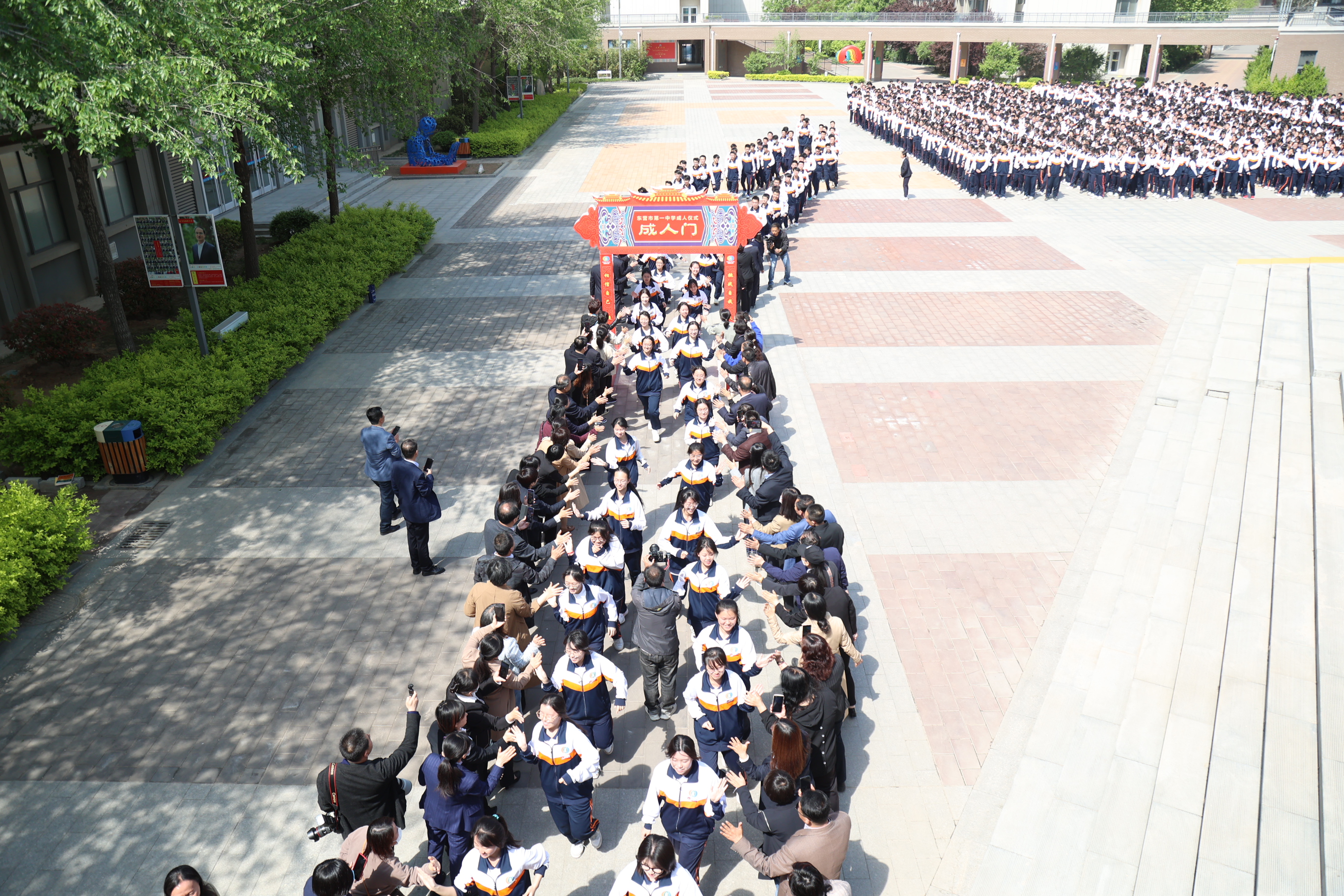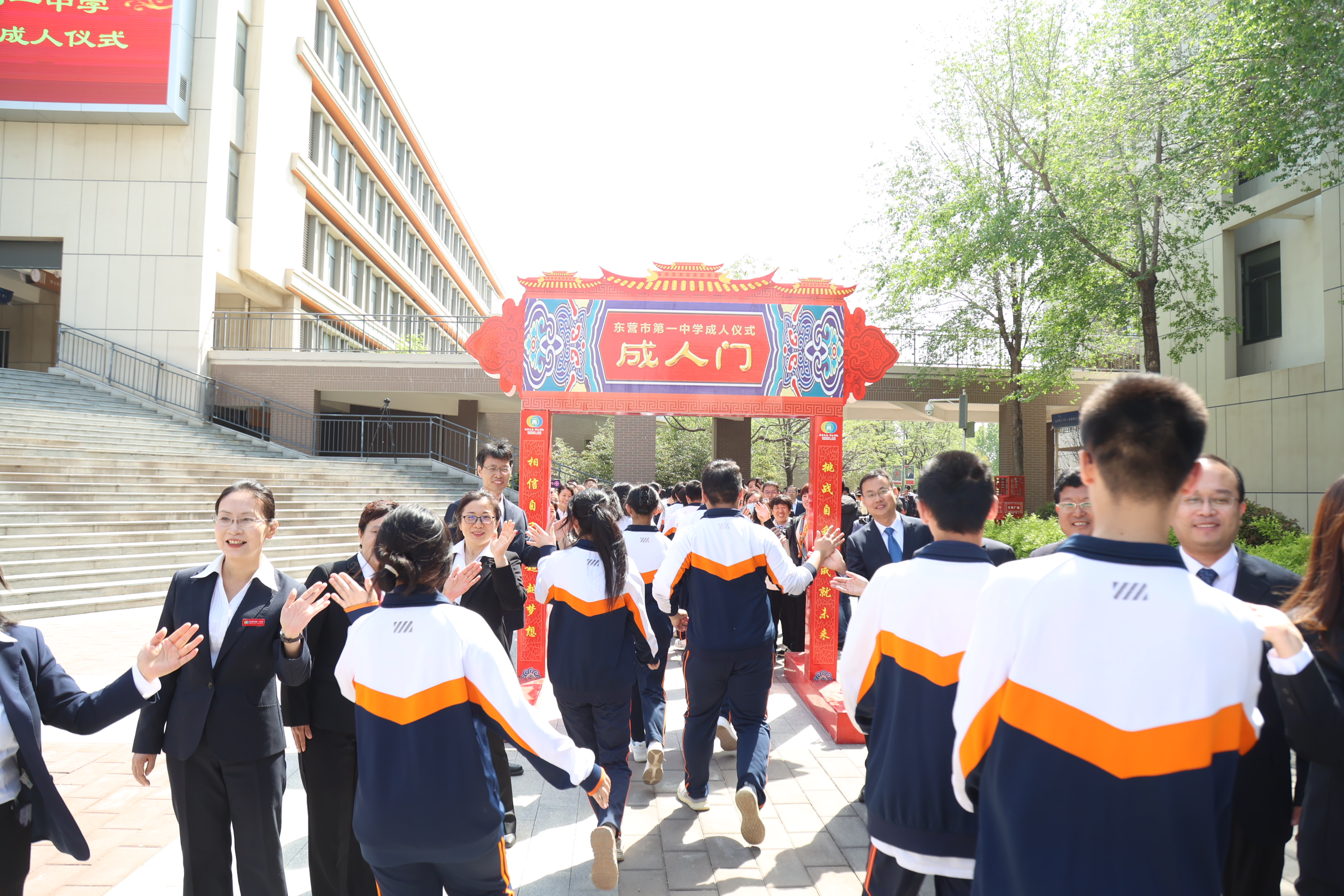 之后,同学们在师长们的注目下,带着沉甸甸的嘱托和祝福,激情奔跑,穿越成人门,与迎接他们成人的老师和家长一一击掌欢庆,昂首迈出了成人之路上坚实的第一步!