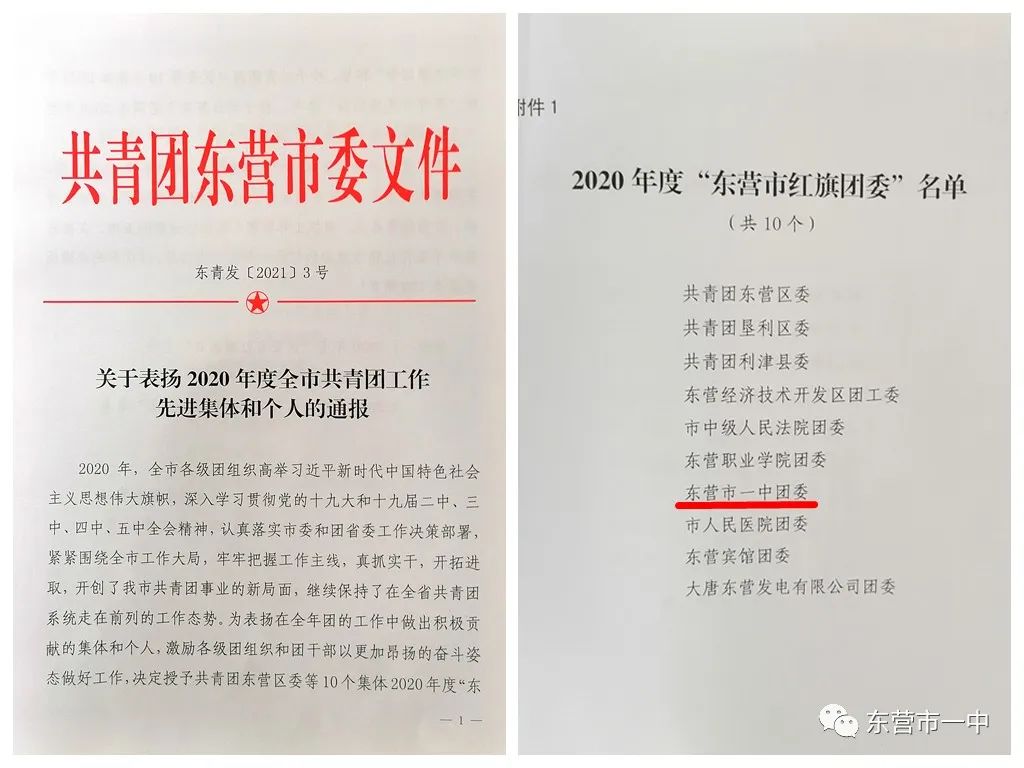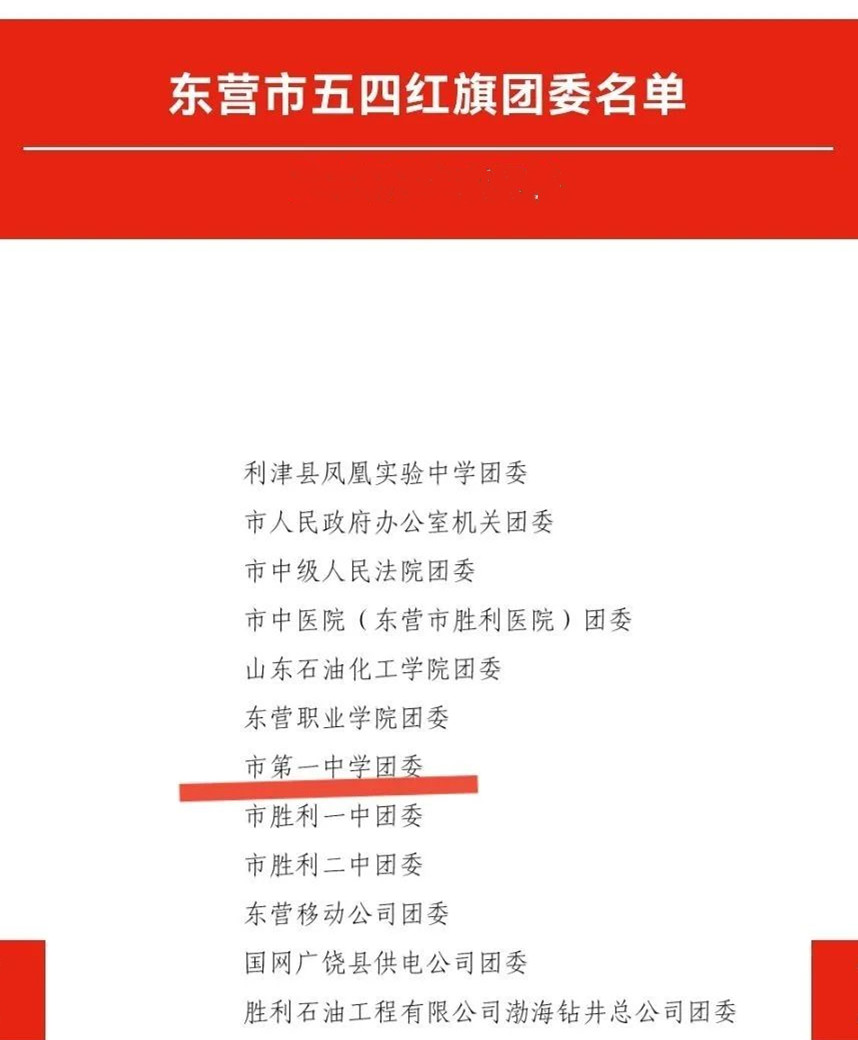 东营市一中团委被表彰为东营市五四红旗团委,毕玲玉老师被表彰为东营市优秀共青团干部,吴柏辰等4人被表彰东营市优秀共青团员。蔡佳彤等2人被表彰为东营市青年志愿服务先进个人。市一中团委书记丁子勇被表彰为全国优秀共青团干部。