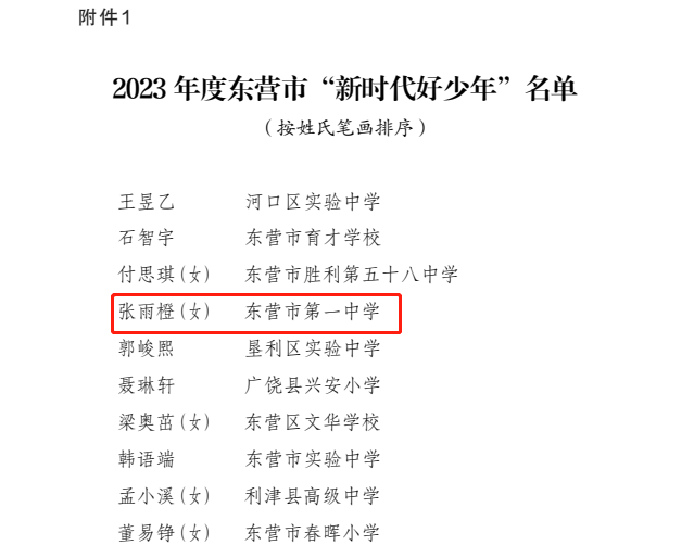 5月9日,东营市文明办、东营市教育局、共青团东营市委、东营市妇联、东营市关工委共同公布了东营市2023年度“新时代好少年”名单。东营市第一中学张雨橙同学获此殊荣。