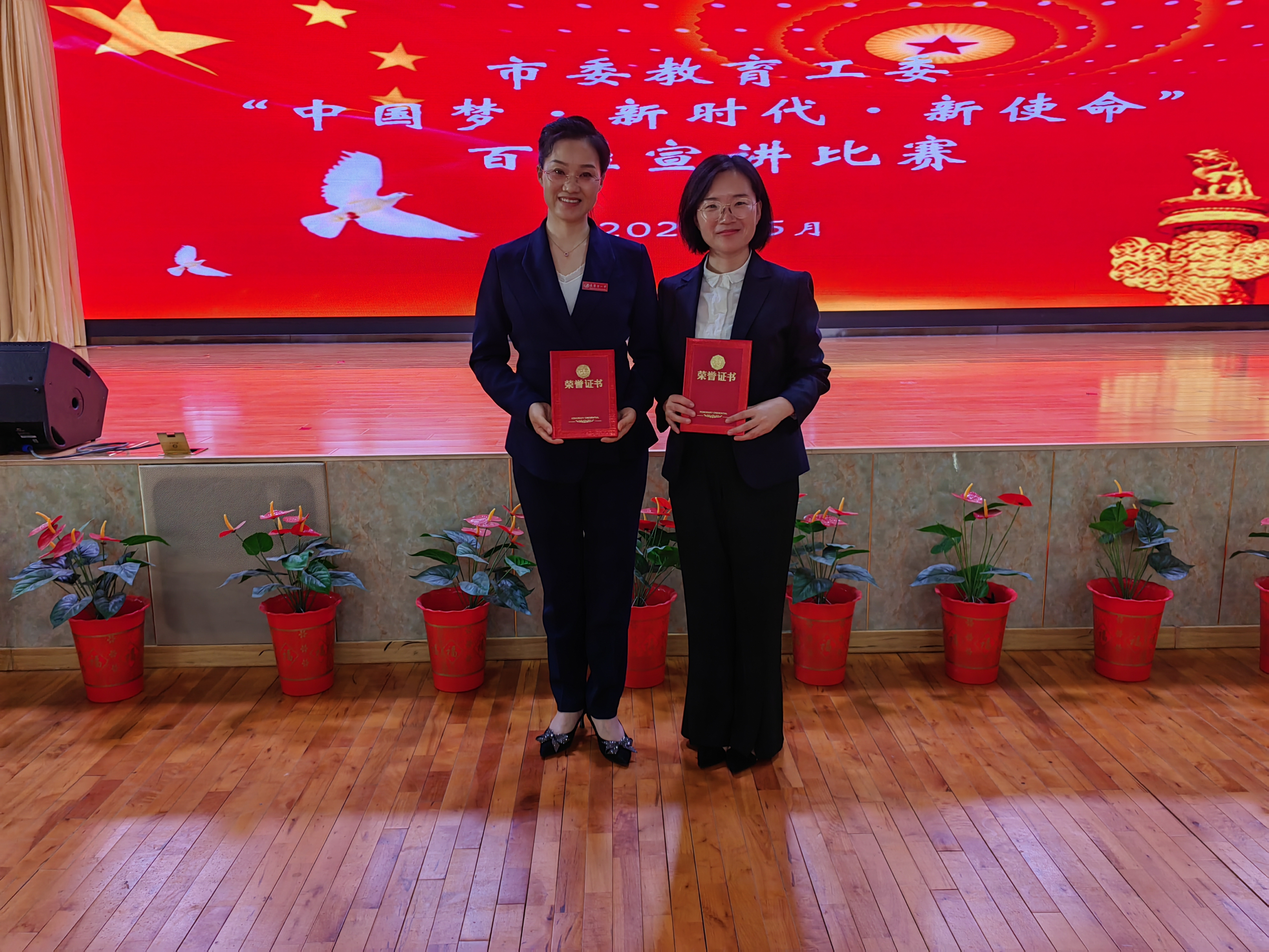 5月15日上午周会仪式上,学校对两位获奖老师进行表彰,史本泉校长亲自为她们颁奖。