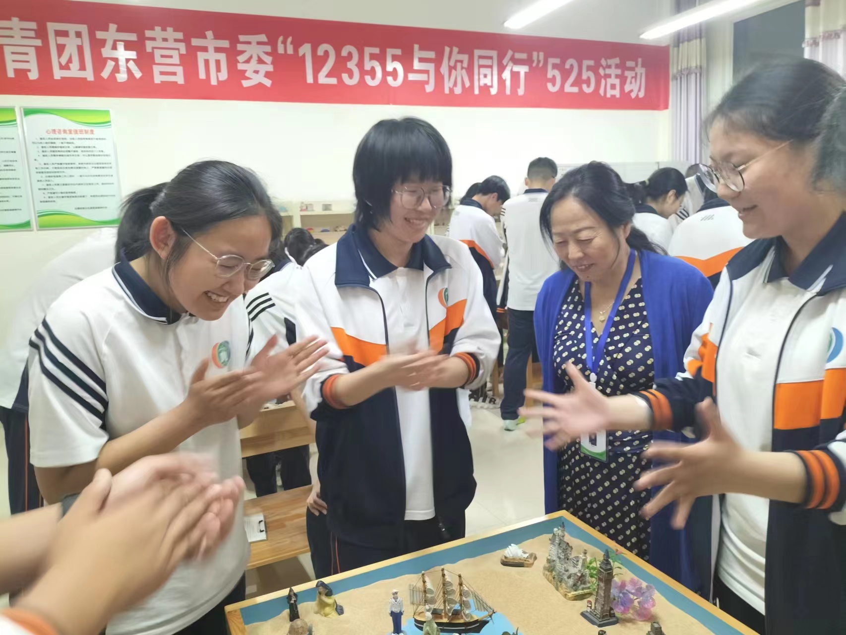 5月25日晚,心指中心和共青团东营市委联合举行了“12355与你同行活动”,邀请国家二级心理咨询师王翠华老师和国家二级心理咨询师翟春芳老师分别为 “班级心理委员”开展了 “团体心理辅导”和“团体沙盘”的体验和培训活动。心理委员,作为同学的知心伙伴、心理老师的小助手、学校的心理观察员,他们必将为东营市一中的心理健康工作贡献自己的力量,助人自助,相信心理委员们在帮助同学们提升心理健康水平的同时,自身一定得到更好更快的提升!