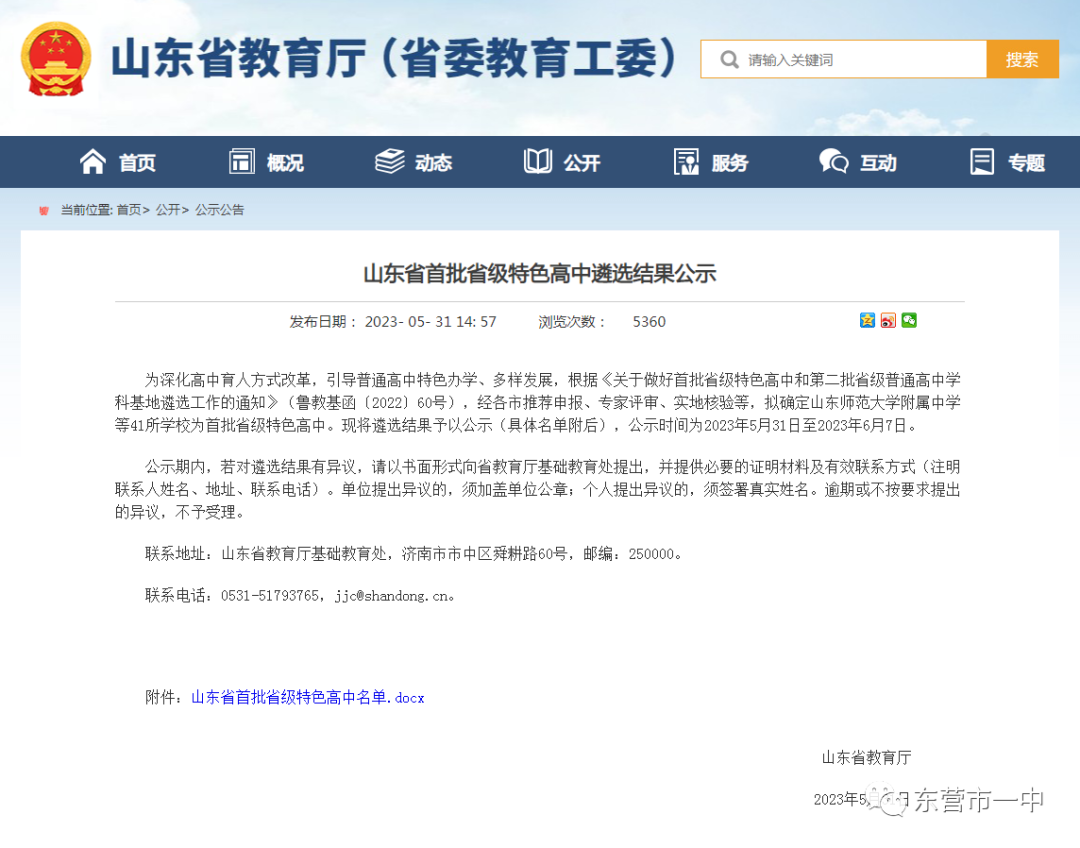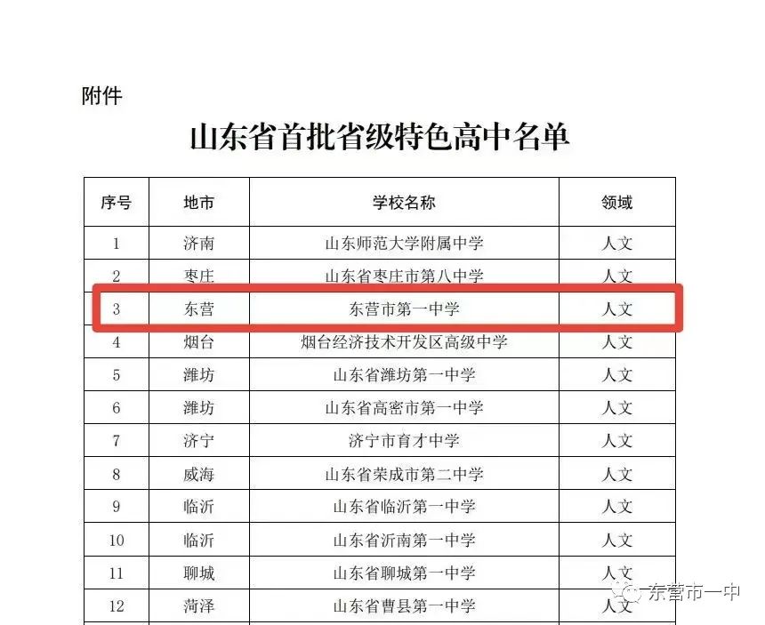 近日,山东省教育厅公布了山东省首批省级特色高中遴选结果,确定41所学校为首批省级特色高中。东营市第一中学成功入选。凭借在人文领域方面的学科特色,市一中经过市里推荐申报,顺利通过专家评审、实地核验,最后被遴选确定为山东省首批省级特色高中。