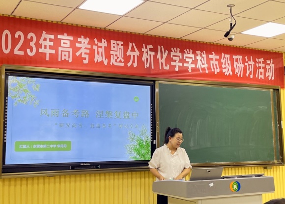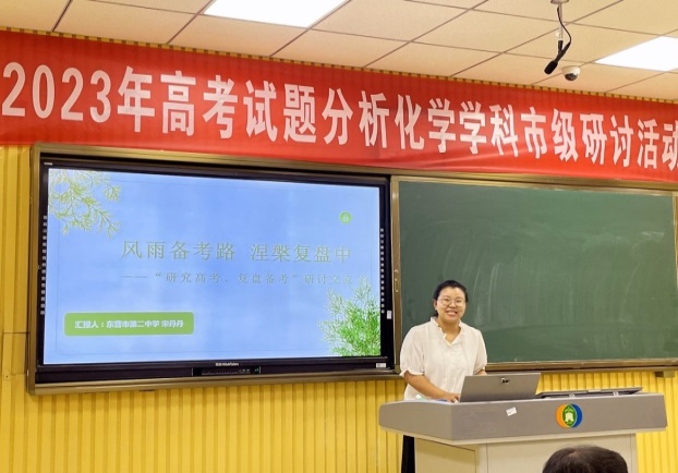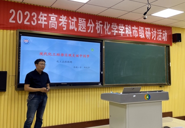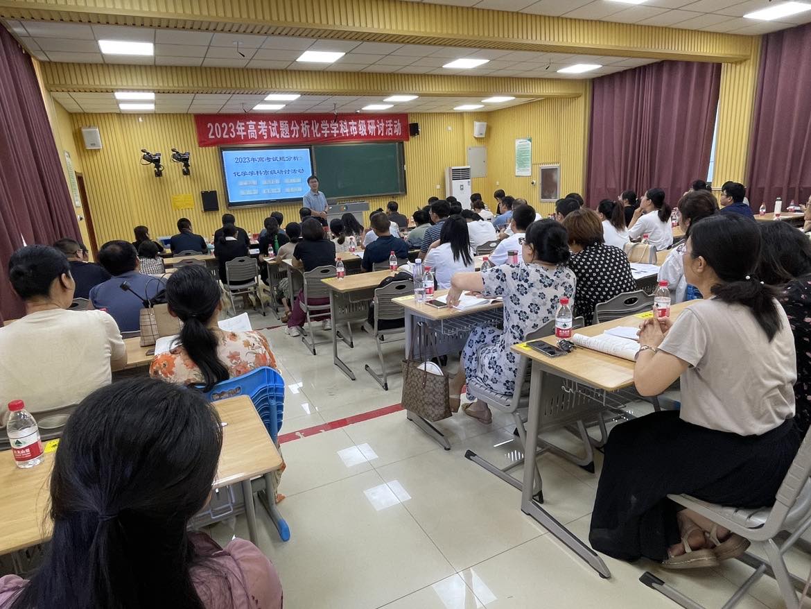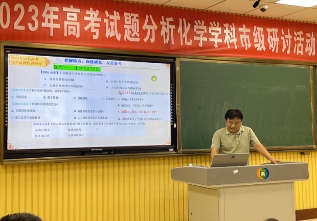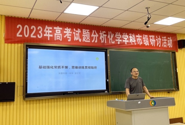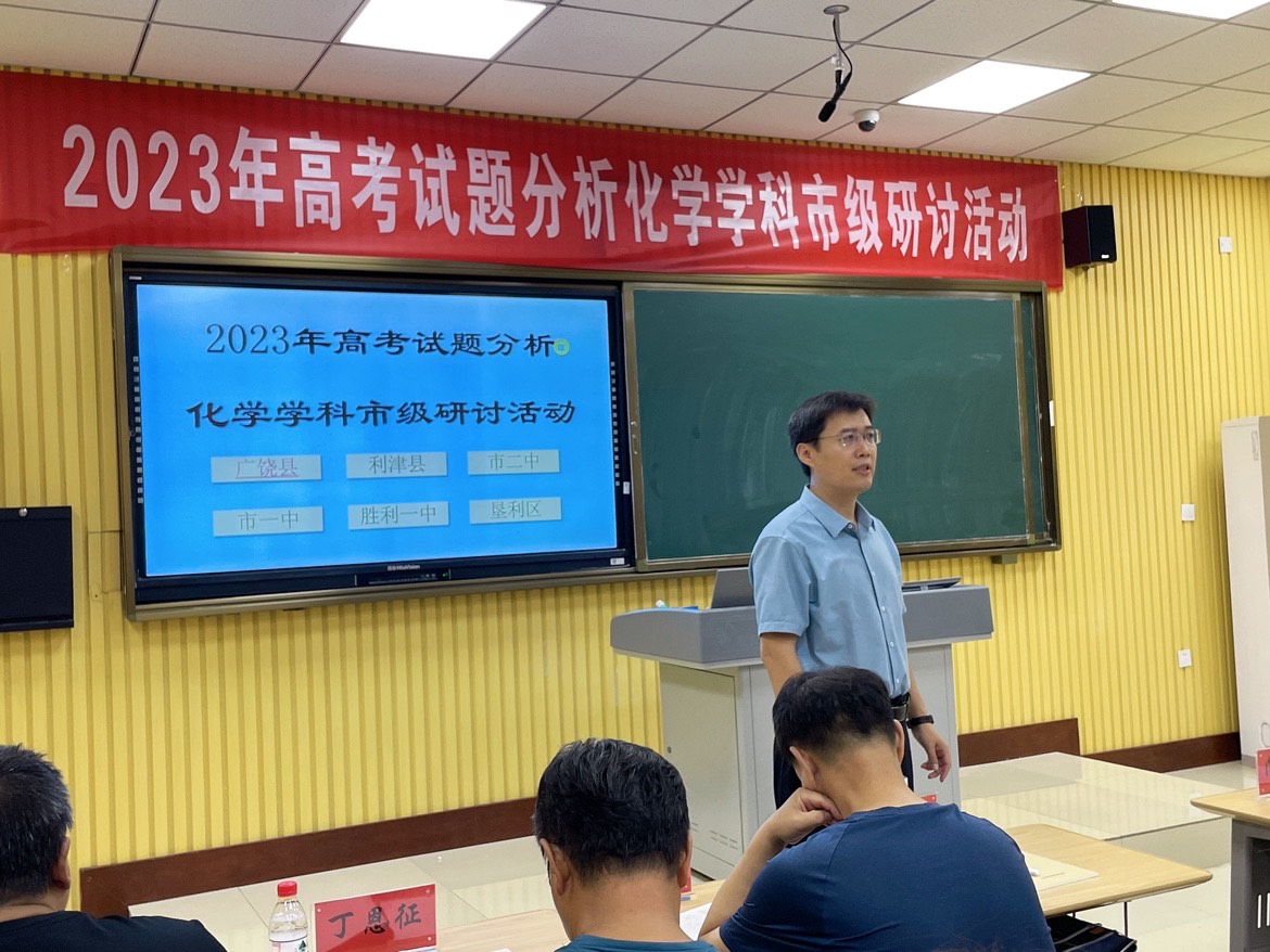 新高考迎来新挑战、新学年开启新征程,为全面有效把握新高考动向,进一步提升东营市高中化学教师专业理论水平和教育实践能力,让教学更有目的性和前瞻性,有的放矢的对高考重难点进行突破,提高教师们解题做题讲题的能力,打造一支爱岗敬业、业务精湛的高中化学教师队伍,2023年7月17日东营市高中化学骨干教师和我校全体化学教师齐聚一堂,在东营市一中录播室开展了“2023年高考试题分析化学学科市级研讨活动”活动。市一中化学教研组长董老师带领全校化学教师参加了此次研讨会。