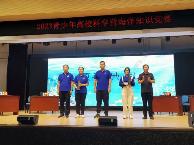 紧接着我们乘车回到崂山校区准备晚上的海洋知识竞赛。竞赛共设置“闪亮登场”“旗开得胜”“狭路相逢”“巅峰对决”四个环节,每队初始分数为 200 分。由来自东营市第一中学的陈一诺同学、巩留硕同学和费县一中陈萌萌同学组成的“沂”定能“营”队经过四轮激烈比拼,凭借扎实的知识储备、良好的心理素质和赛场上随机应变能力,一路过关斩将,在观众的欢呼声中笑到了最后,最终夺得桂冠!