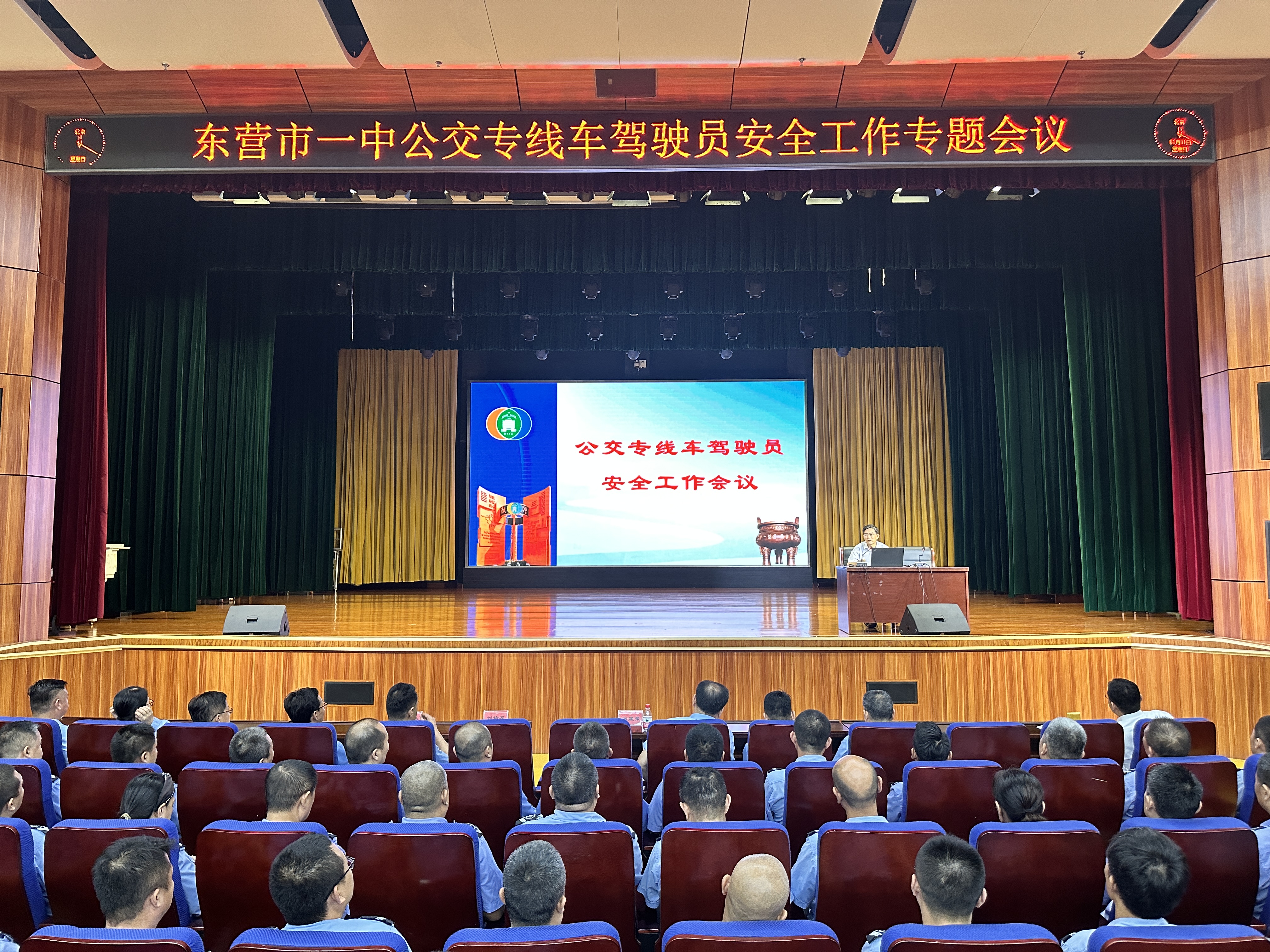 为确保公交专线车安全运行,保证学生上学、放学乘车安全和校园交通安全,东营市一中和东营市公共交通集团有限公司于9月3日晚在学校报告厅召开了公交专线车驾驶员安全工作专题会议。市一中党委副书记、副校长刘培友,副校长赖声平以及公共交通集团有限公司副经理景洪培、业务科科长张星聚、安全科科长王勇和51名驾驶员、车队队长参加了会议。会议由学管处主任董海峰主持。