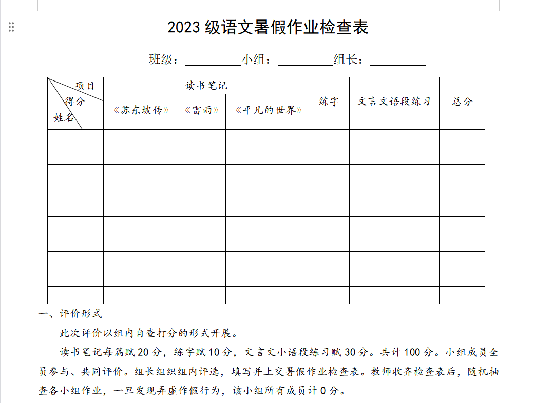 此次评比以学生组内自查打分的形式开展。评比标准包括作业完成情况、书写工整度、正确率等,组长组织组内评选,小组成员全员参与、共同评价,每个小组的学生先对所选取的作业进行独立评分,然后小组内部进行讨论,对每个评分项达成一致意见,填写并上交暑假作业检查表。读书笔记每篇赋20分,练字赋10分,文言文小语段练习赋30分,共计100分。教师收齐检查表后,随机抽查各小组作业,并对每个小组的评分进行审核,确保评分的公正性和准确性。