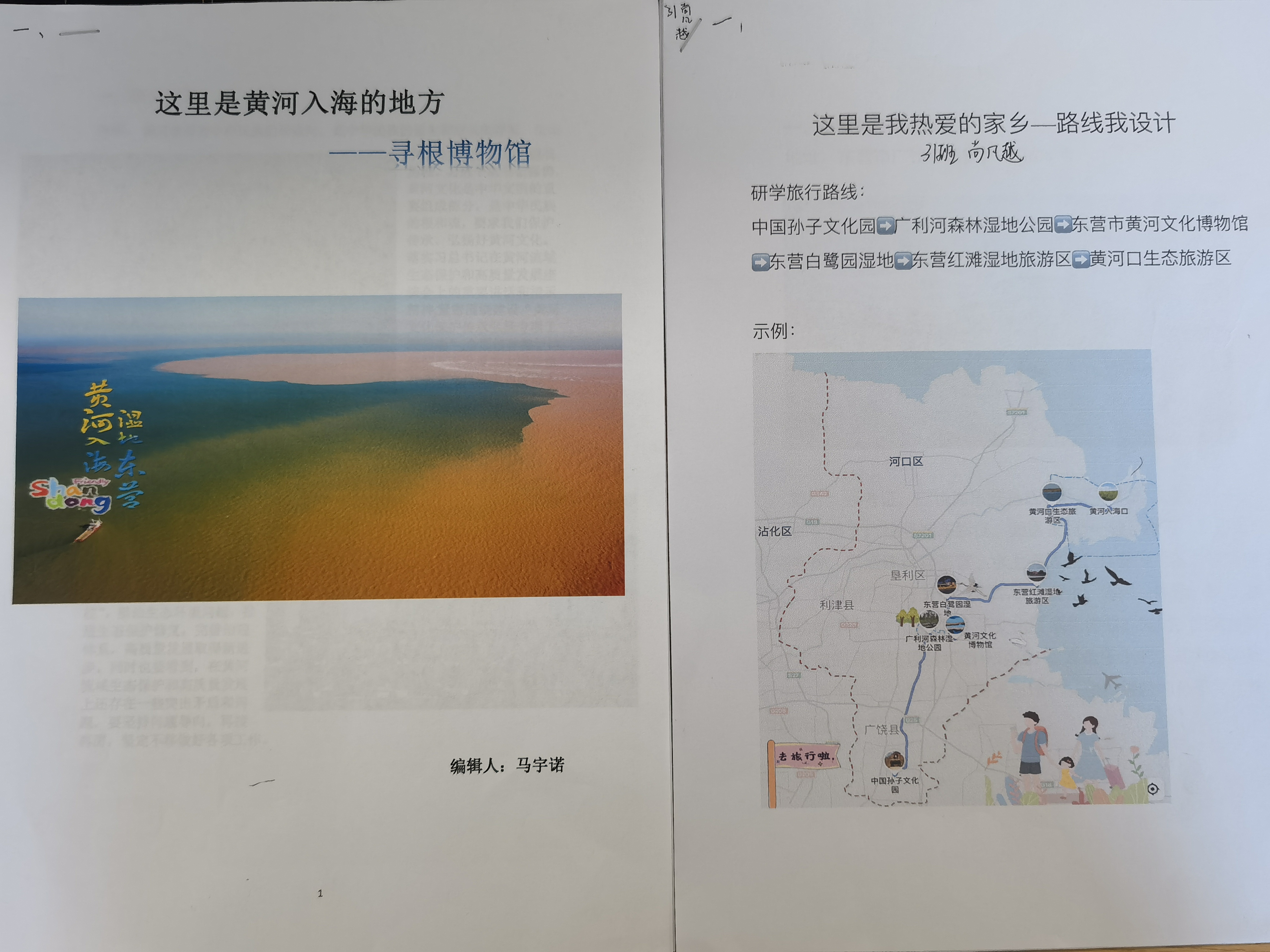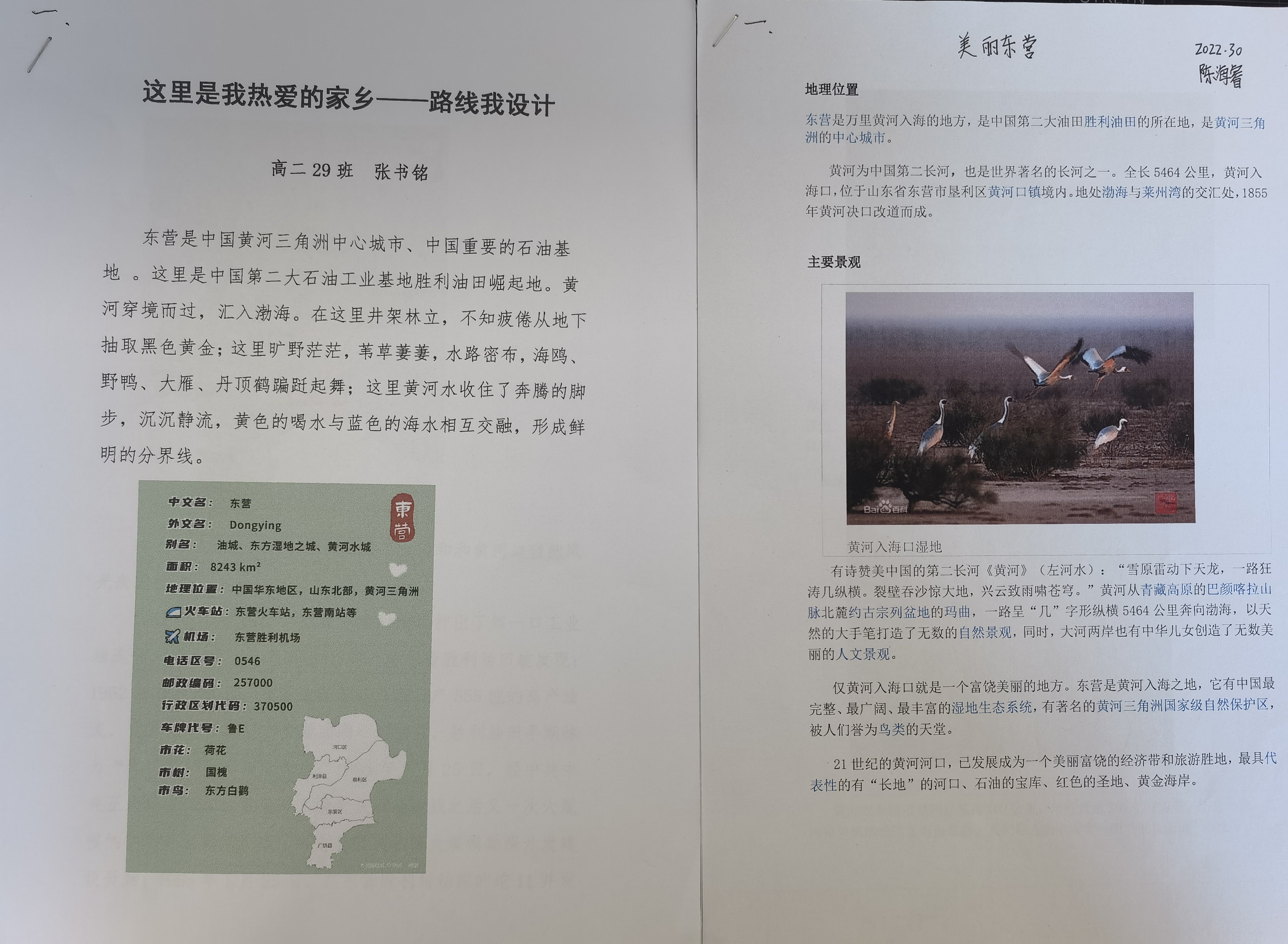 在《这里是我的家乡——路线我设计》主题活动中,来自2022级29班的任昱颖、31班的尚凡越,他们结合东营的自然风光与风土人文,给出了不同的答案。尚凡越同学以自然风光为侧重点,将东营的广利河森林湿地公园、白鹭园湿地、红滩湿地、黄河口生态旅游区做了重点介绍,旖旎风光引人心生向往。任昱颖同学则以风土人文为侧重点,对黄河文化博物馆、孙子文化旅游区、天宁寺、刘集红色旅游区的文化背景做了记述,厚重底蕴使人心向往之。