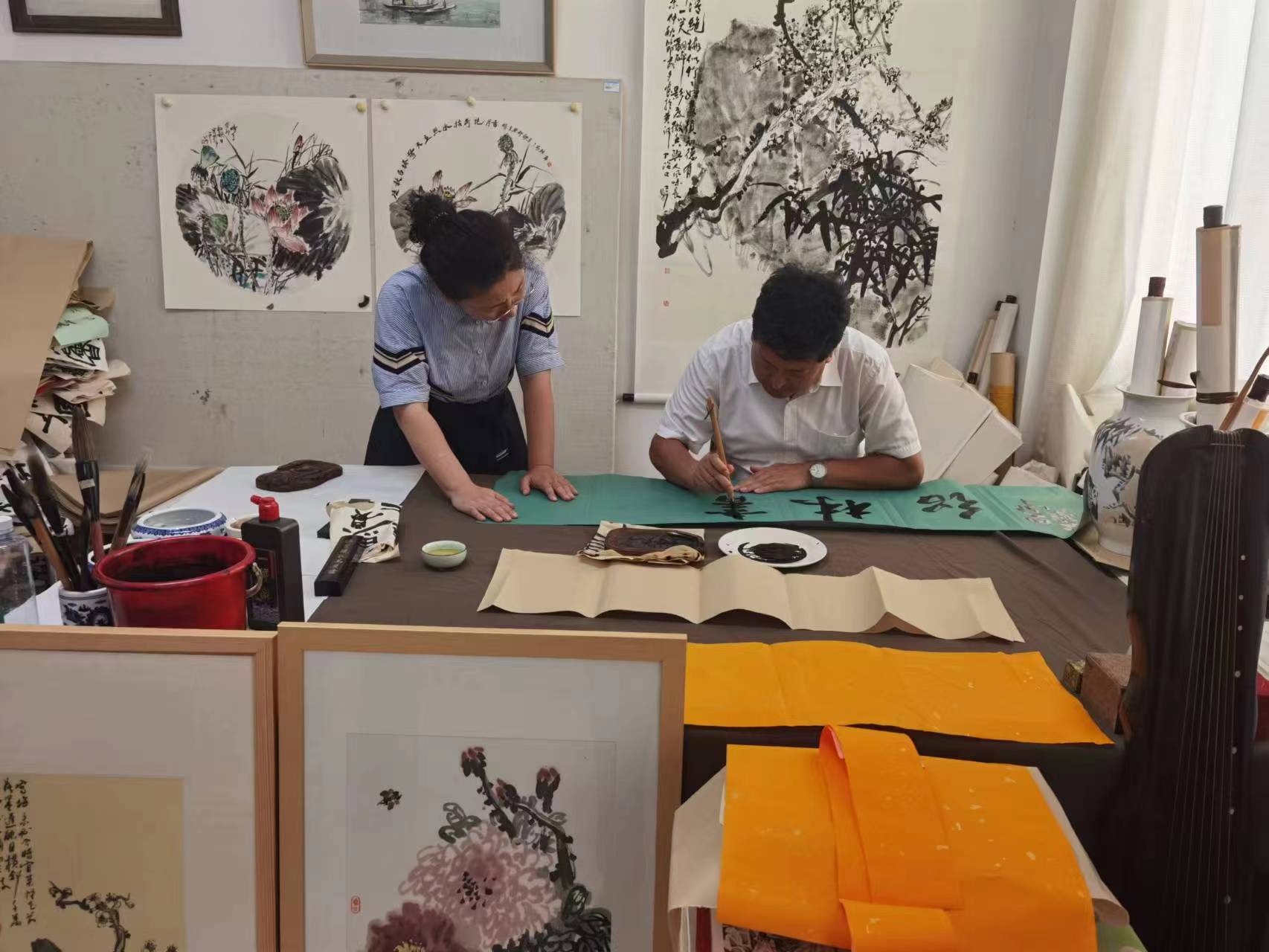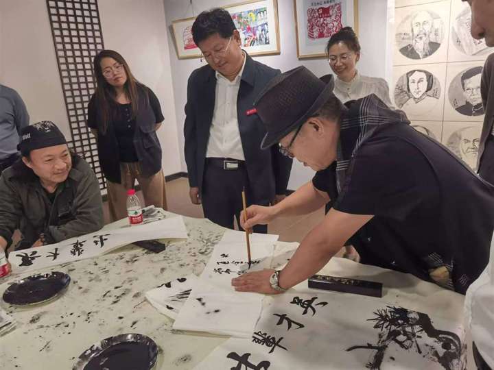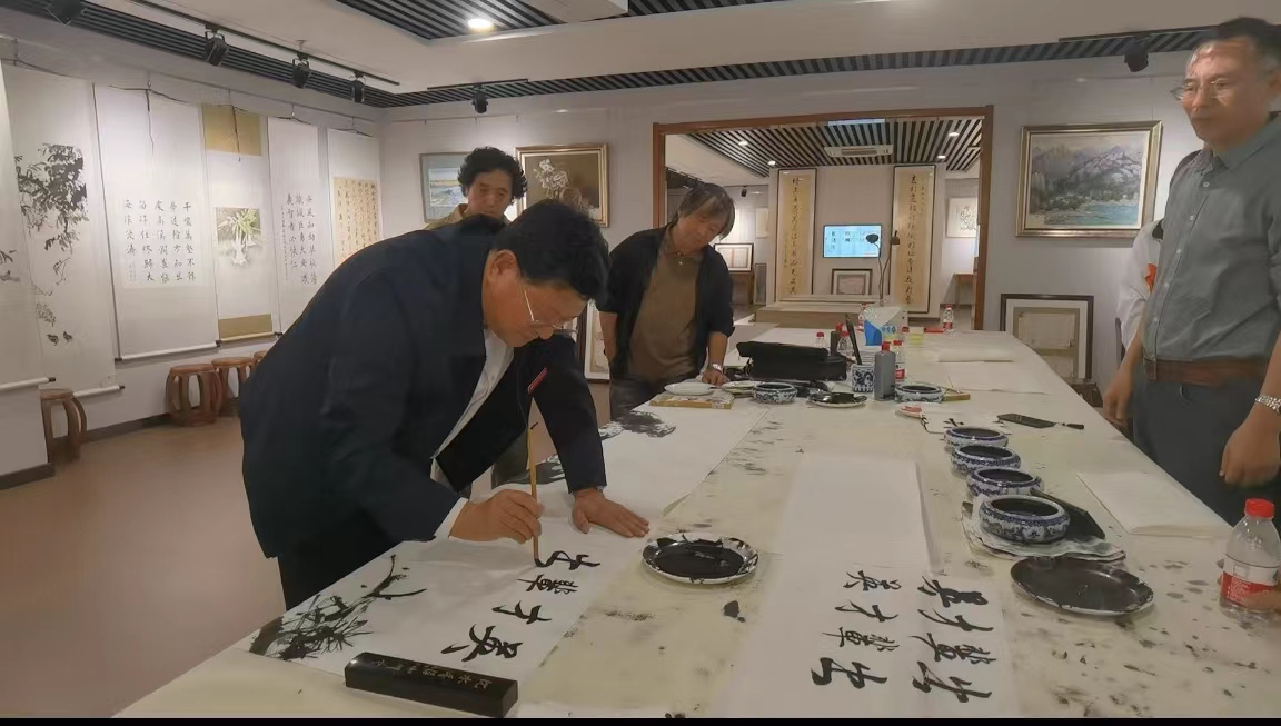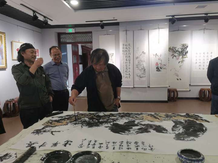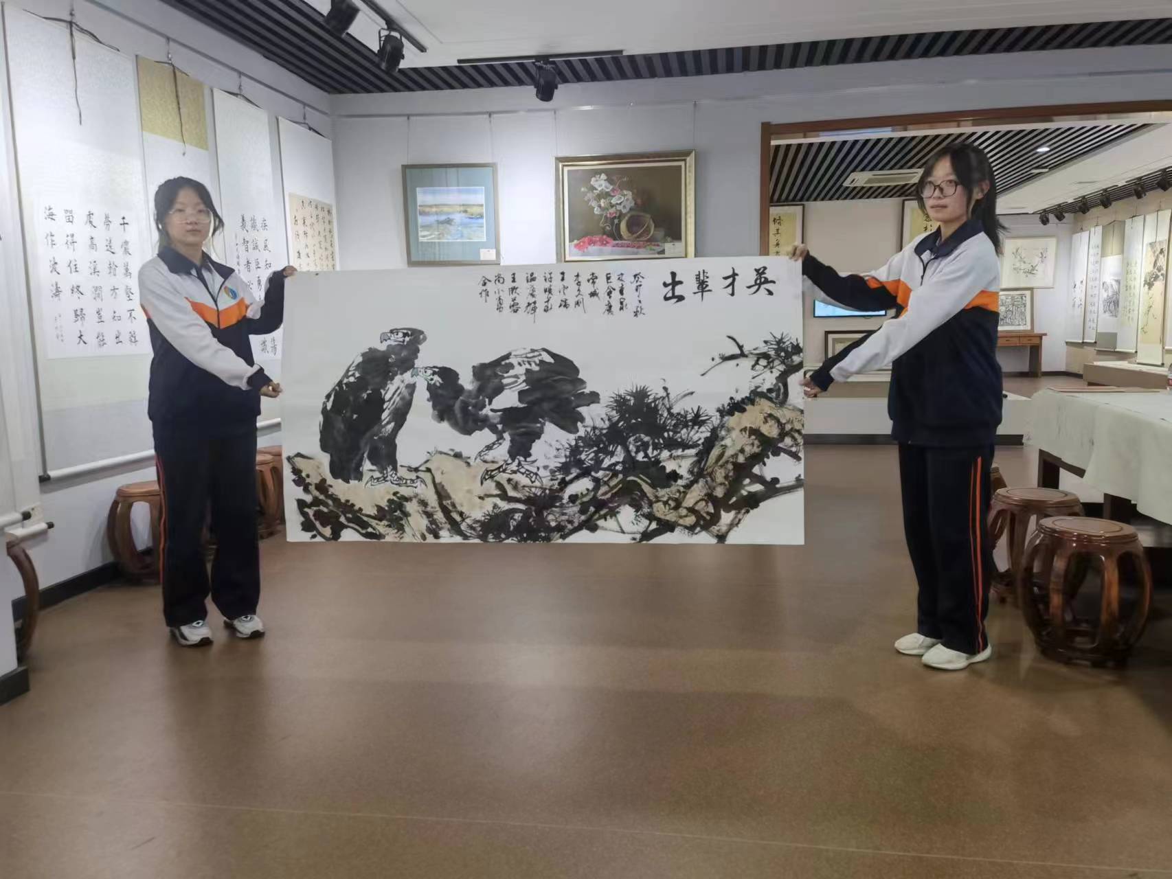 之后,嘉宾们来到学校艺术馆参观,并现场进行了笔会。著名国画家李久刚首先开笔,只见他大笔浓墨勾勒出两只雄鹰的轮廓,又以狼毫小笔画出鹰的嘴、眼和利爪。两只雄鹰一站一卧,相互错落,锐眼凝视远方,棱角分明坚毅的喙,深邃洞穿一切的眼睛,锋芒凌厉展露的气势,威猛飒爽的英姿,似有穿云破雾的强大本领,给人以博大胸怀、志向高远、傲视群雄的感受。市美协主席团成员、著名国画家许晓华以长锋大笔画出松杆、松针,将松树的苍茫挺拨,坚韧不屈表现得淋漓尽致。接下来,各位嘉宾分别挥毫泼墨对画作进行渲染,最后史本泉校长执笔为画作题款:英才辈出。寓意我校在教书育人方面硕果累累,英才辈出,寓意大美一中教育事业蒸蒸日上。