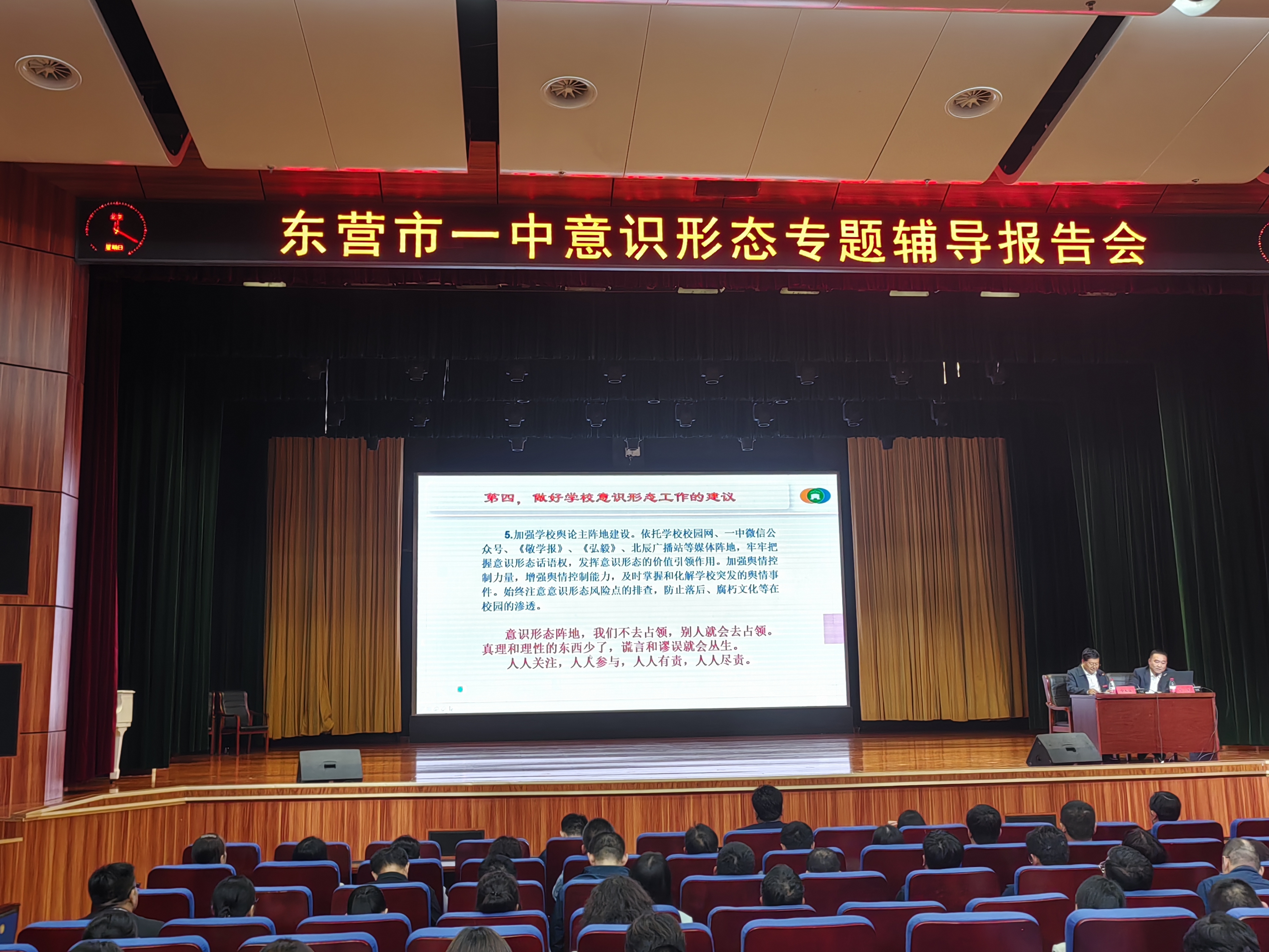 10月30日,东营市一中意识形态专题辅导报告会在道德讲堂召开。高二年级部主任、政治教师李中刚作《转型下的中国社会与国家意识形态安全》专题报告,党委书记、校长史本泉主持会议,学校领导班子、中层干部和全体教职工参加报告会。