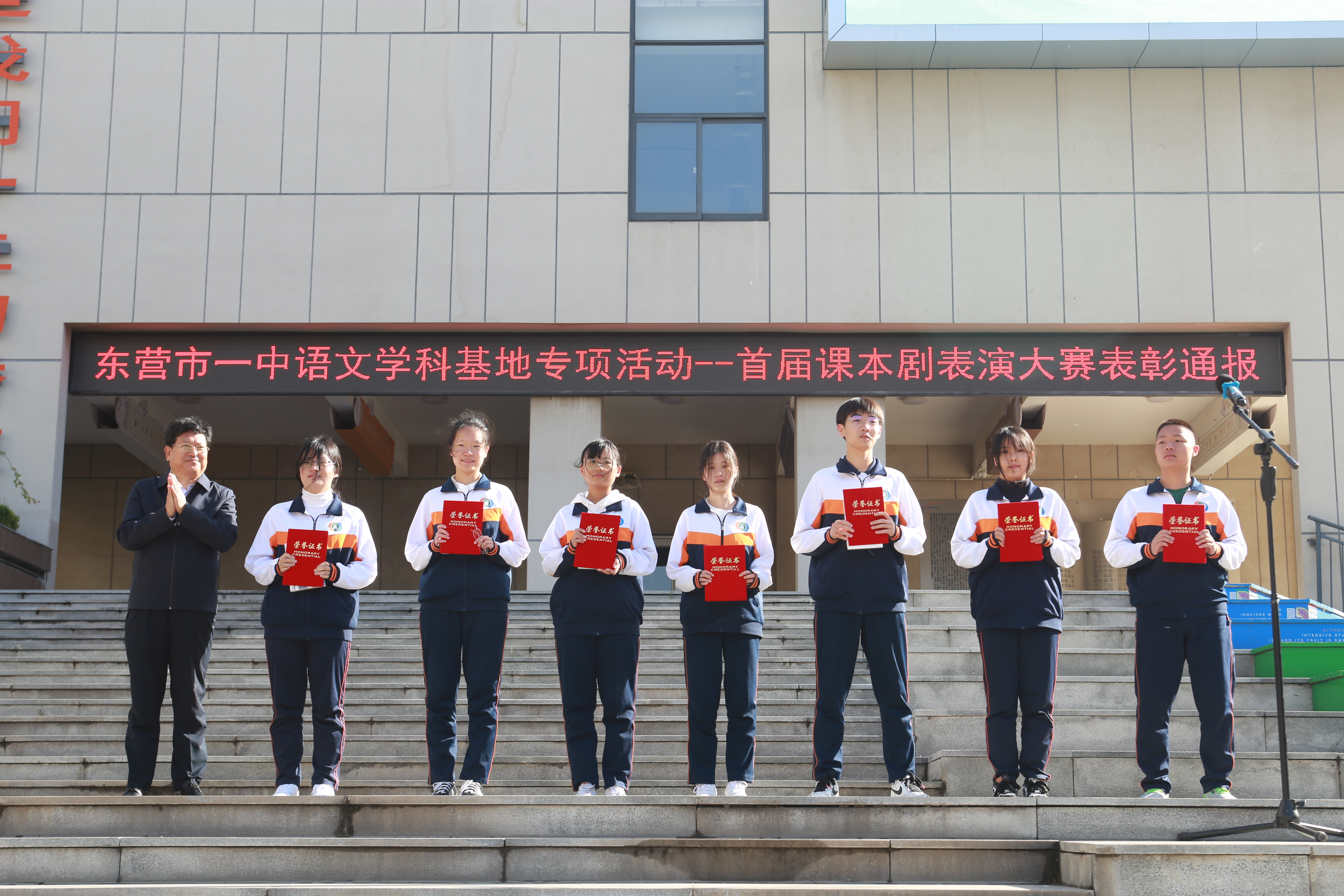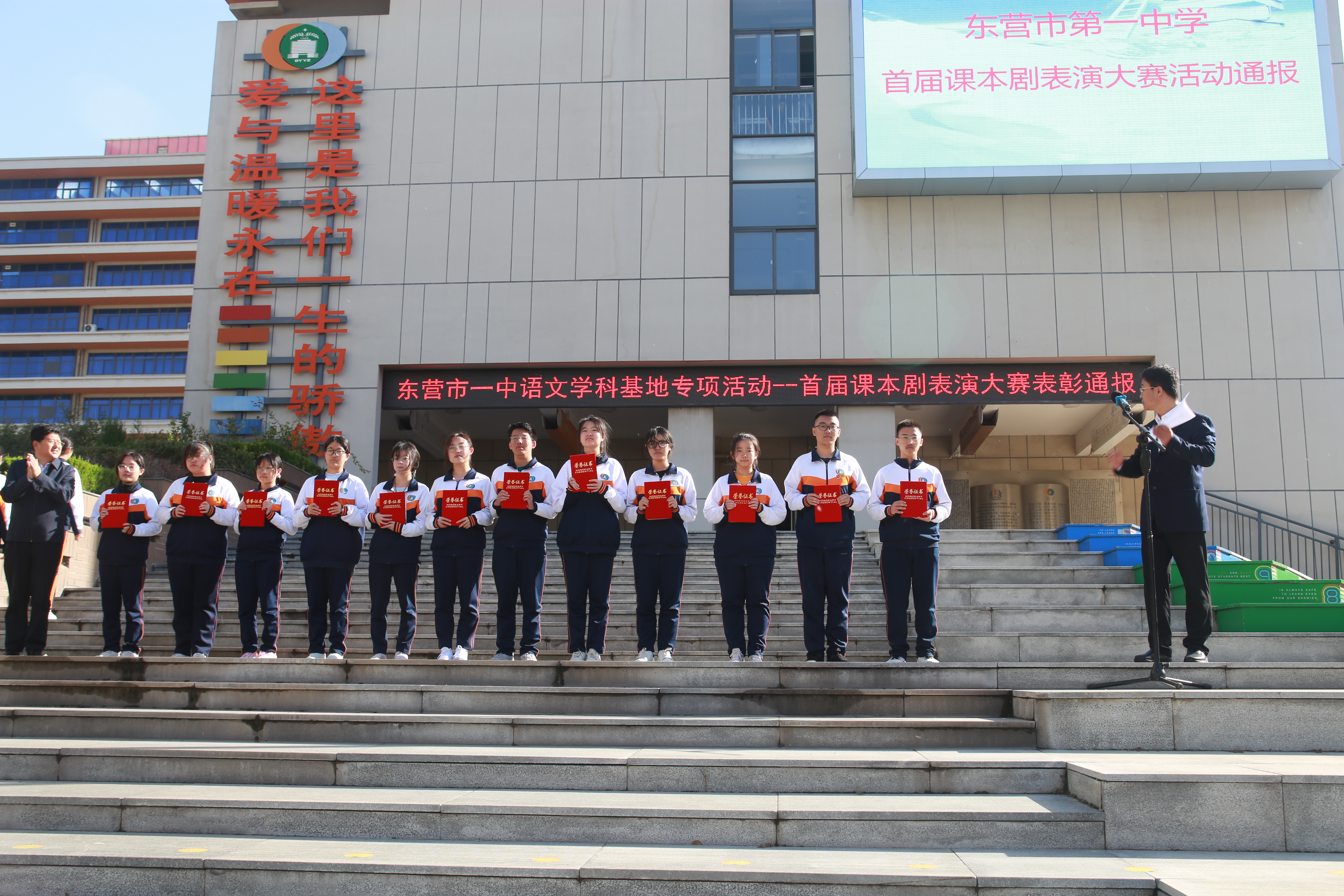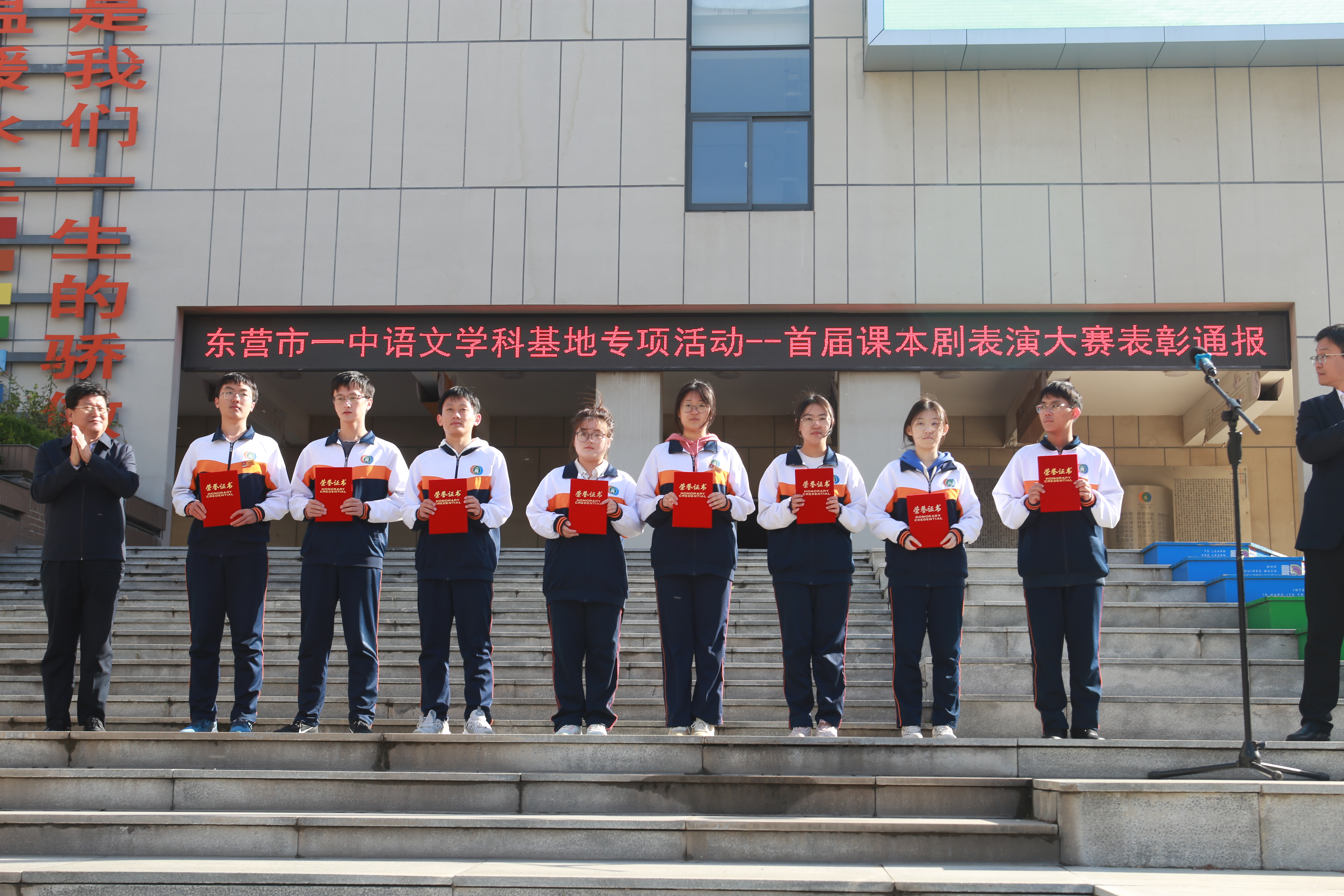 在学校升旗仪式上,史本泉校长为获奖师生进行了颁奖。至此,市一中课本剧展演活动圆满结束。