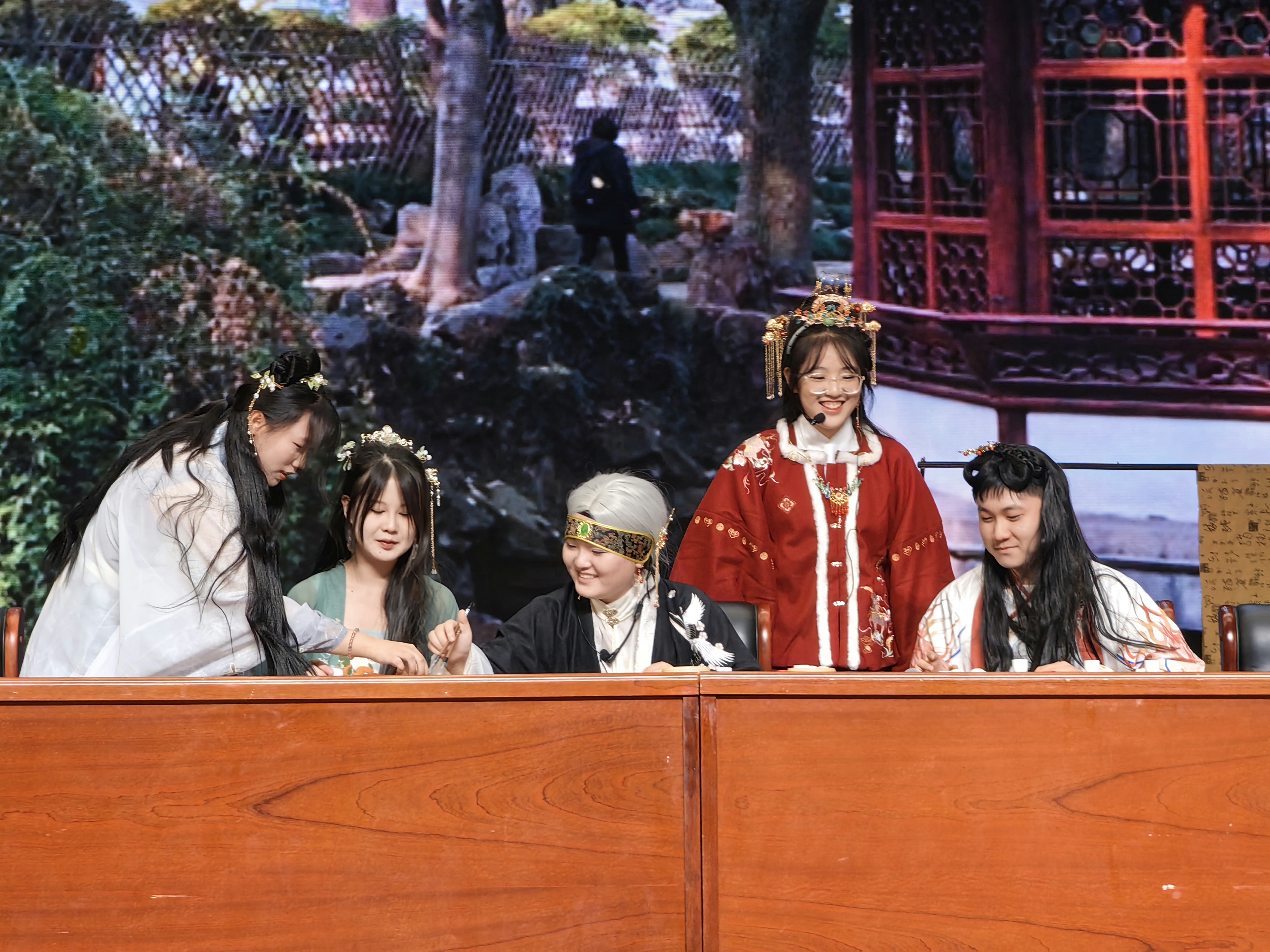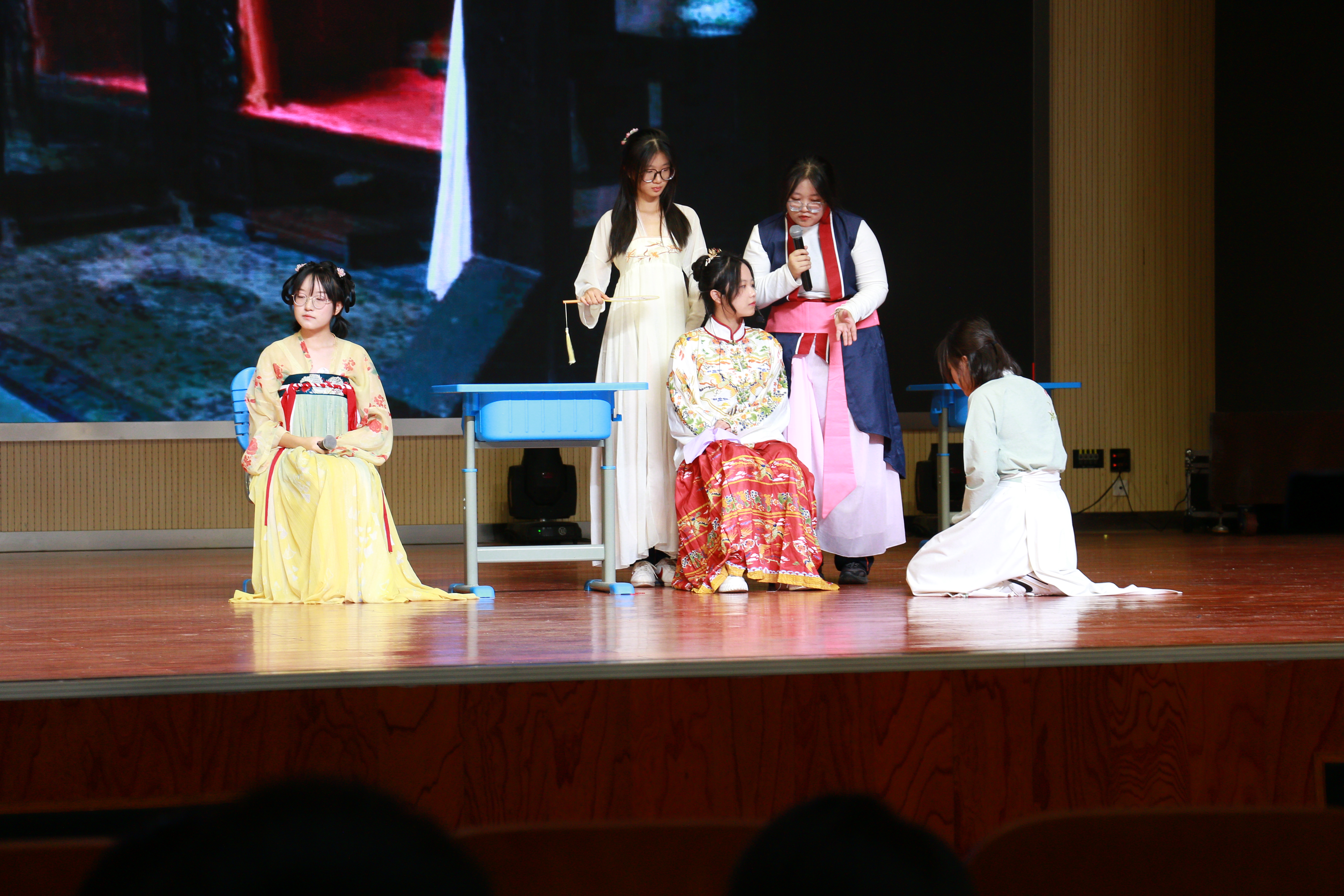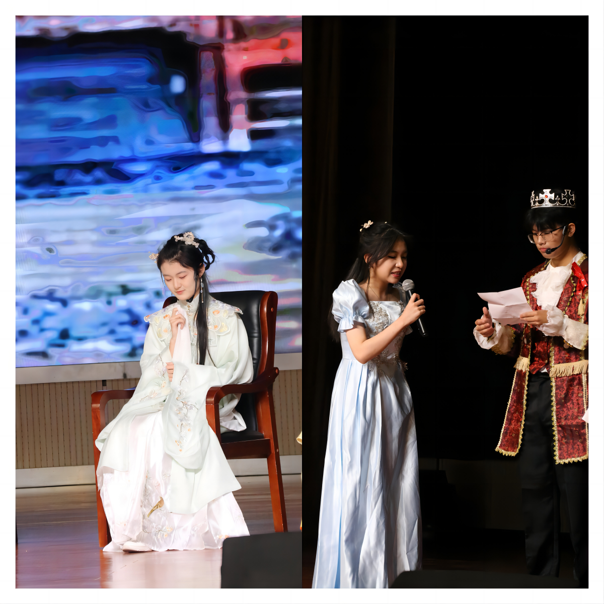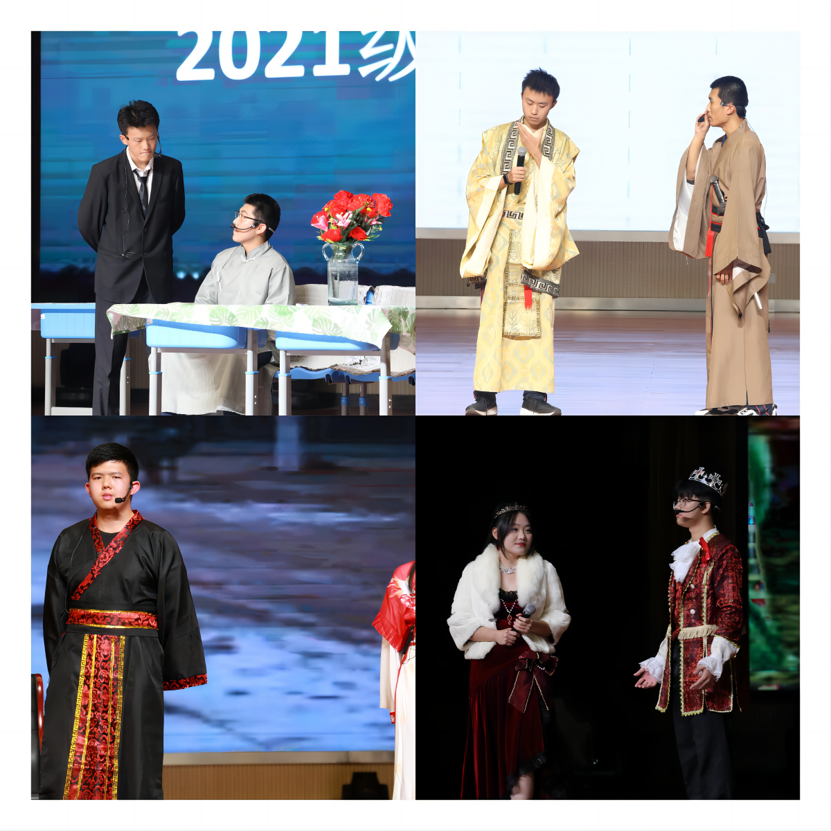 在2021级语文老师的精心指导下,同学们从语文课本认真挑选剧目,通过深度研读与创新性改编,最终在舞台上演绎出了一幕幕视听盛宴。剧目的排练、服装的挑选、道具的准备、台词的打磨和背景音乐的制作,无一不浸润着学生们的辛勤汗水与语文素养。