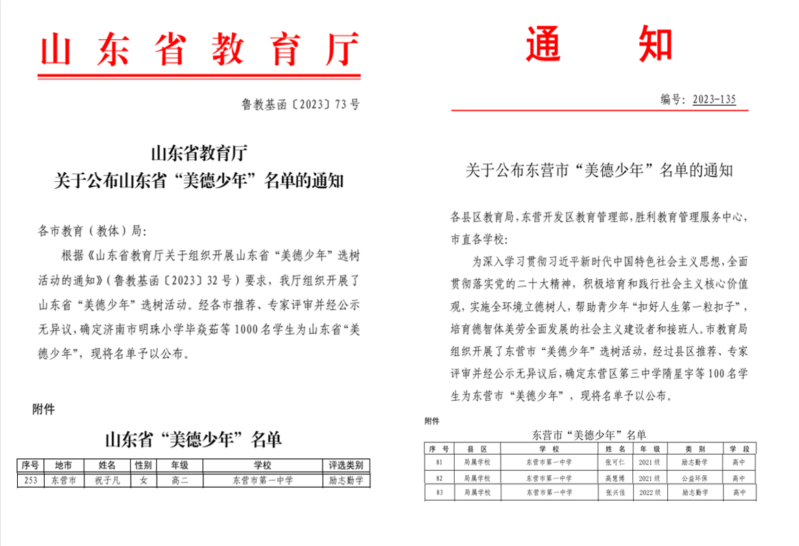近日,我校4名同学分别荣获山东省“美德少年”、东营市“美德少年”荣誉称号。其中高二年级祝子凡同学荣获山东省“美德少年”荣誉称号,高三年级张可仁同学、高慧博同学、高二年级张兴佳同学荣获东营市“美德少年”荣誉称号。