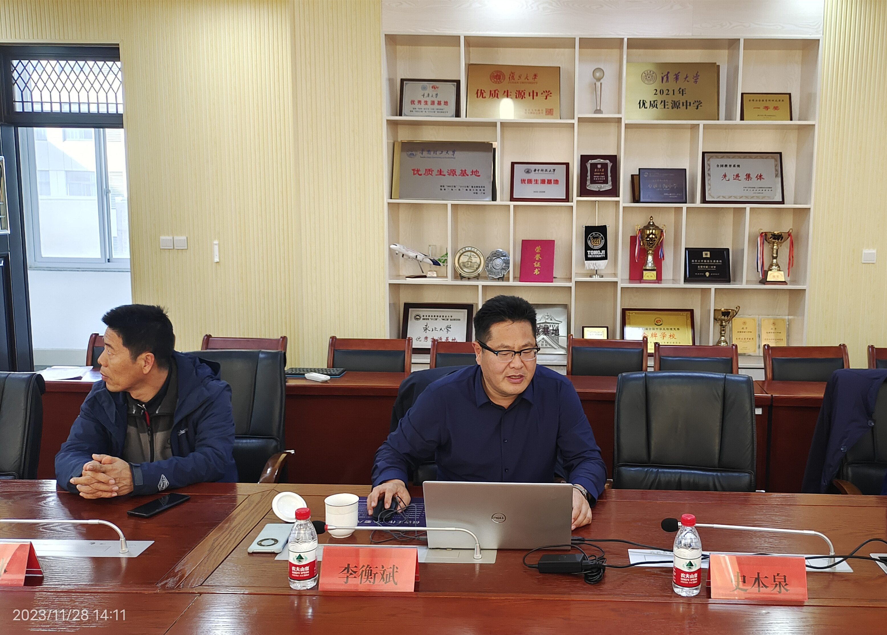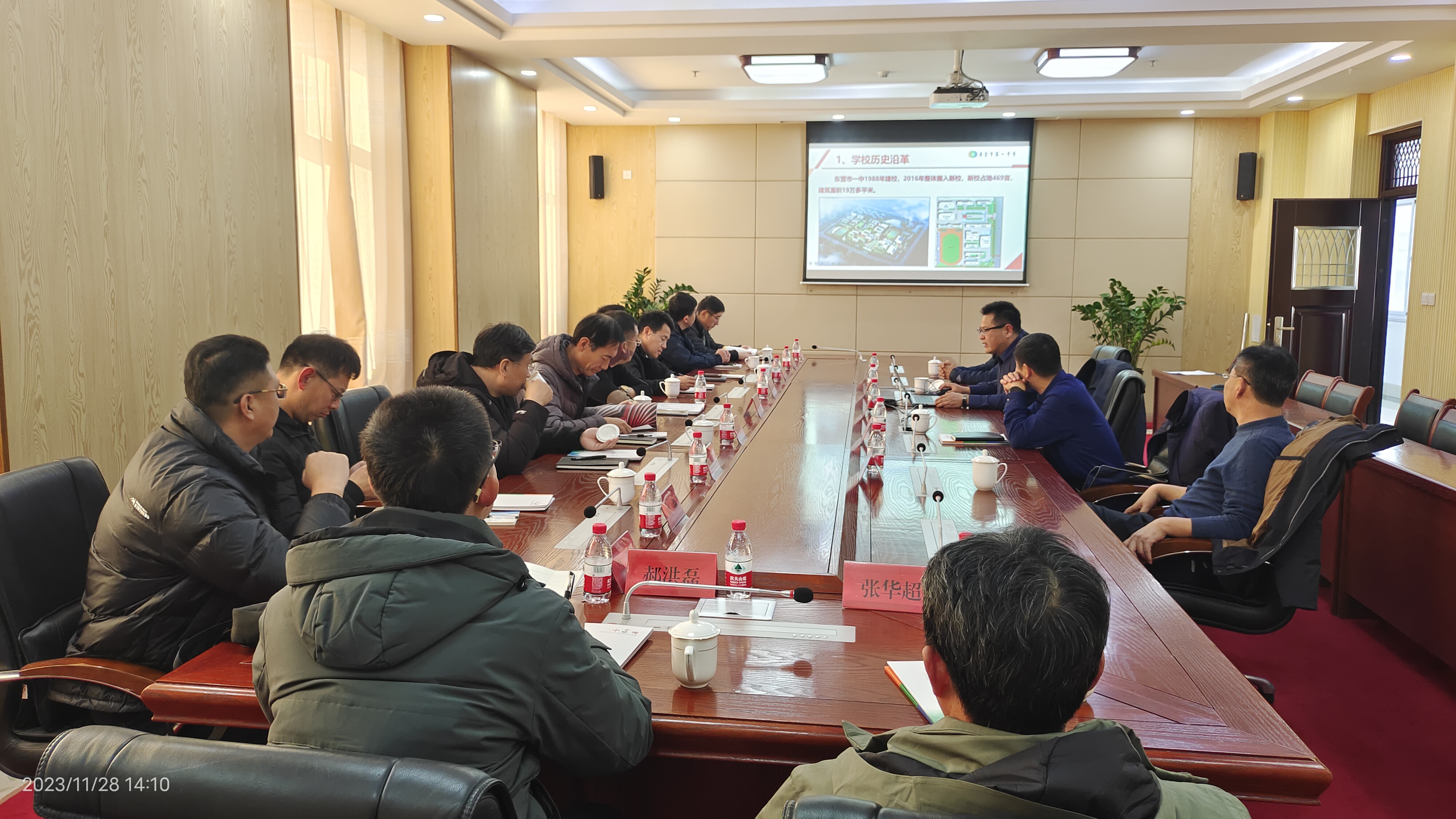 在学校第一接待室,李校长与来宾座谈,就我校教育教学理念、办学成绩及特色、校园文化建设等,特别是学校体育工作,进行了对口交流。