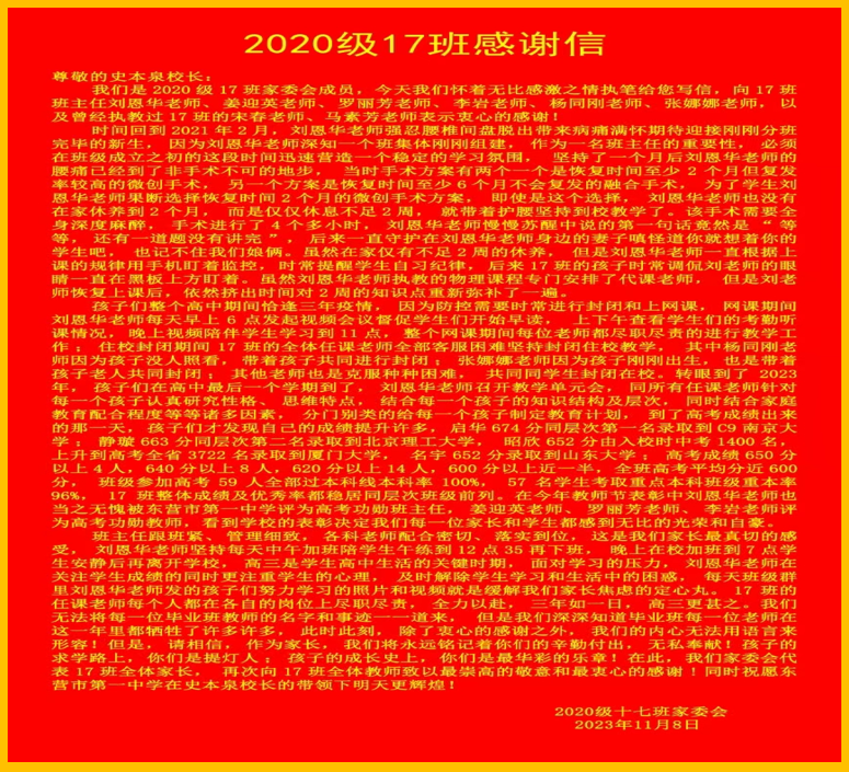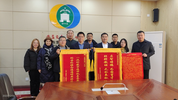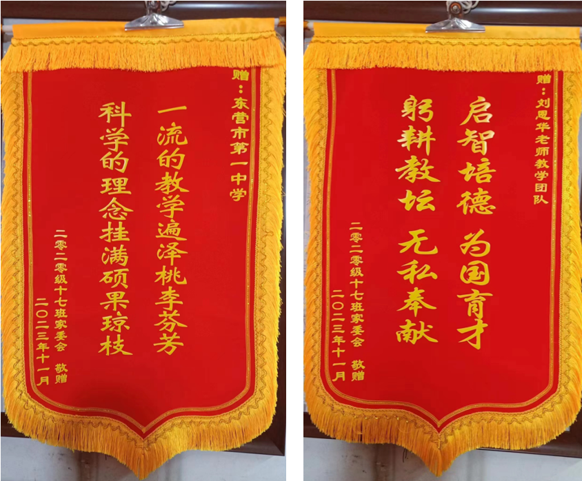 近日,市一中2020级17班家委会部分家长来到学校,代表17班全体学生家长,向学校送来感谢信,将写有“一流的教学遍泽桃李芬芳 科学的理念挂满硕果琼枝”字样的锦旗赠予东营市一中,向学校表达崇高的敬意和衷心的感谢;将写有“启智育德 为国育才 躬耕教坛 无私奉献”的锦旗赠予班主任刘恩华所带领的2020级17班教师团队,感谢班主任老师管理用心细致,感谢各任课老师尽职尽责,三年如一日对学生的辛勤付出。办公室主任丁子勇代表学校接受了感谢信和锦旗,并向家长们表示感谢。