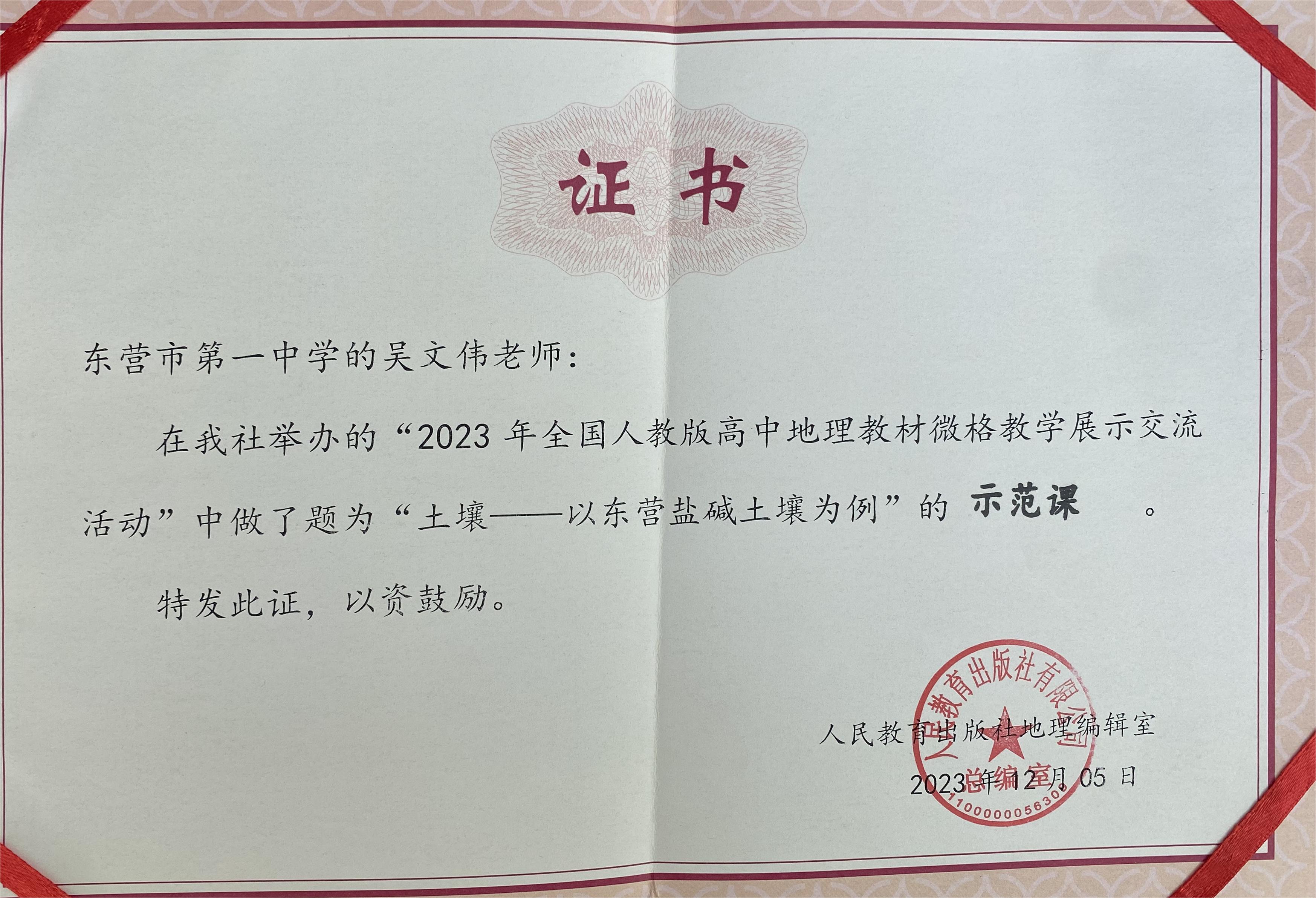 2023年12月3~6日,全国人教版高中地理教材微格教学展示交流活动在安徽合肥举行,来自全国23个省市的48位优秀高中地理老师参赛,市一中吴文伟老师代表山东省参赛并荣获优秀“示范课”。
