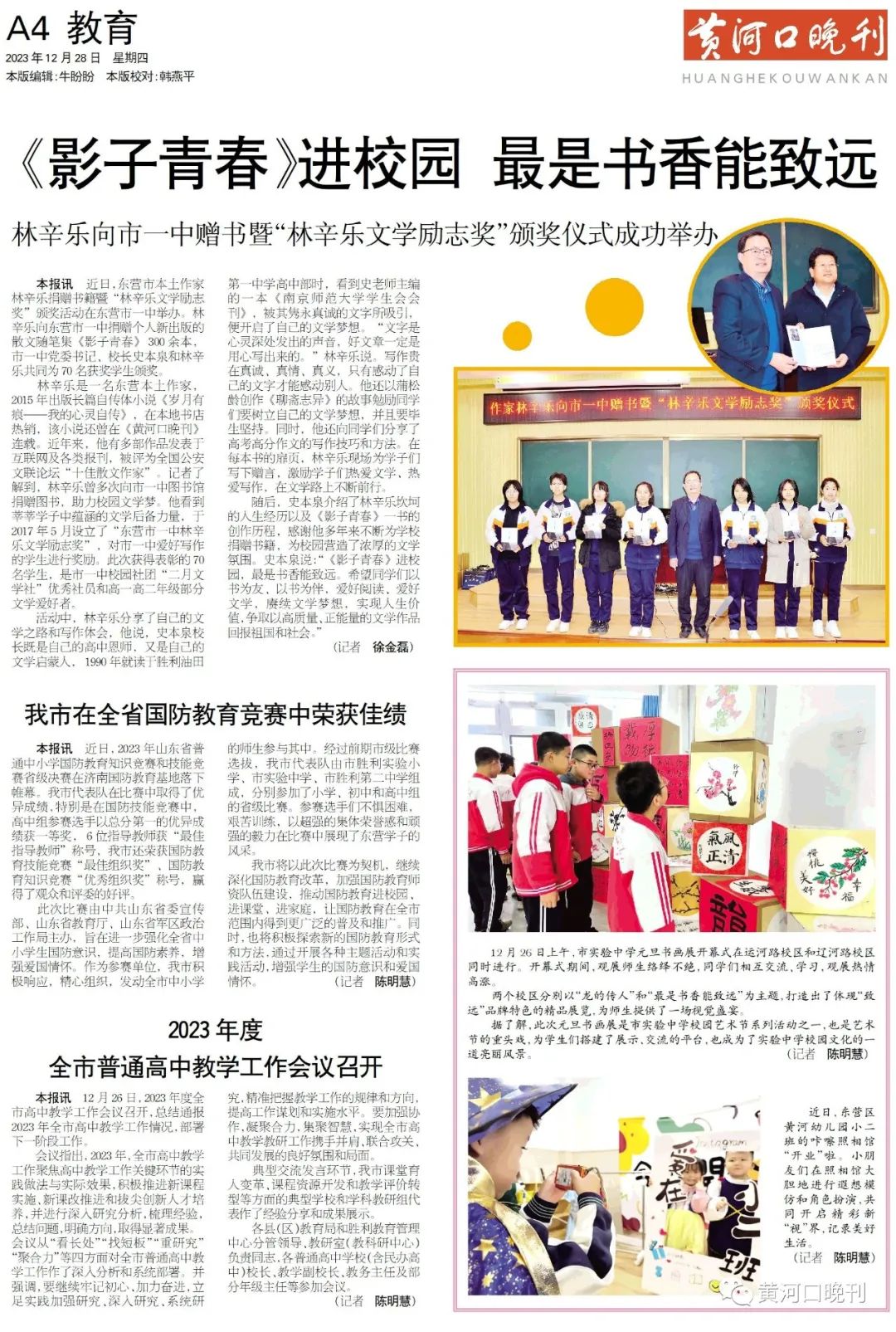 近日,东营市本土作家林辛乐捐赠书籍暨“林辛乐文学励志奖”颁奖活动在东营市一中举办。林辛乐向东营市一中捐赠个人新出版的散文随笔集《影子青春》300余本,市一中党委书记、校长史本泉和林辛乐共同为70名获奖学生颁奖。