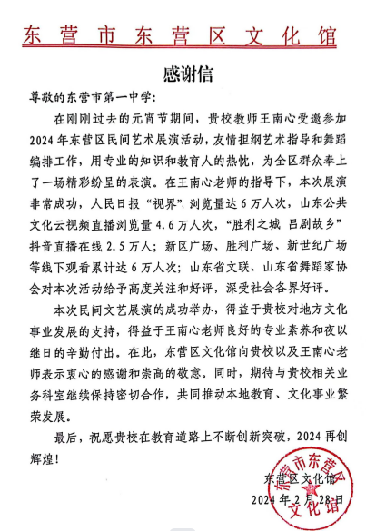 东营区文化馆特致感谢信,向我校以及王南心老师表示衷心的感谢和崇高的敬意。