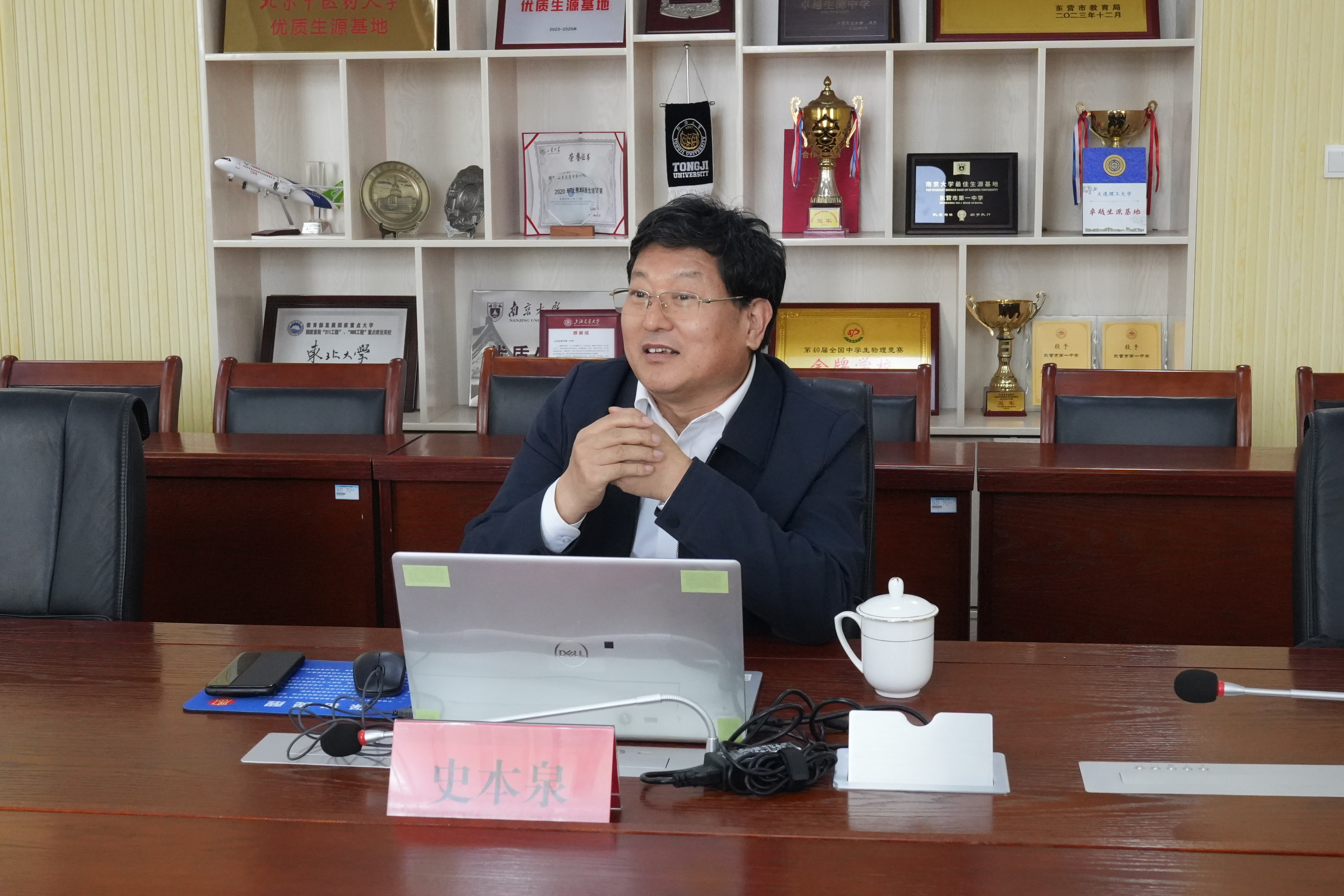 在会议室,史本泉校长就学校教育教学理念、教师队伍建设、校园文化和拔尖创新人才选拔培养等情况,向来访客人作了介绍。双方就高中教育教学管理、校园文化建设和拔尖创新人才培养等进行了深度沟通交流。