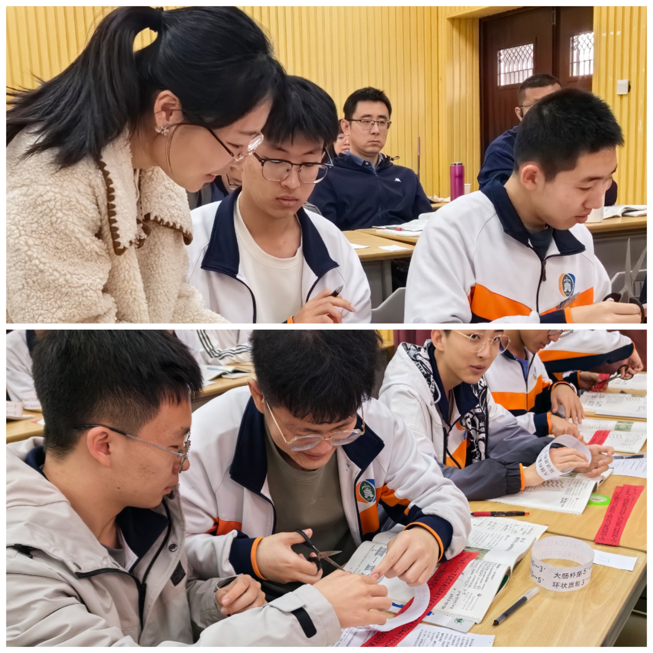 课上,郭东芳老师充分结合学情,主线明确,利用生动有趣的生物学实践活动,用不同颜色的纸条代表微观的“目的基因”和“质粒”,将晦涩难懂的学科知识一步步分解,使学生在动手操作中轻松掌握重点。