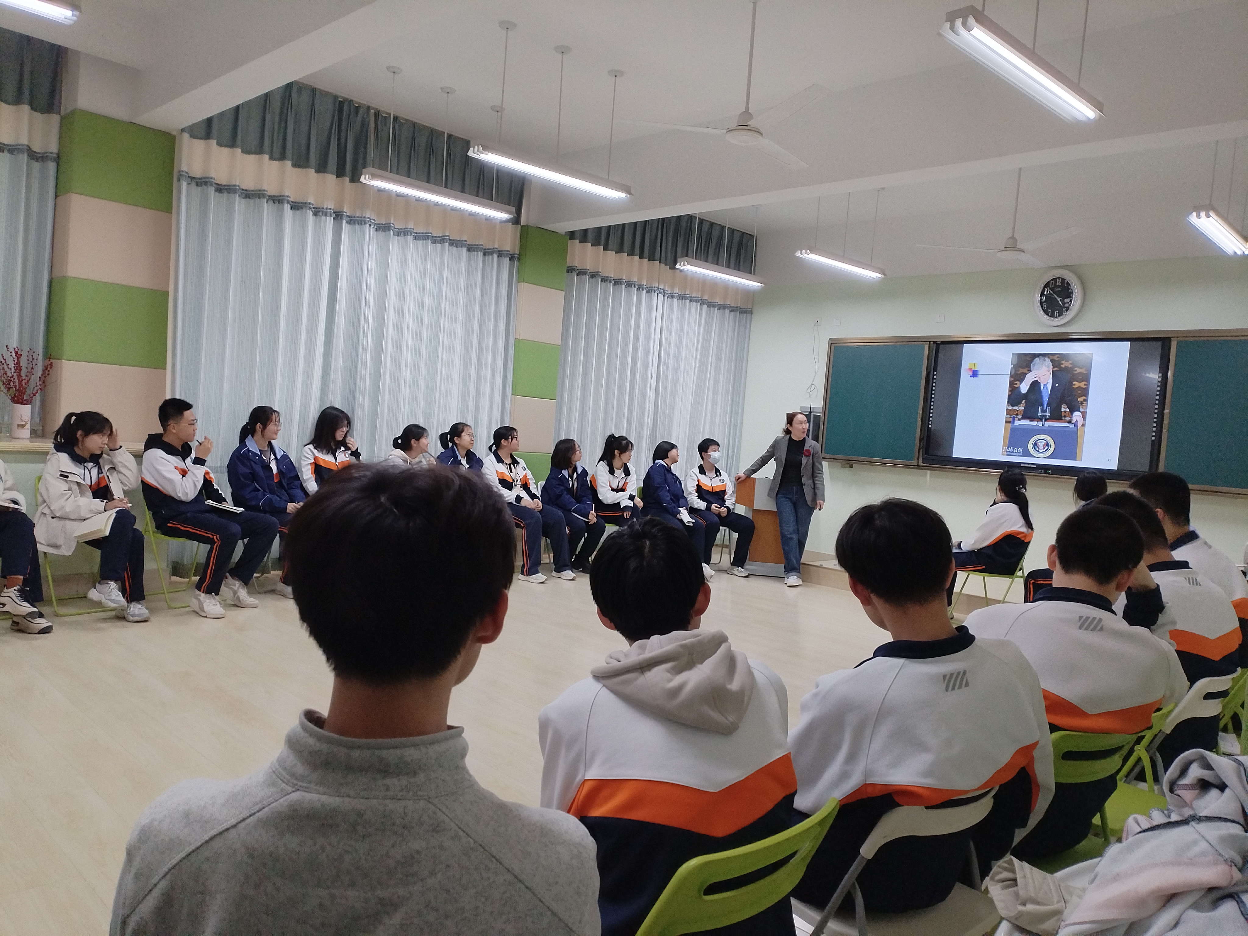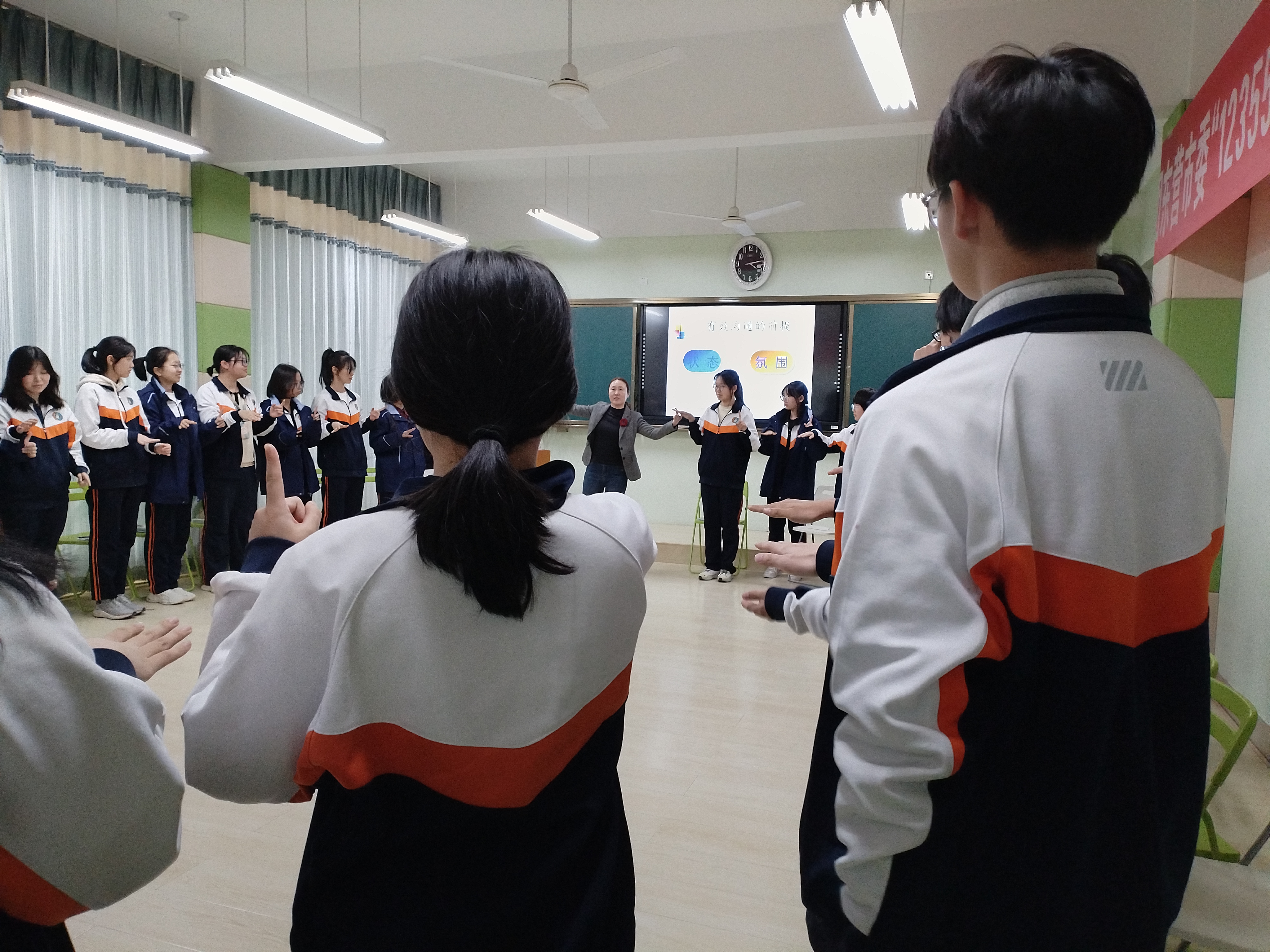 这节心理培训课内容非常丰富,体验活动一个接着一个。袁老师讲课幽默风趣,善用喜闻乐见的语言,引得大家笑声不断,课堂氛围轻松愉快。同时袁老师旁征博引,课程中还穿插解读了繁体“聽”字以及“智”与“慧”的区别,引发学生们对中华文化的浓厚兴趣。从头到尾,大家都听得格外认真,体验十分投入,互动积极主动。