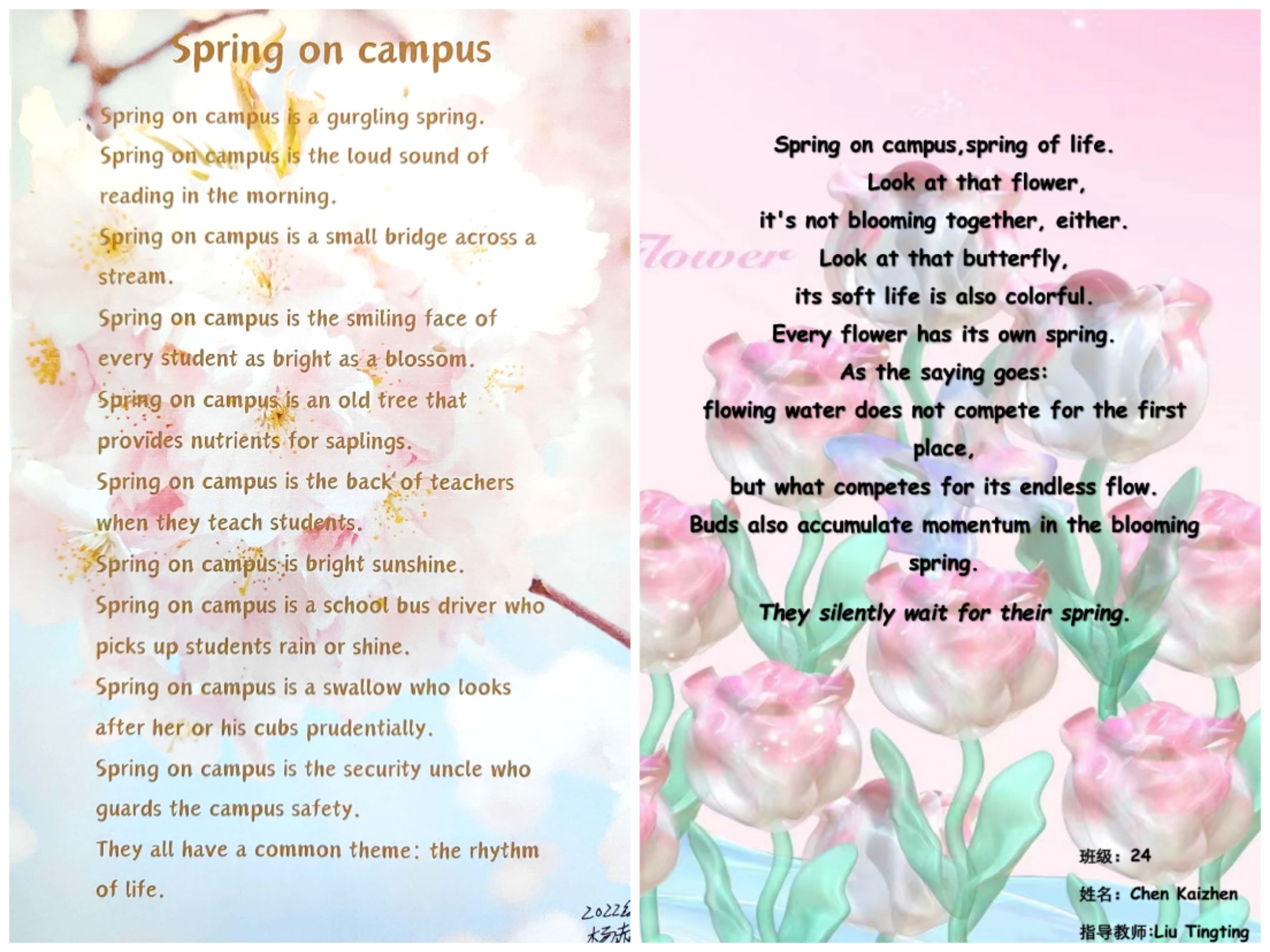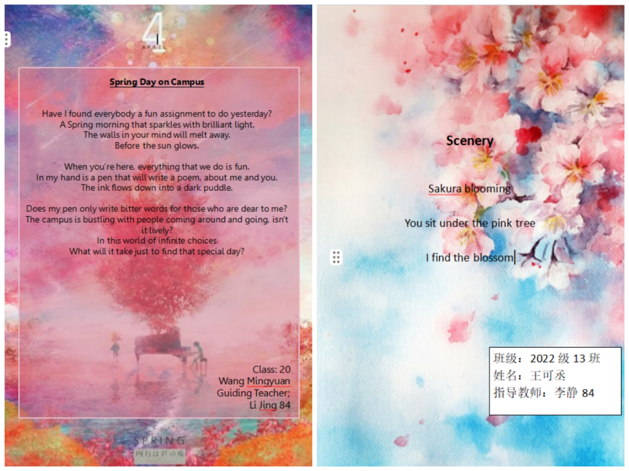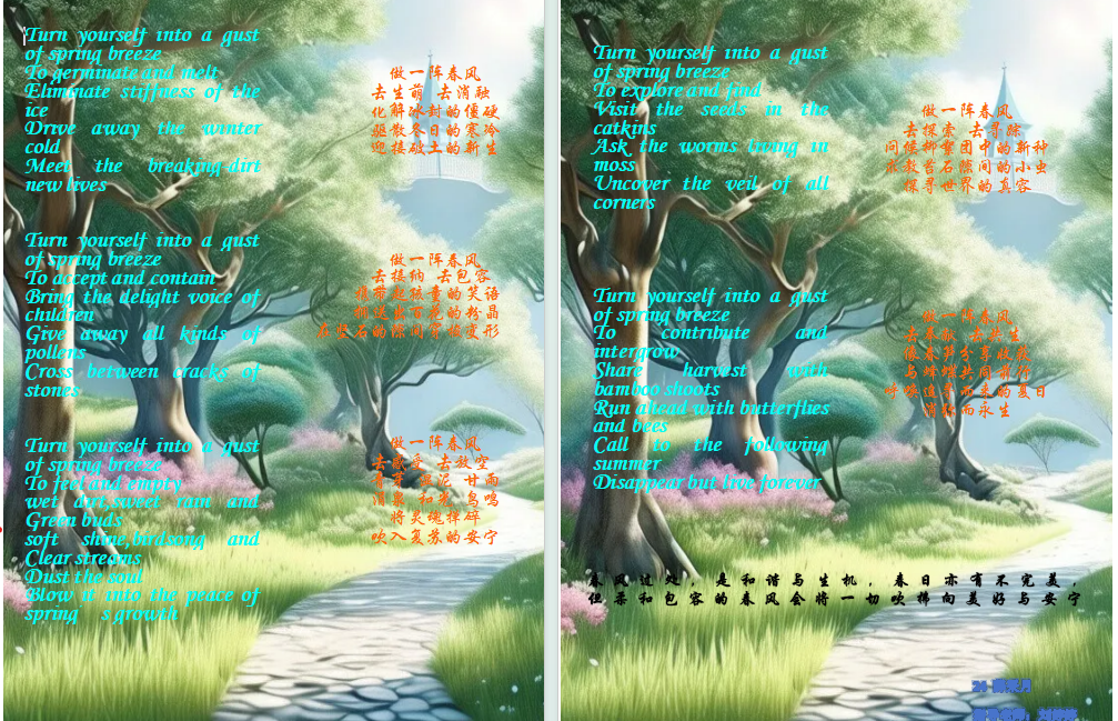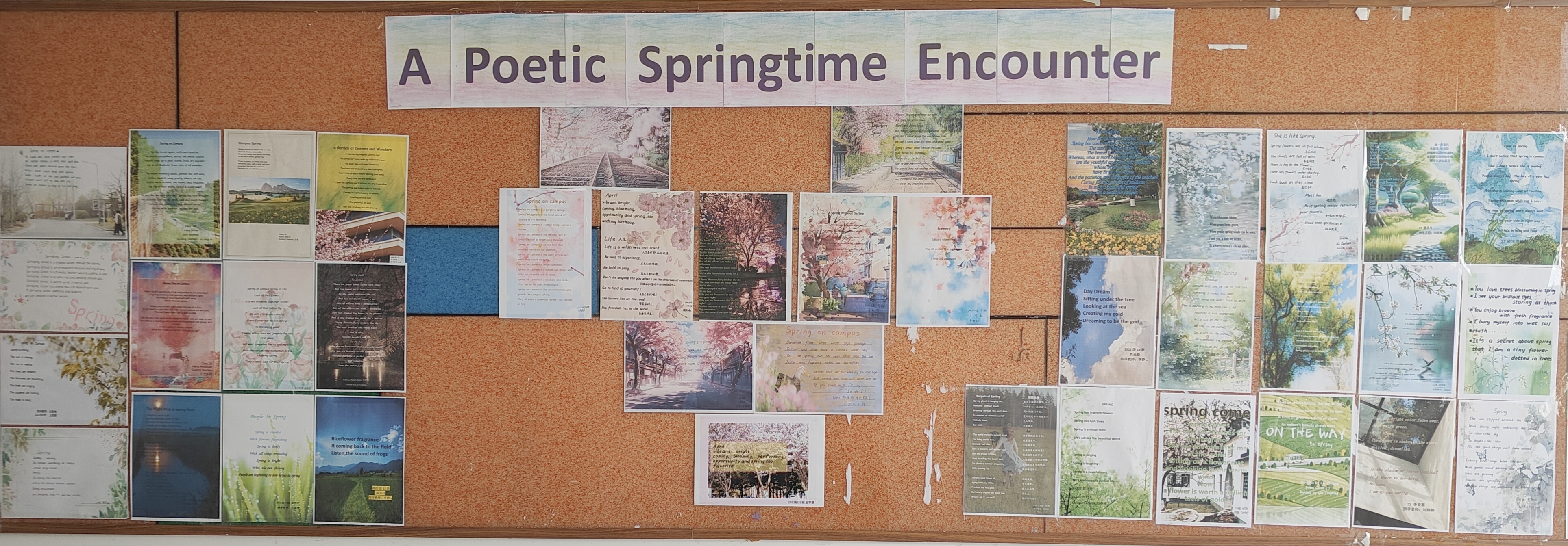 诗,是语言和情感交流的妙语;诗,是心灵与世界共谱的乐章。为了丰富英语学习形式,进一步激发学生学习英语的热情,感受英语独特的魅力,4月份,2022级英语组结合选必三第五单元诗歌内容,举办了以“相约在春风里写诗A Poetic Springtime Encounter”为主题的诗歌创作大赛。