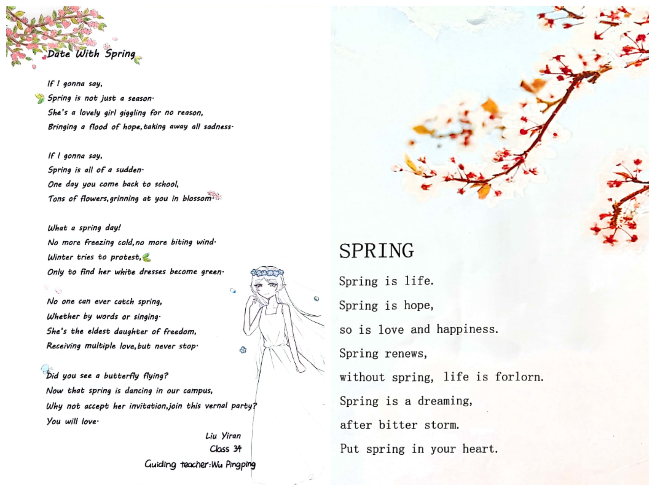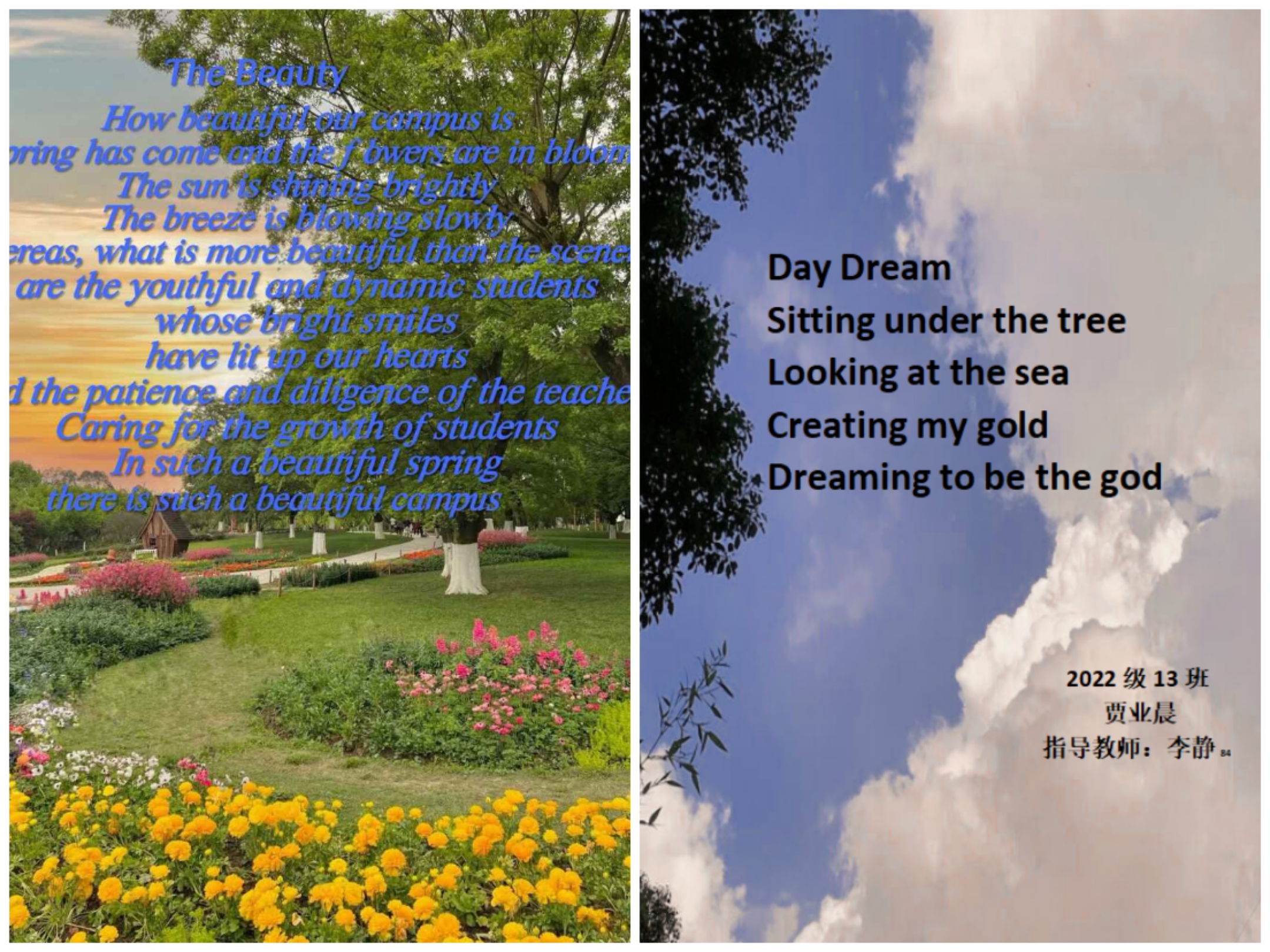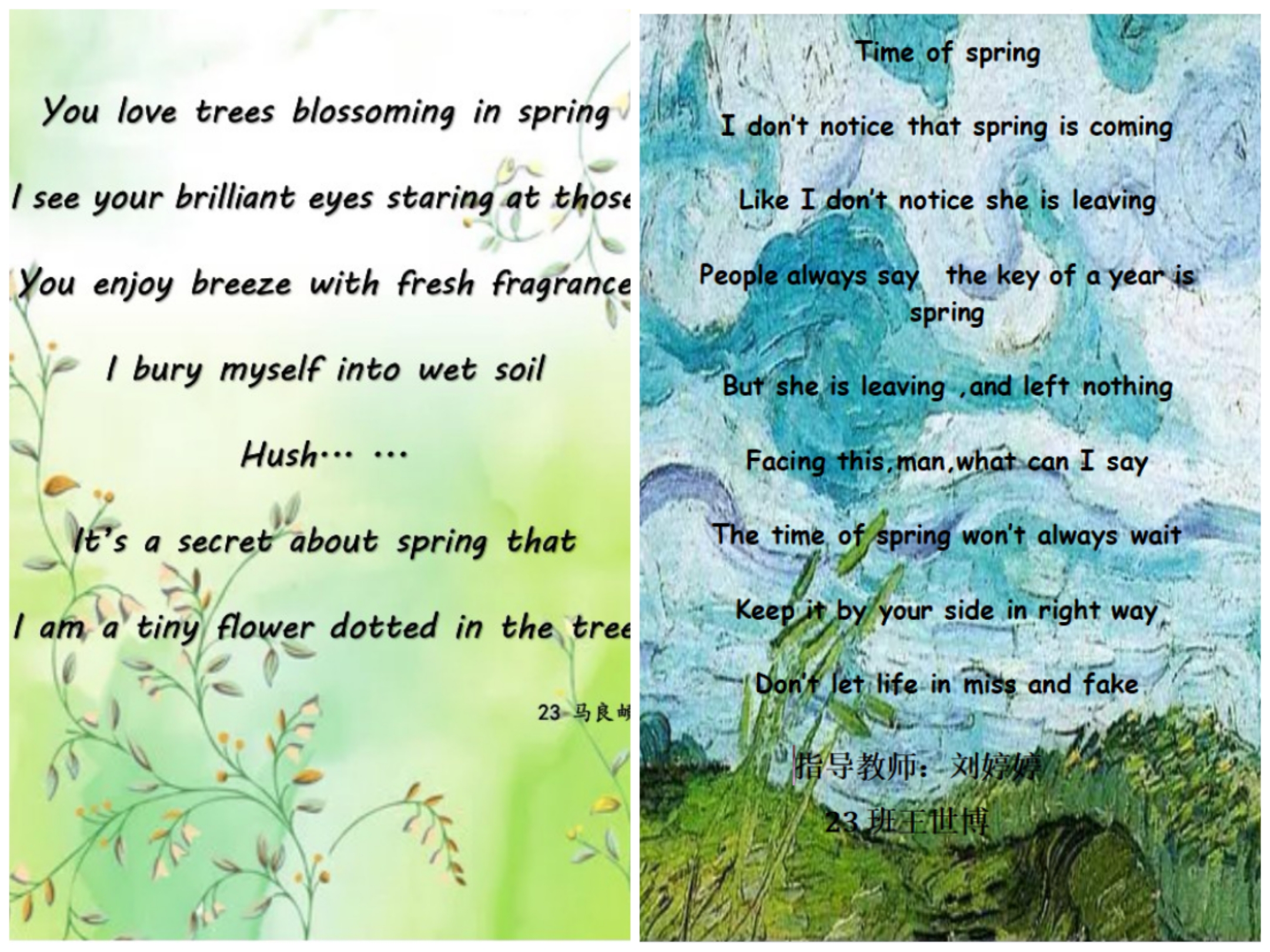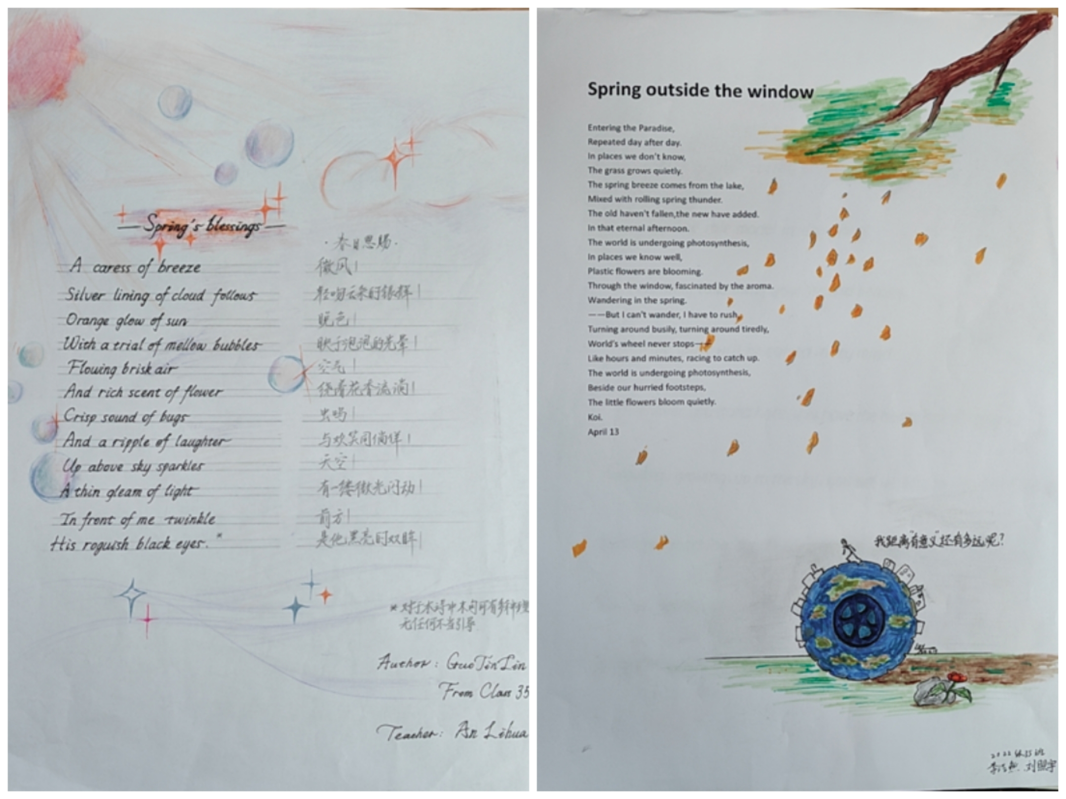 诗,是语言和情感交流的妙语;诗,是心灵与世界共谱的乐章。为了丰富英语学习形式,进一步激发学生学习英语的热情,感受英语独特的魅力,4月份,2022级英语组结合选必三第五单元诗歌内容,举办了以“相约在春风里写诗A Poetic Springtime Encounter”为主题的诗歌创作大赛。