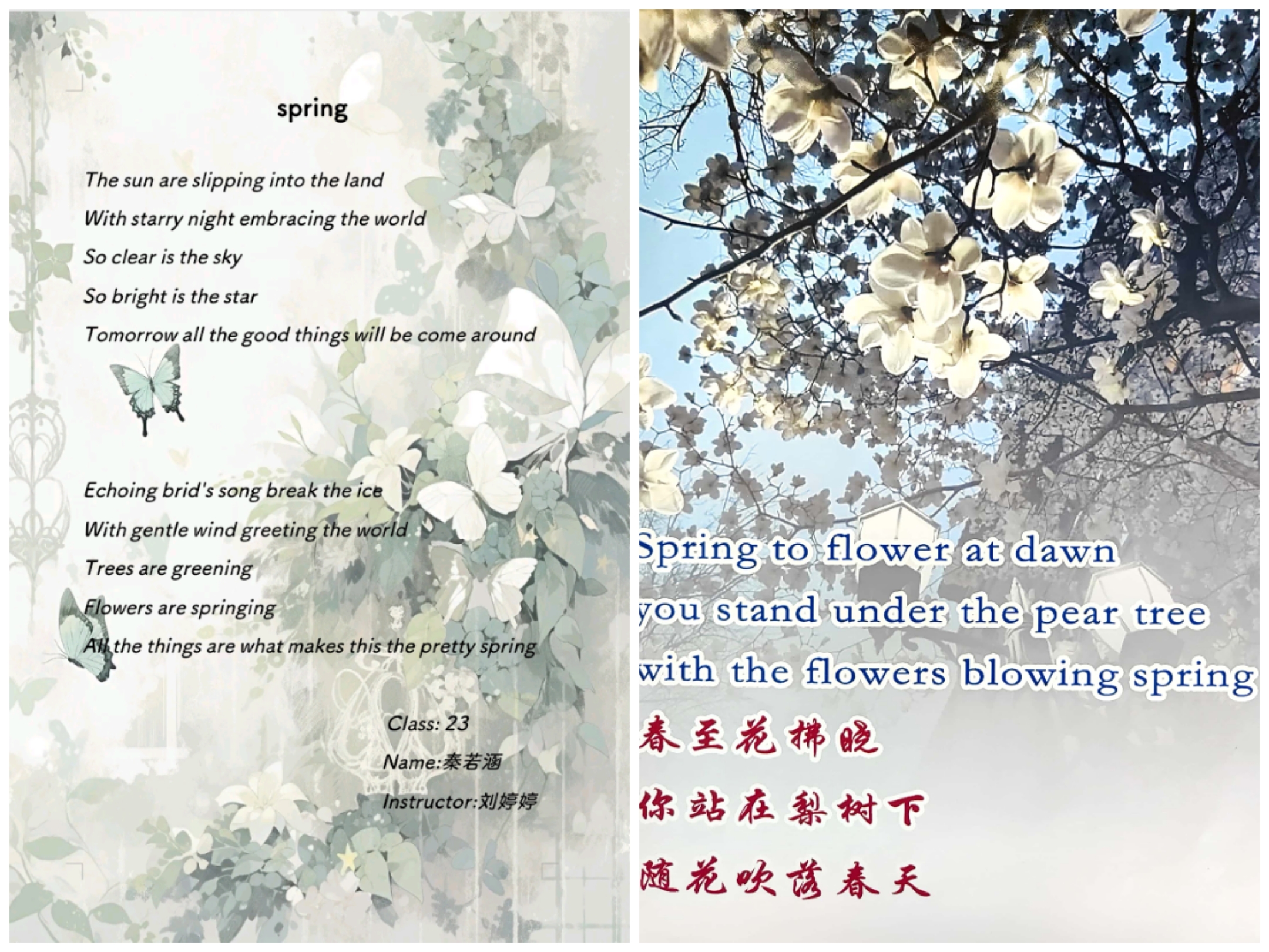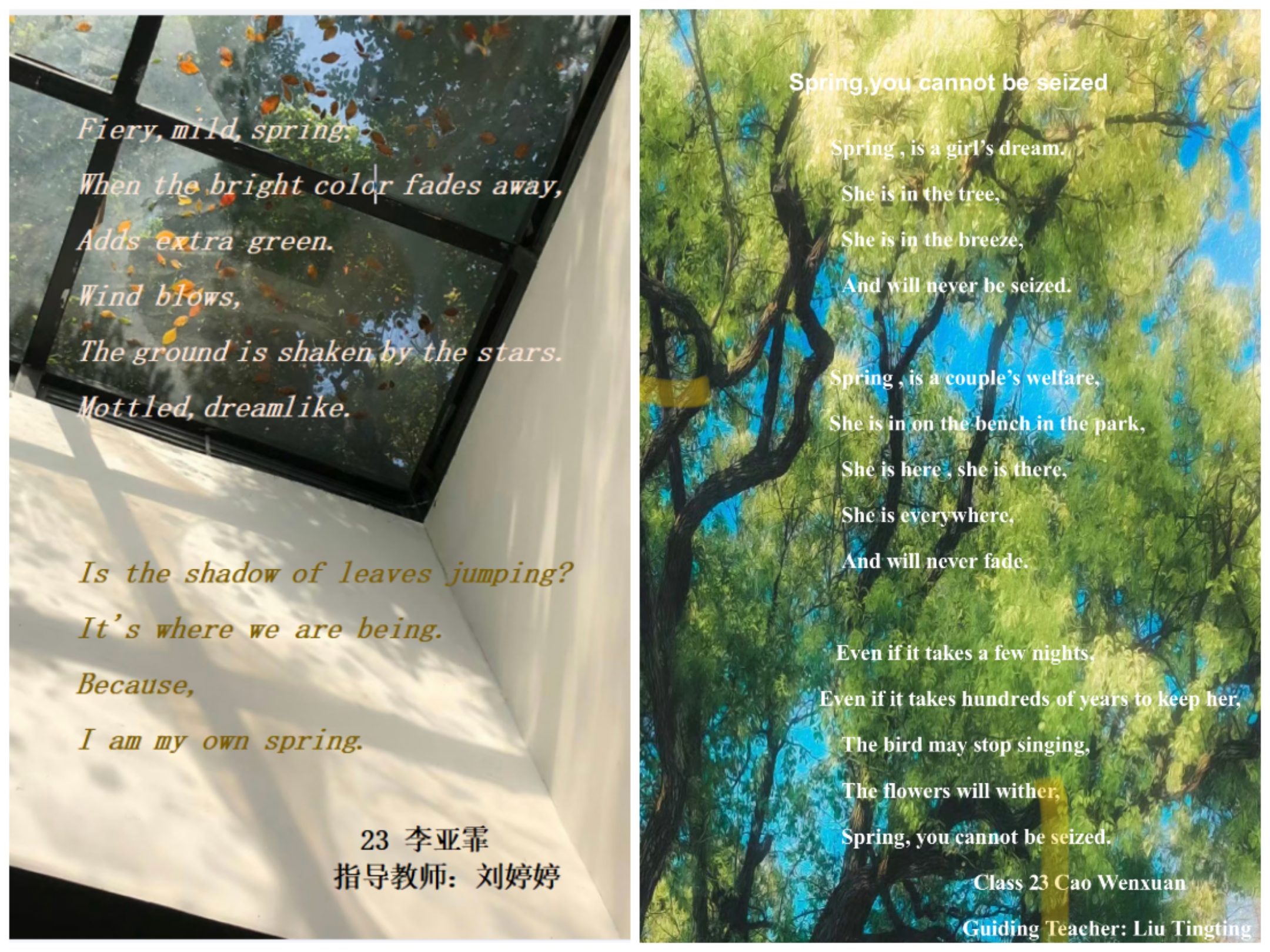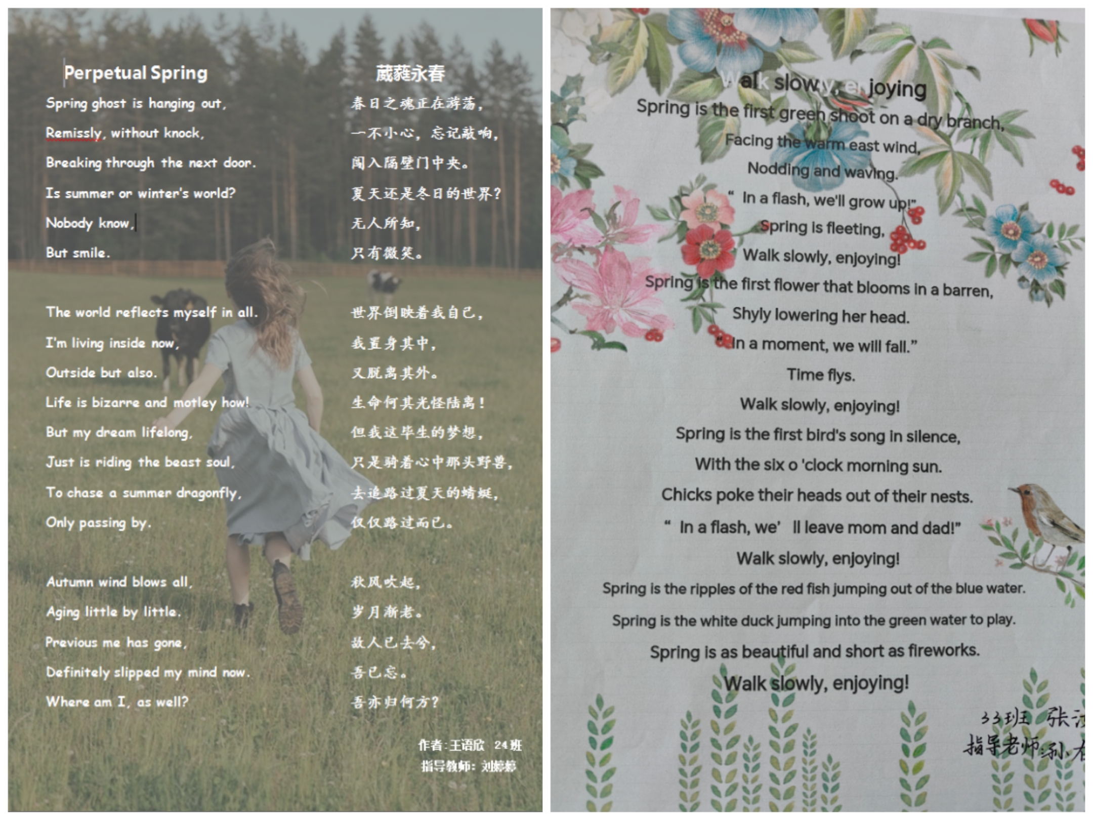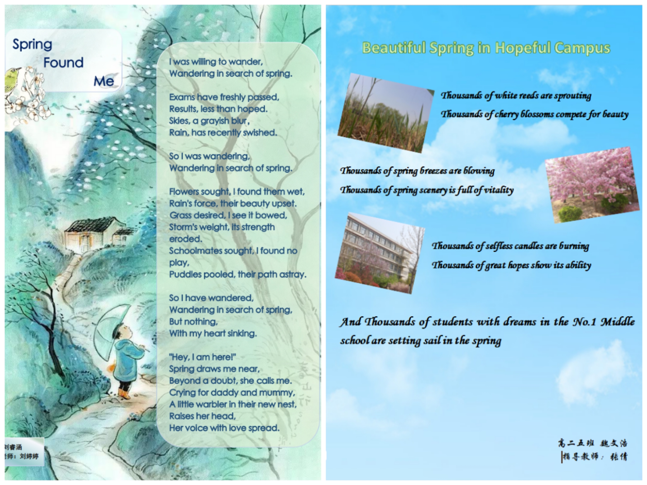 诗,是语言和情感交流的妙语;诗,是心灵与世界共谱的乐章。为了丰富英语学习形式,进一步激发学生学习英语的热情,感受英语独特的魅力,4月份,2022级英语组结合选必三第五单元诗歌内容,举办了以“相约在春风里写诗A Poetic Springtime Encounter”为主题的诗歌创作大赛。