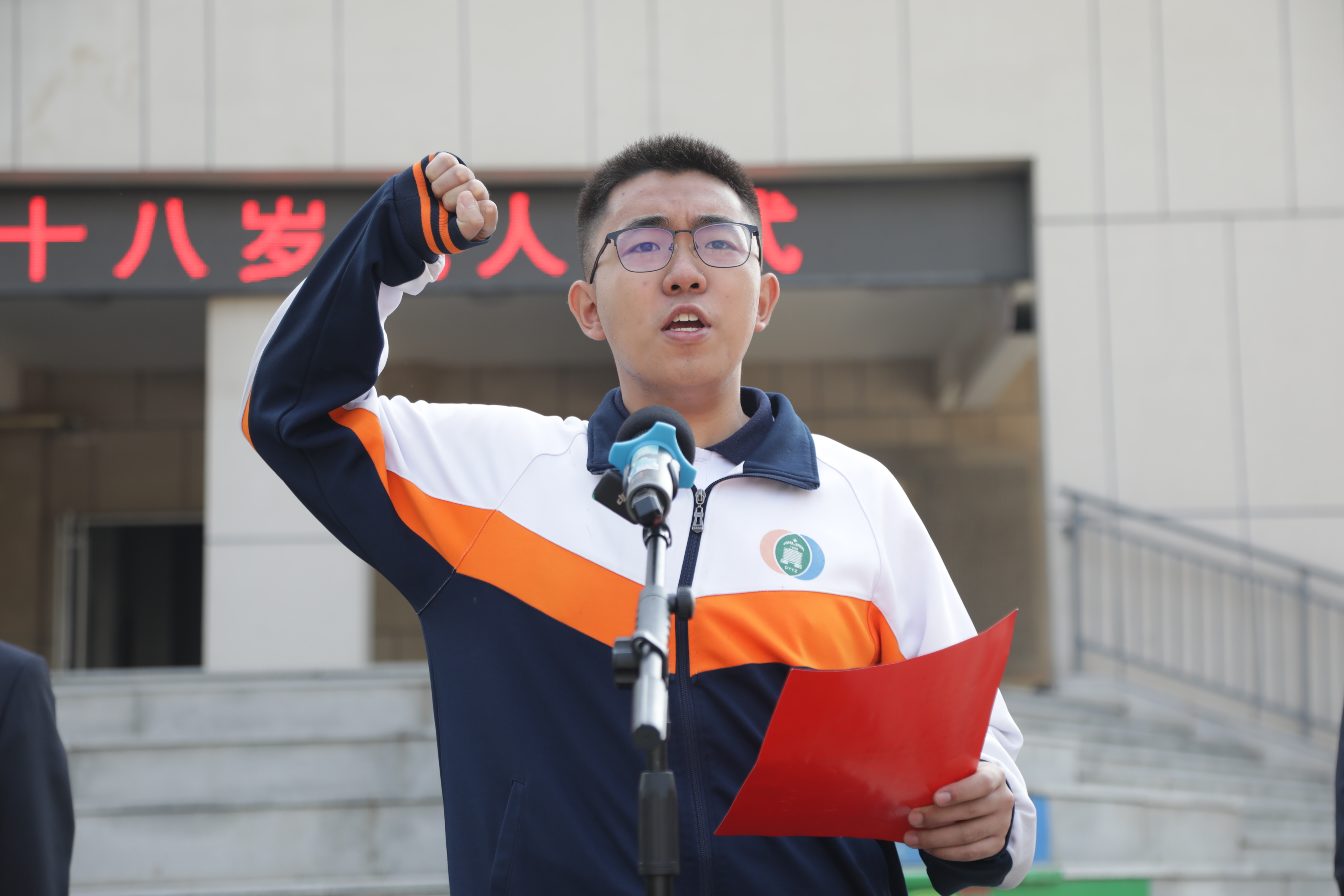 学生代表24班马建华带领十八岁同学共同宣誓,同学们右手举拳,面向国旗庄严宣誓,铿锵有力的的宣誓声响彻校园。
