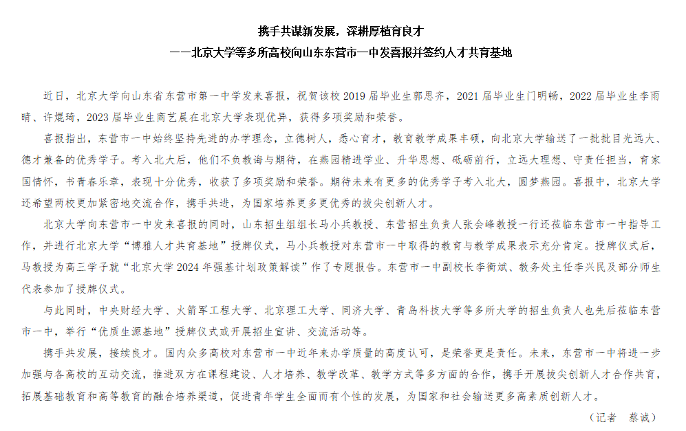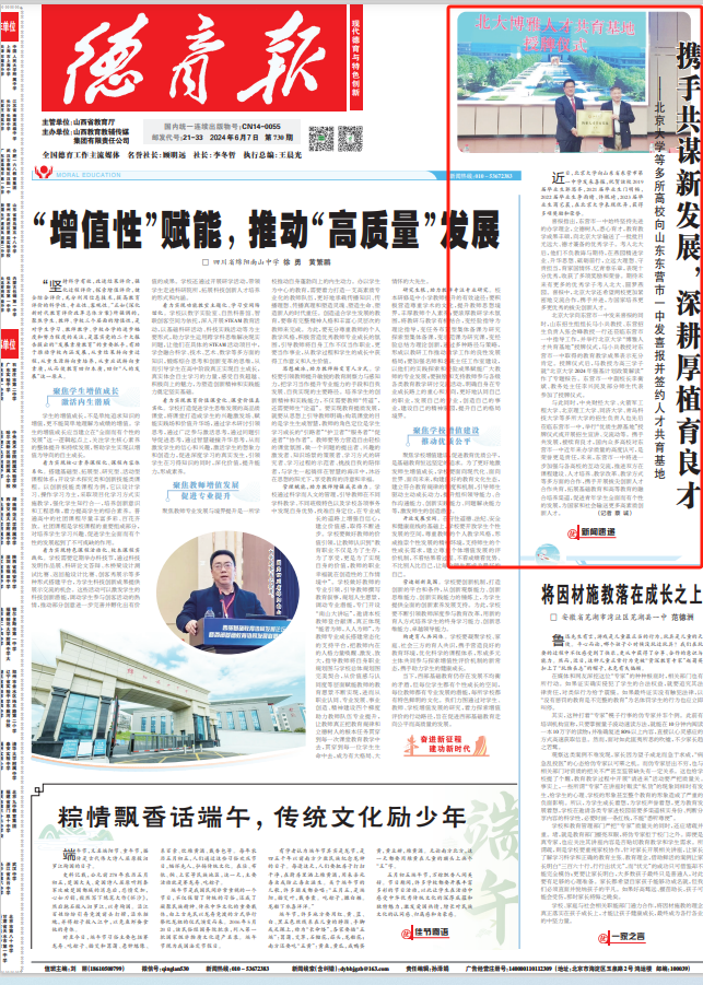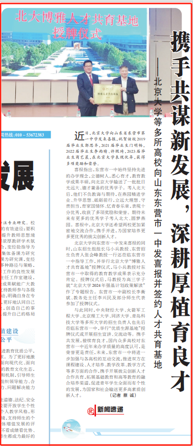 6月7日,《德育报》头版刊发文章《携手共谋新发展,深耕厚植育良才》,对北京大学等多所高校向东营市一中发来喜报并签约人才共育基地的情况进行了全文转载。
