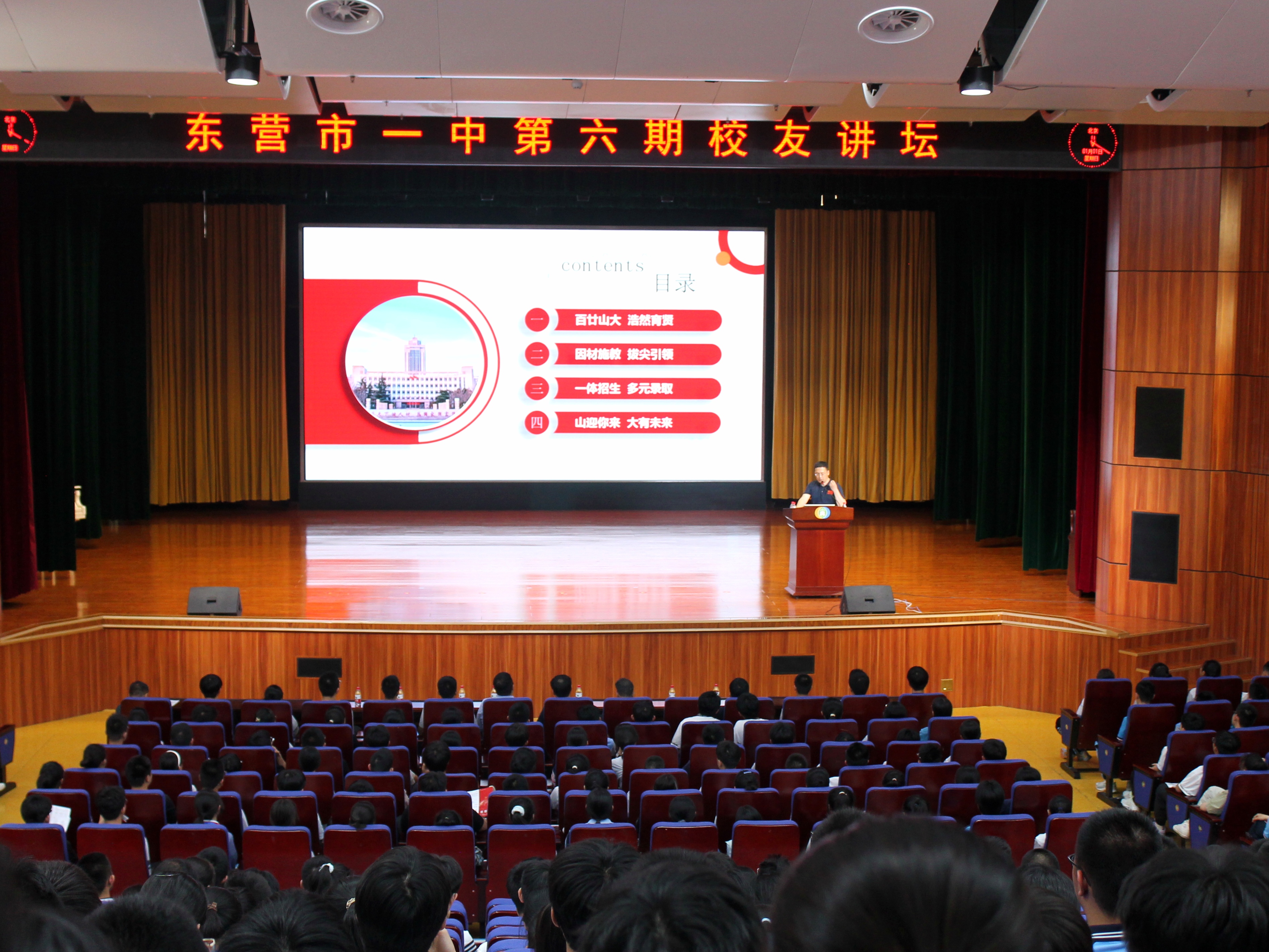 市一中领导、师生代表、一中校友会、助学中心理事会成员和校友代表等600余人参加了本期讲坛。东营市一中校友会会长、助学中心理事长张利致欢迎辞并主持活动。
