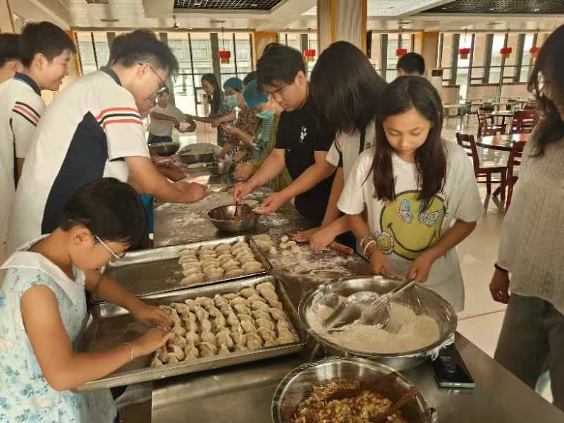 在学校食堂内,老师们细致入微地教授了美国青少年学生包饺子的技巧。从馅料的放置到饺子边的捏合,每一步都充满了中华传统饮食文化的韵味。大家虽然手法不太娴熟,却都兴致很浓,乐在其中,食堂里不时传来阵阵欢声笑语。