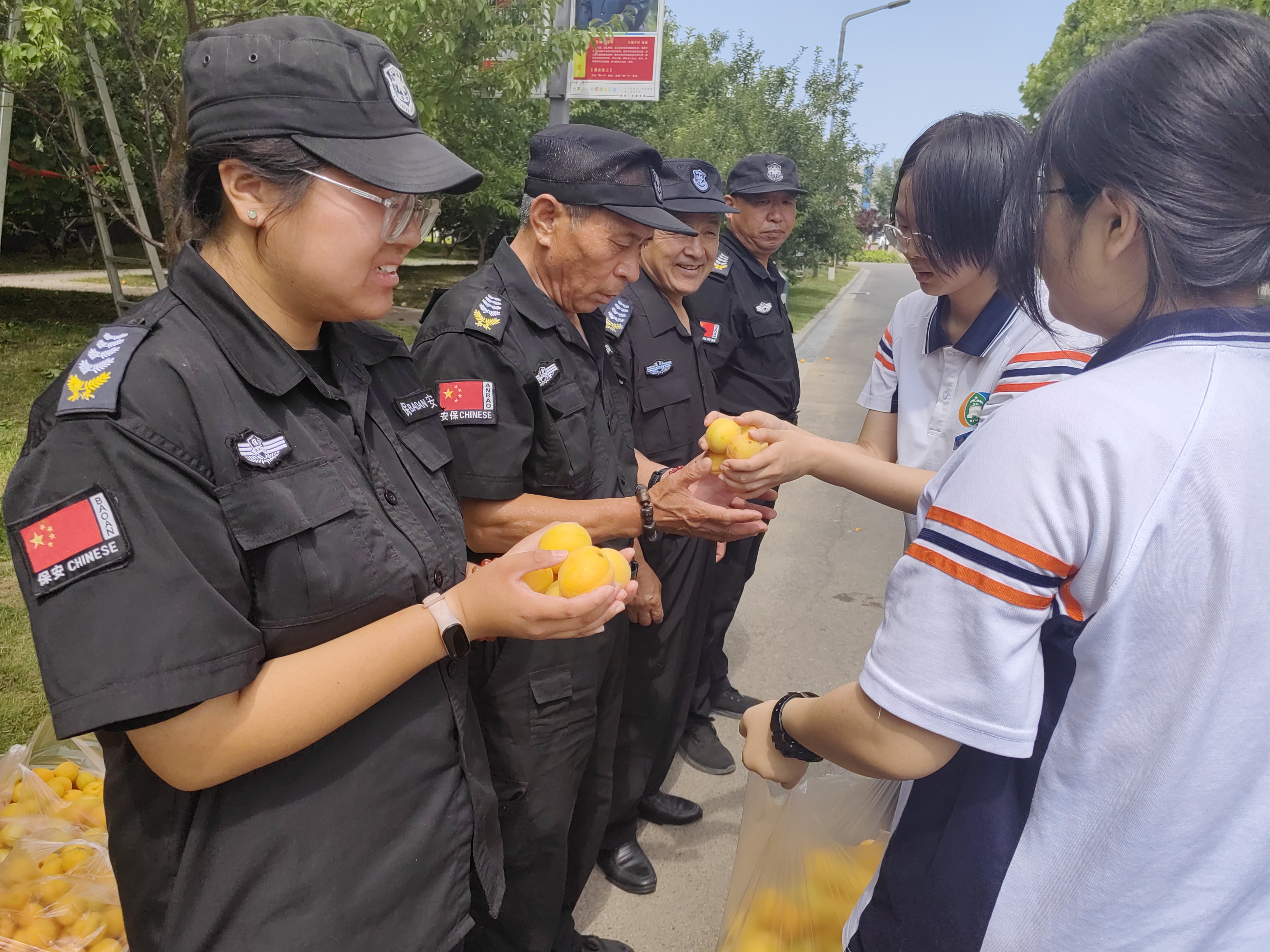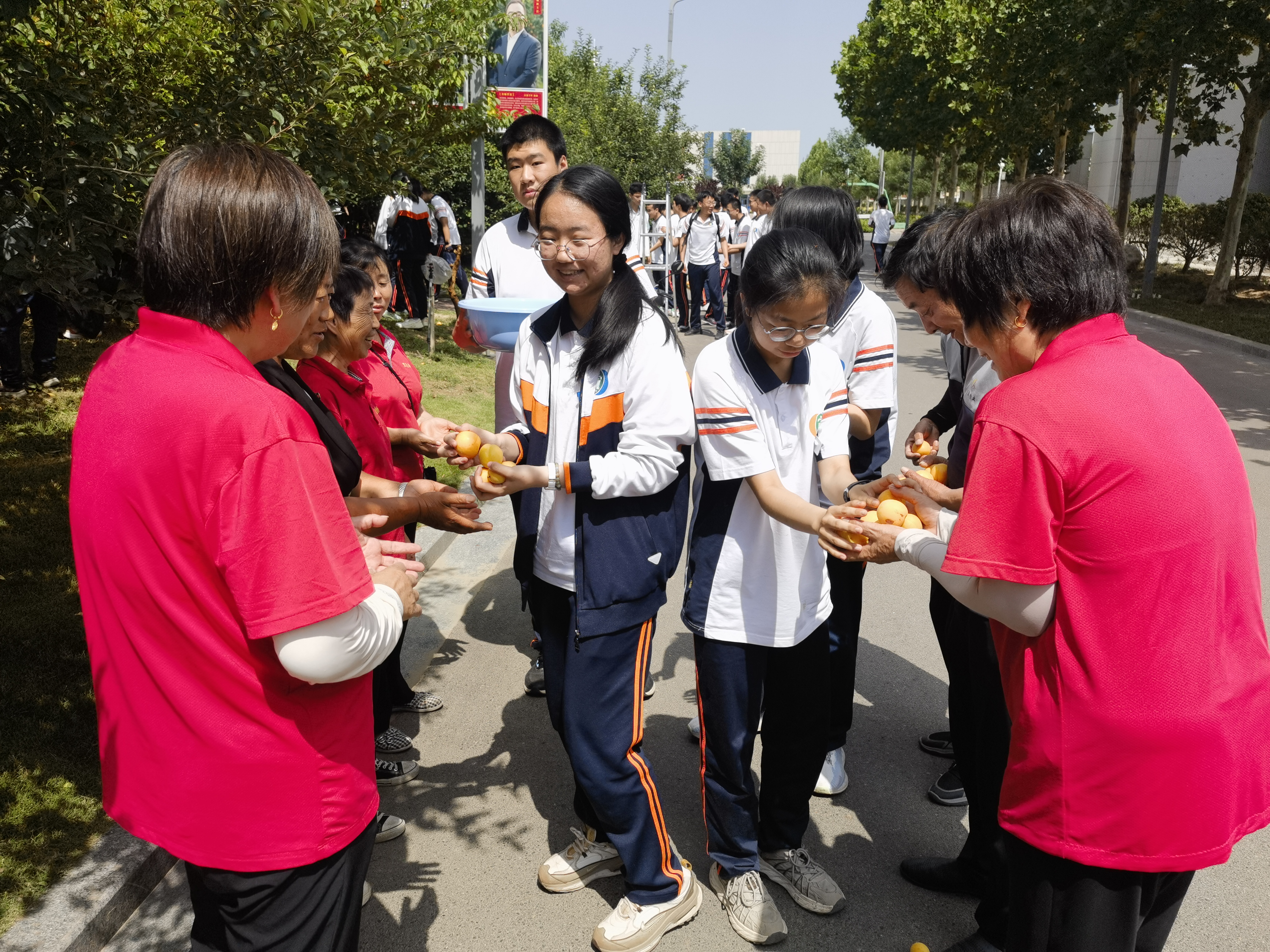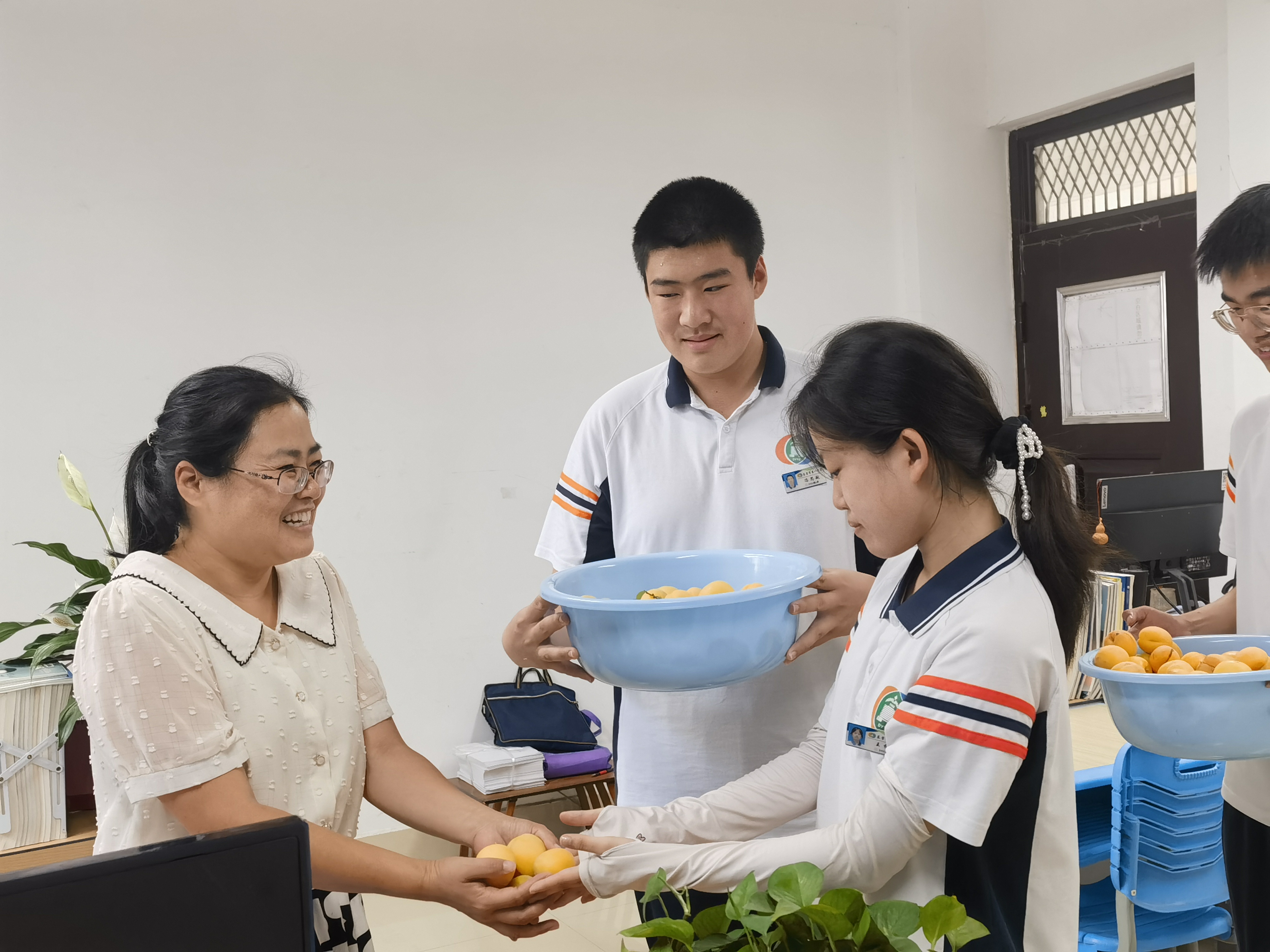 在团委和学生会的倡议下,同学们将采摘下来的金杏送给了即将跨入高三的学长,祝福他们“杏”运相随,学业进步,收获累累硕果;同学们还将金杏恭敬地送到老师办公室,感谢老师们的辛勤培育无私付出,祝福老师们幸福满满;送给学校的保安、保洁师傅,感谢工人师傅不辞辛苦给大家带来了安全优美的环境。