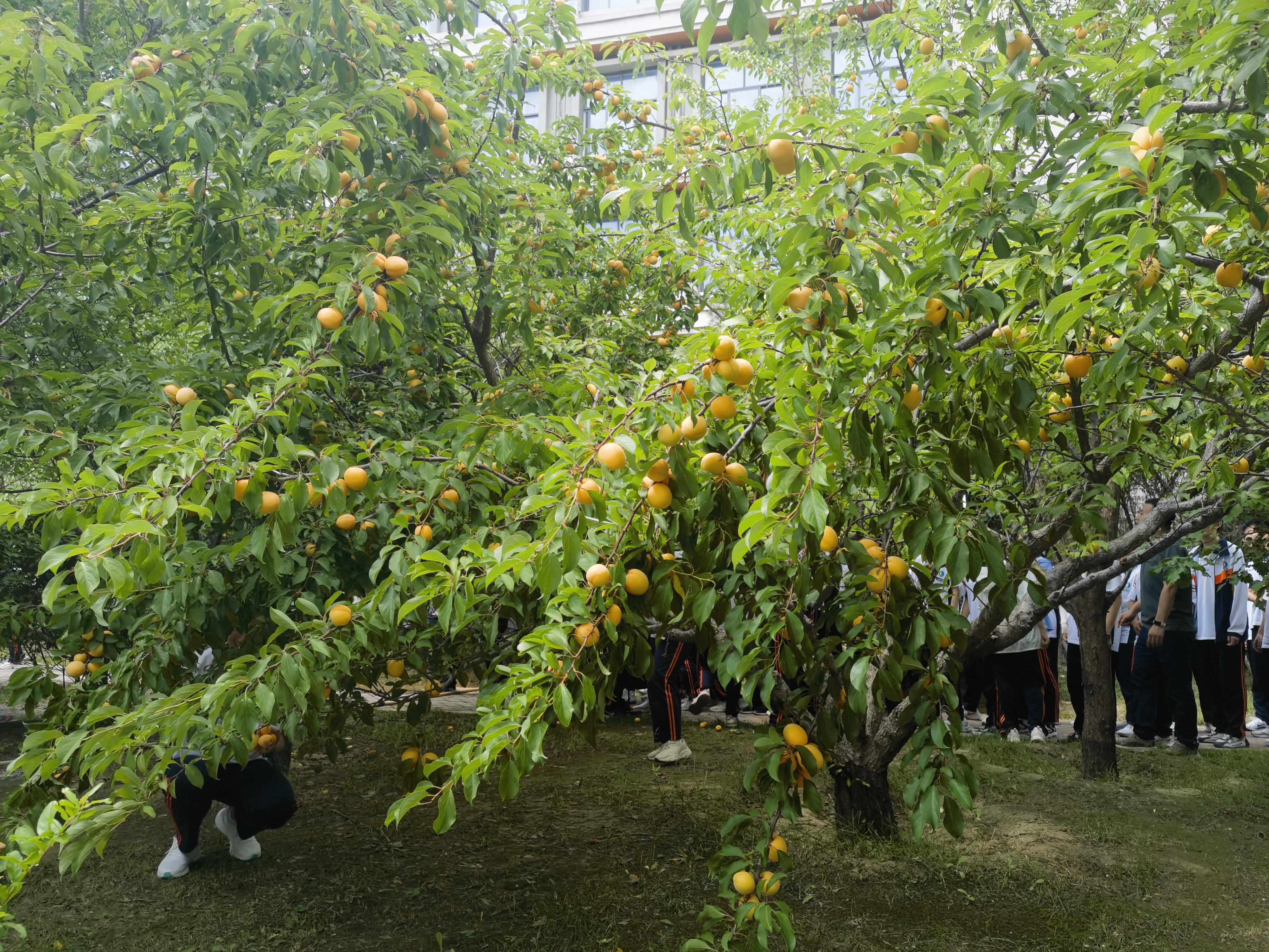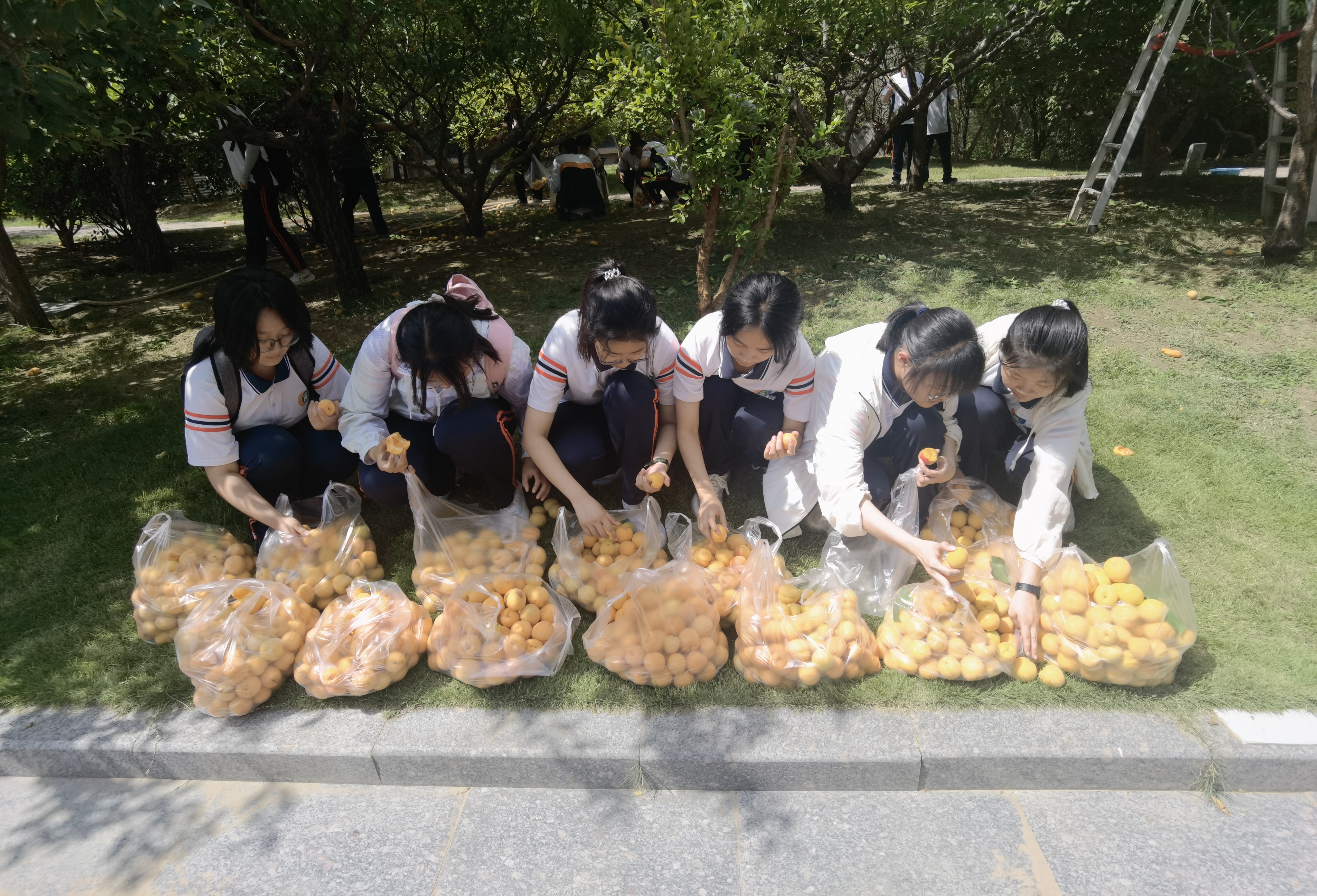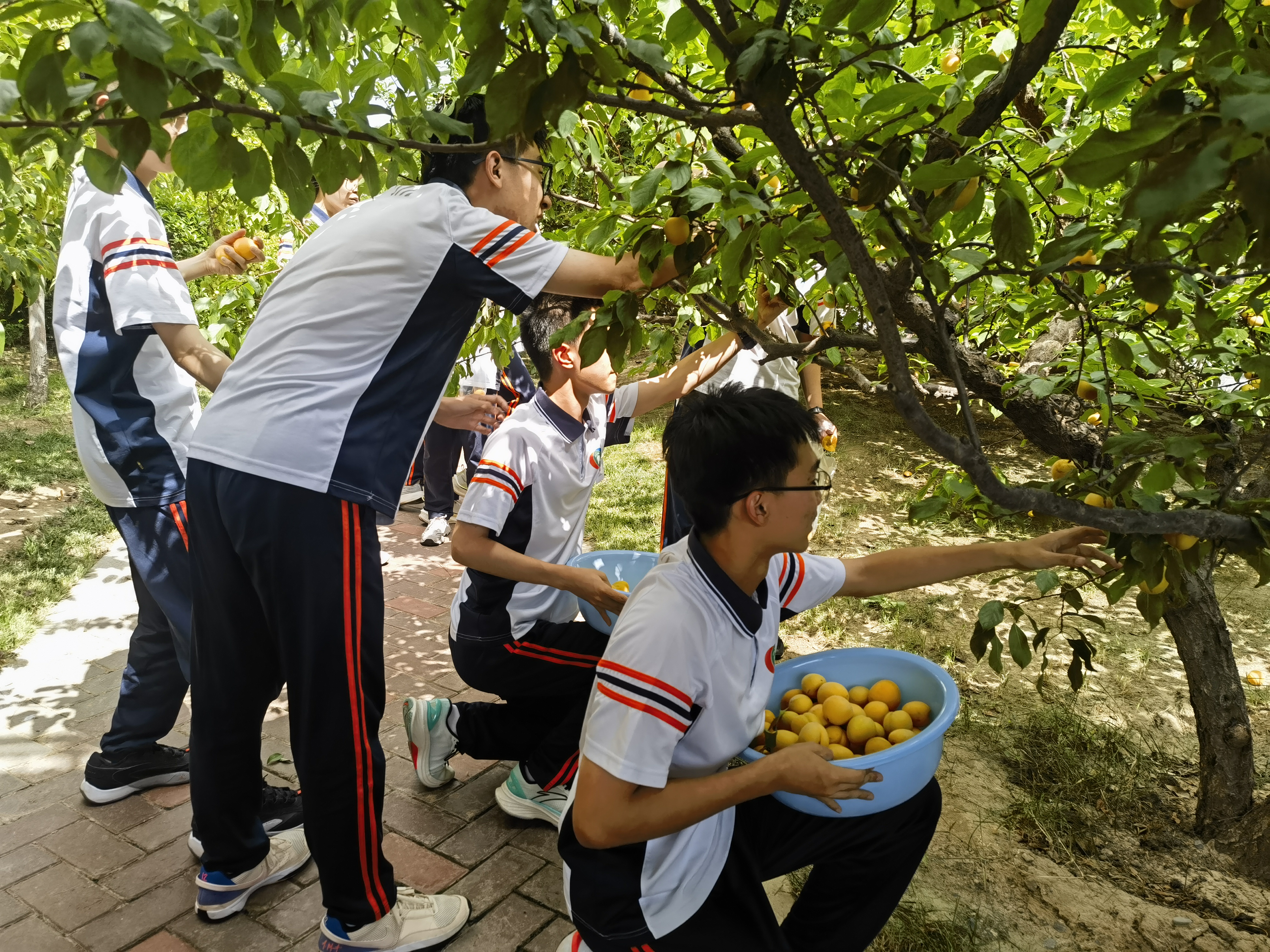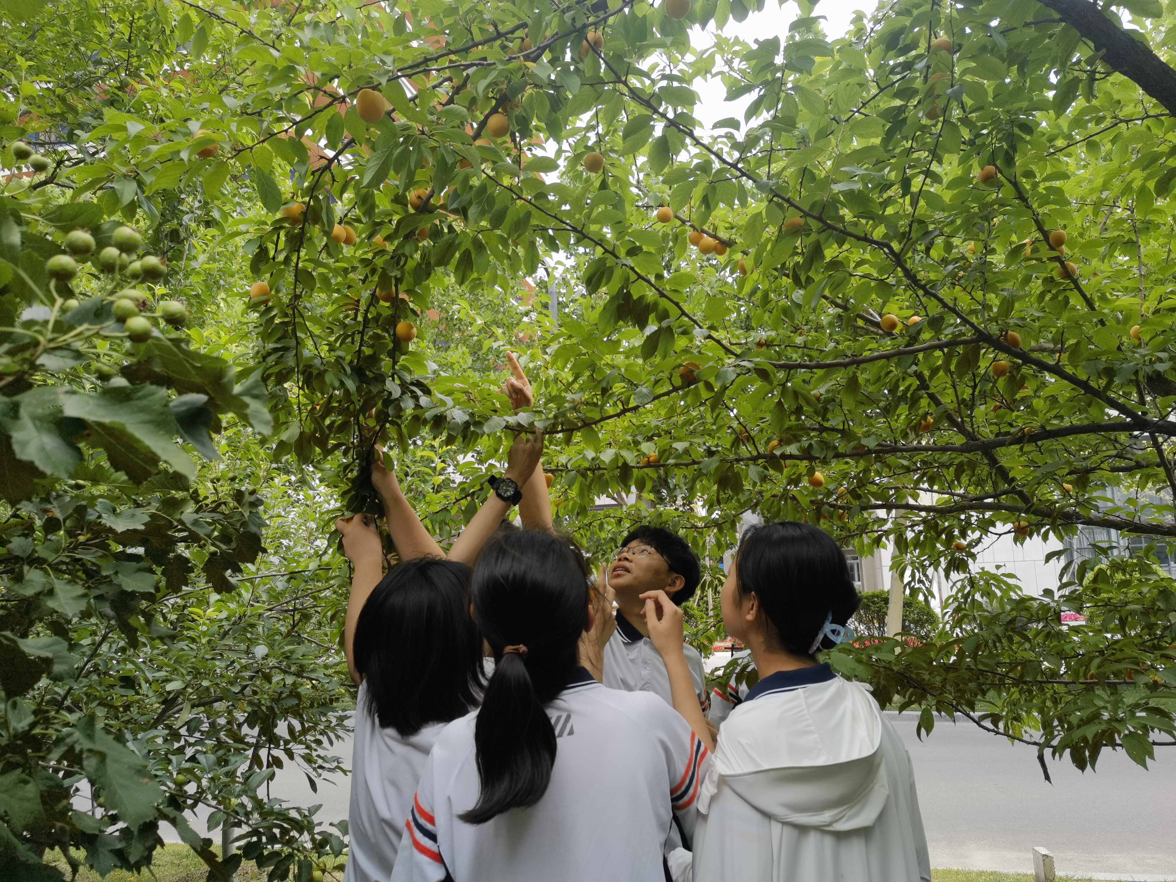 高三教学楼前百果园枝繁叶茂,宁静中透着勃勃生机,飘着清香的金色杏子挂满枝头压弯树干。采摘杏果活动开始了,师生自发形成若干个采摘小组,有人提篮,有人牵枝,有人摘果,配合默契。同学们兴致勃勃,小心翼翼地采摘熟透的金杏。杏果装在篮里,笑意写在脸上;体验着劳动的快乐,品尝着丰收的喜悦。