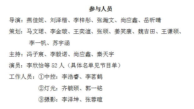 整场活动从活动组织到节目设计及节目排练均由学生自主完成。活动参与人员包括导演6人,策划9人,主持4人,技术支持4人,摄影2人,演员52人。共计77人。
