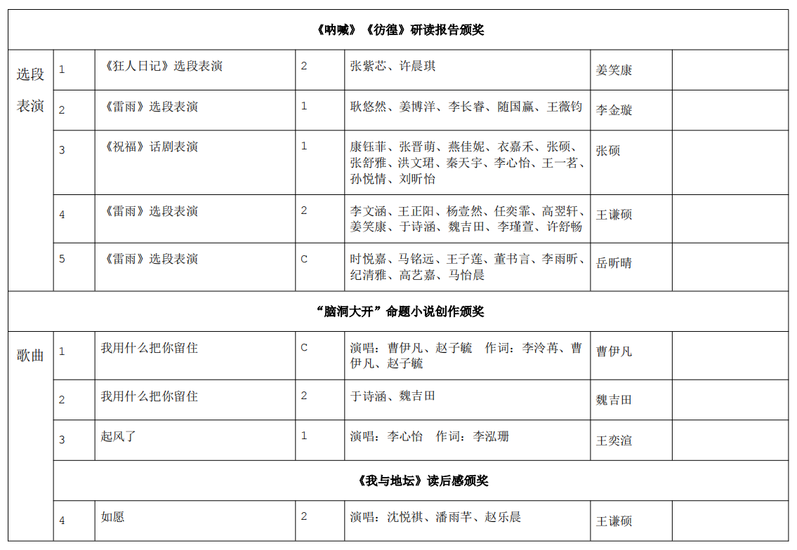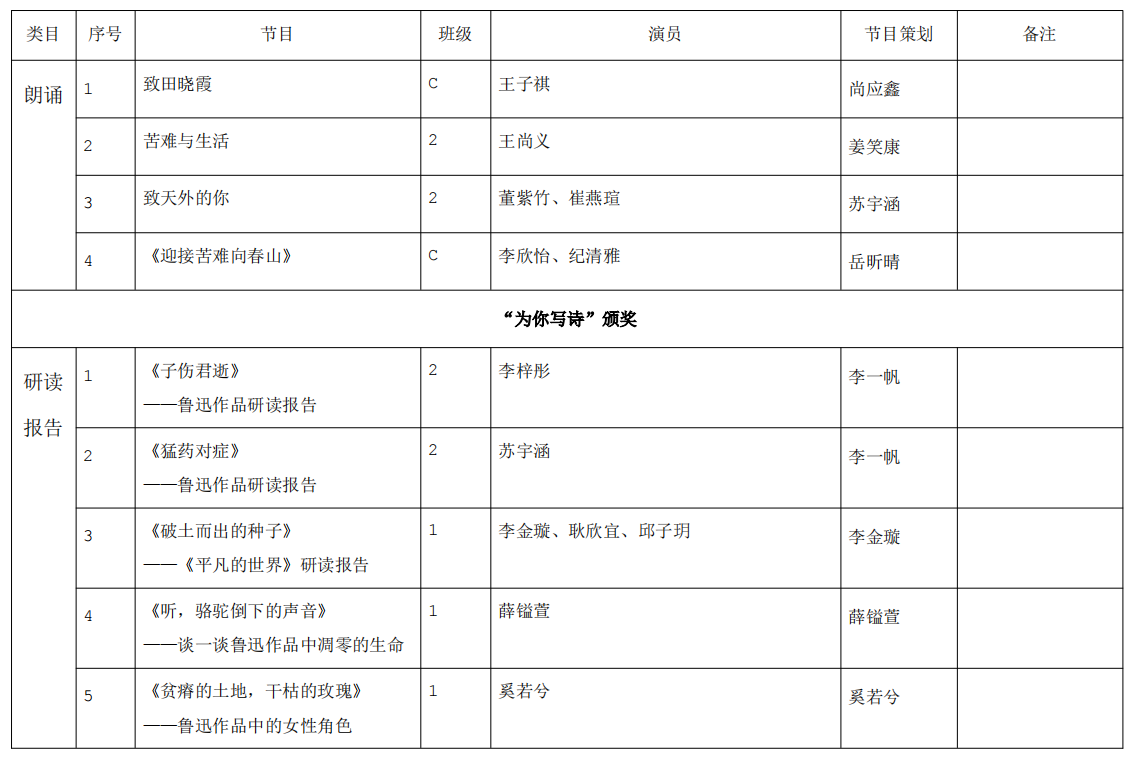 活动分为四个单元。分别是原创诗歌朗诵、原创研读报告、戏剧改编表演和原创歌曲填词。