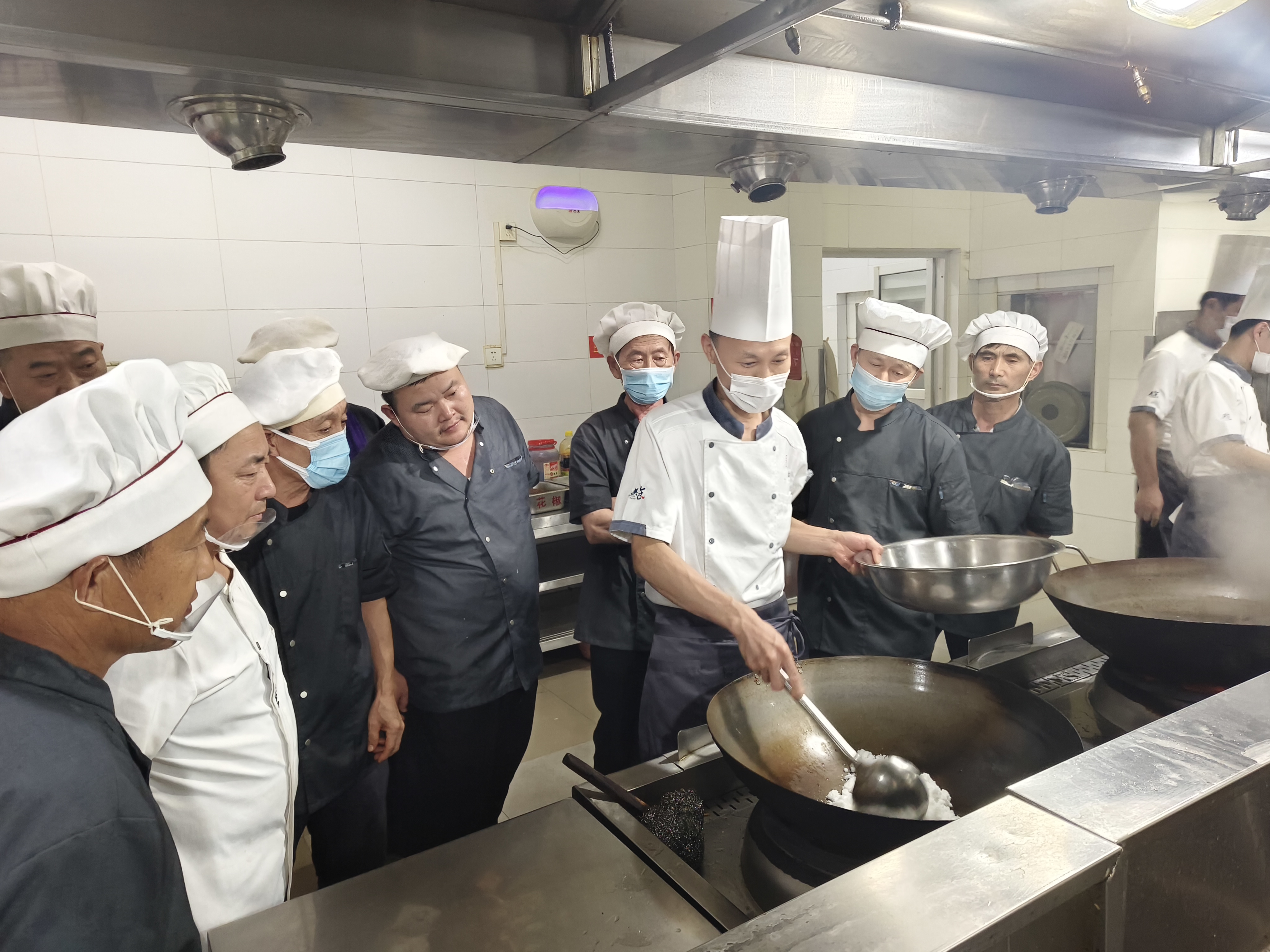 接着耿经理一行来到食堂操作间,尚食塘餐饮公司的厨师长向我校食堂骨干厨师,现场演示讲授了红烧肉、炒鸡等菜品的制作技巧。在现场制作过程中,学校食堂师傅认真观看制作方法,并就疑问进行了请教。
