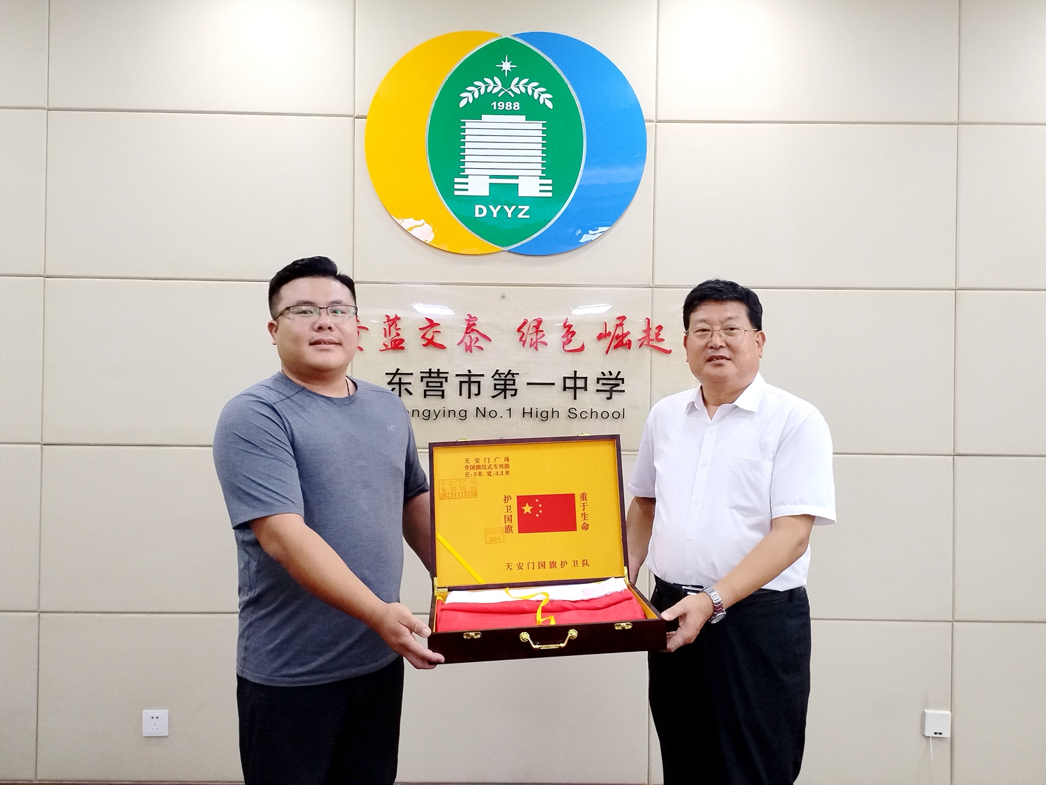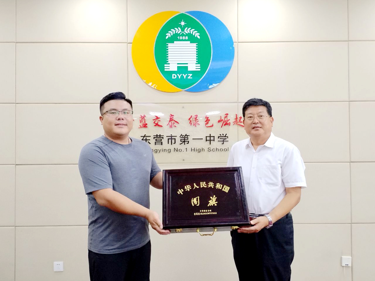 9月11日下午,山东智硕教育咨询有限公司董事长刘庆海向东营市一中赠送天安门广场专用国旗。学校党委书记、校长史本泉代表全校师生接受赠予。学校党委副书记、副校长刘培友参加仪式。
