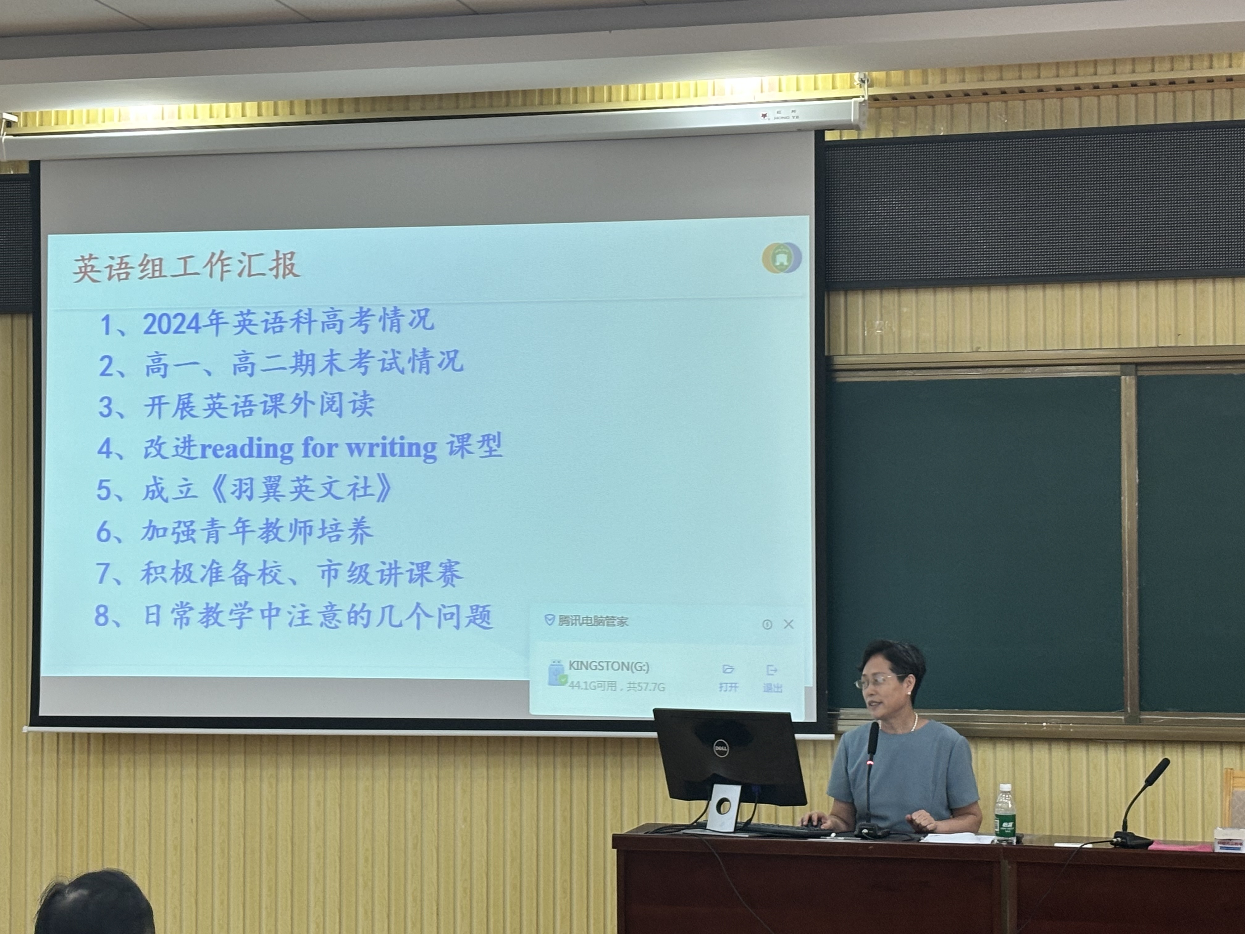 英语教研组长尹国红老师从2024年英语高考情况、高一高二期末考试情况、英语课外阅读、改进reading for writing课型、成立“羽翼英文社”、青年教师培养、各级讲课比赛、日常教学中需注意的问题等八个方面对我校英语组整体工作进行了汇报。
