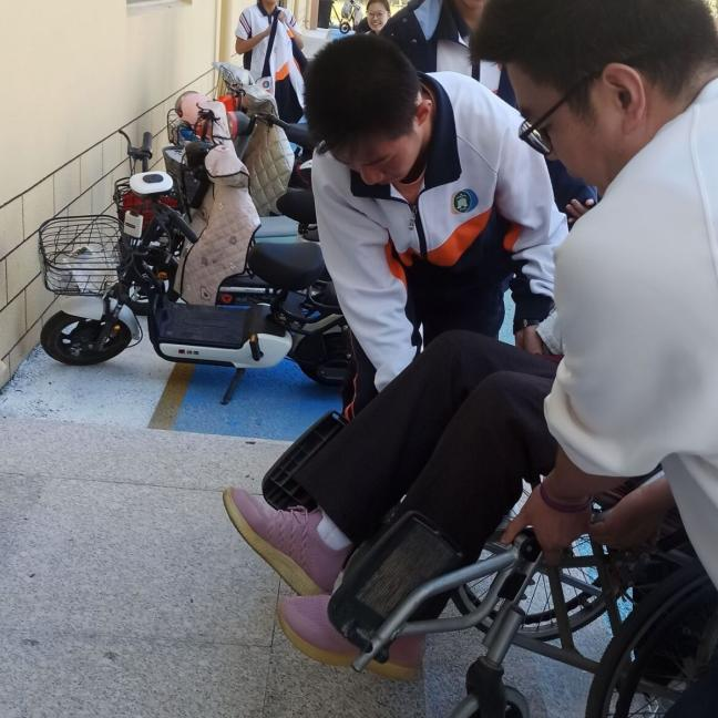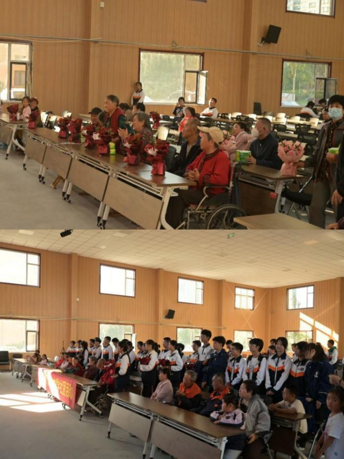 活动进入尾声,同学们自发向老人献唱了市一中校歌《心向未来》,老人们手捧承载学生敬意和关怀的康乃馨和同学们上台合影。其中一位老人腿脚不便坐在轮椅上,几位同学发现后便齐力将轮椅稳稳抬上舞台,这一幕令在场的人感动。