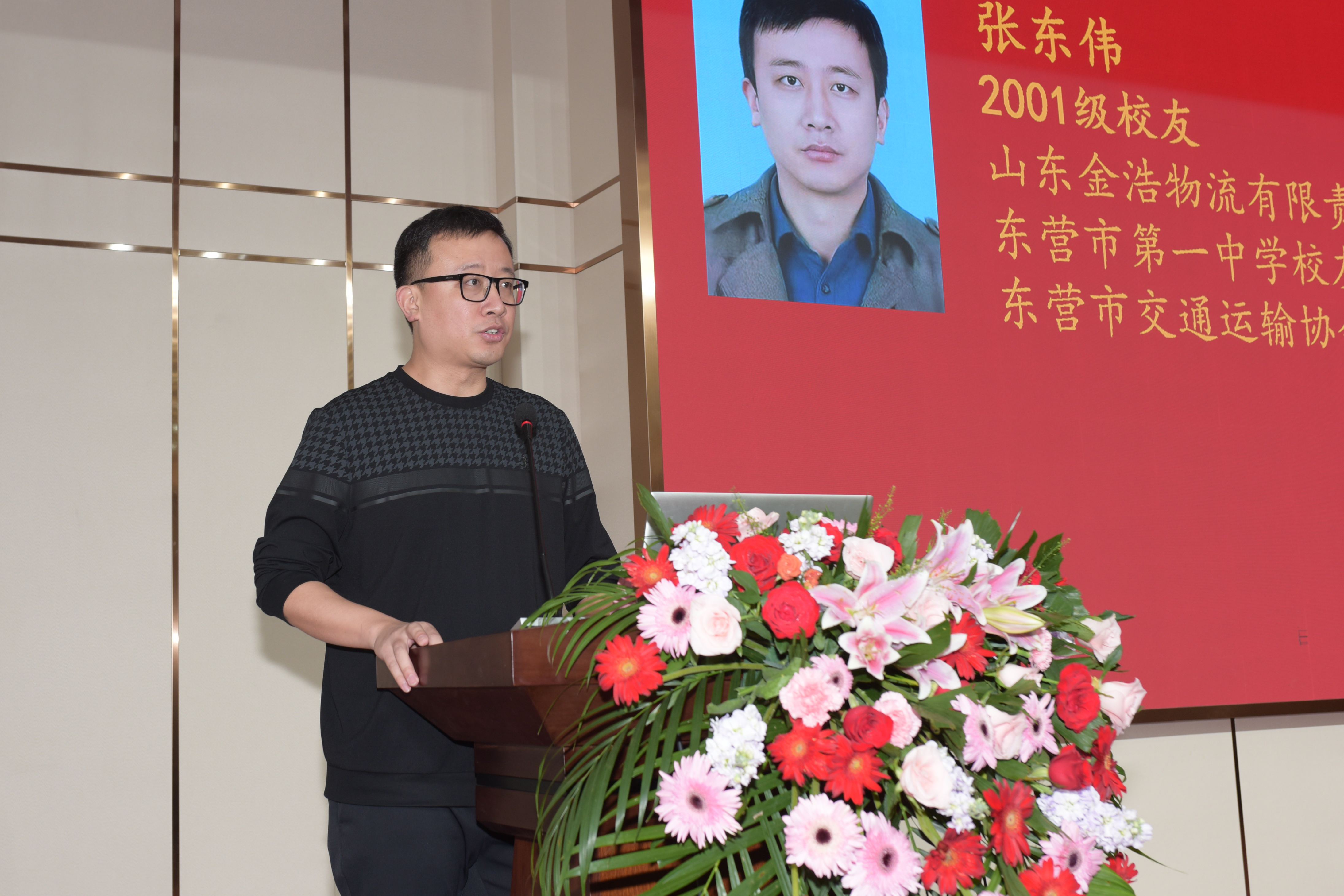 2001级优秀校友、东营市一中校友企业商会副会长张东伟发言。