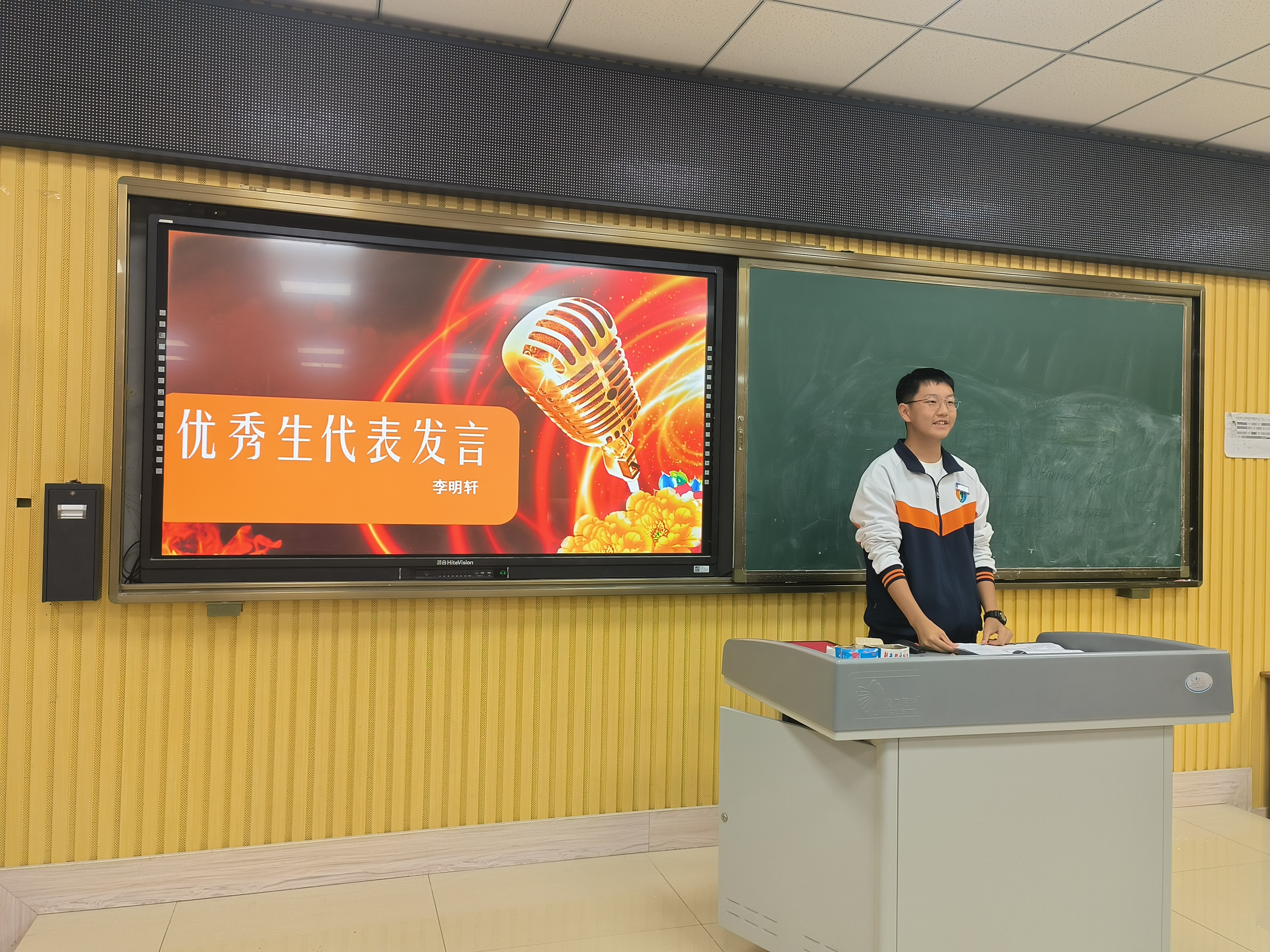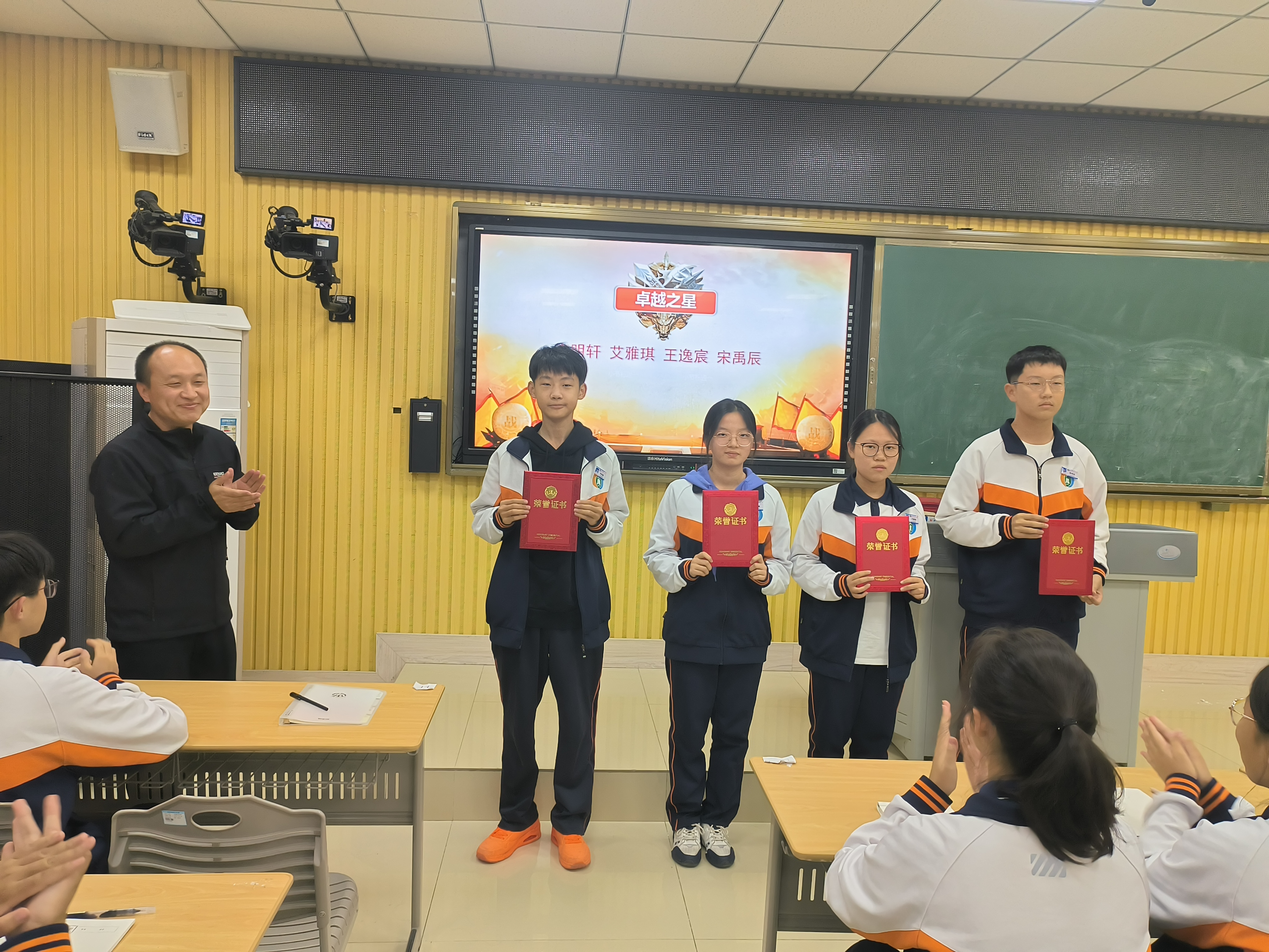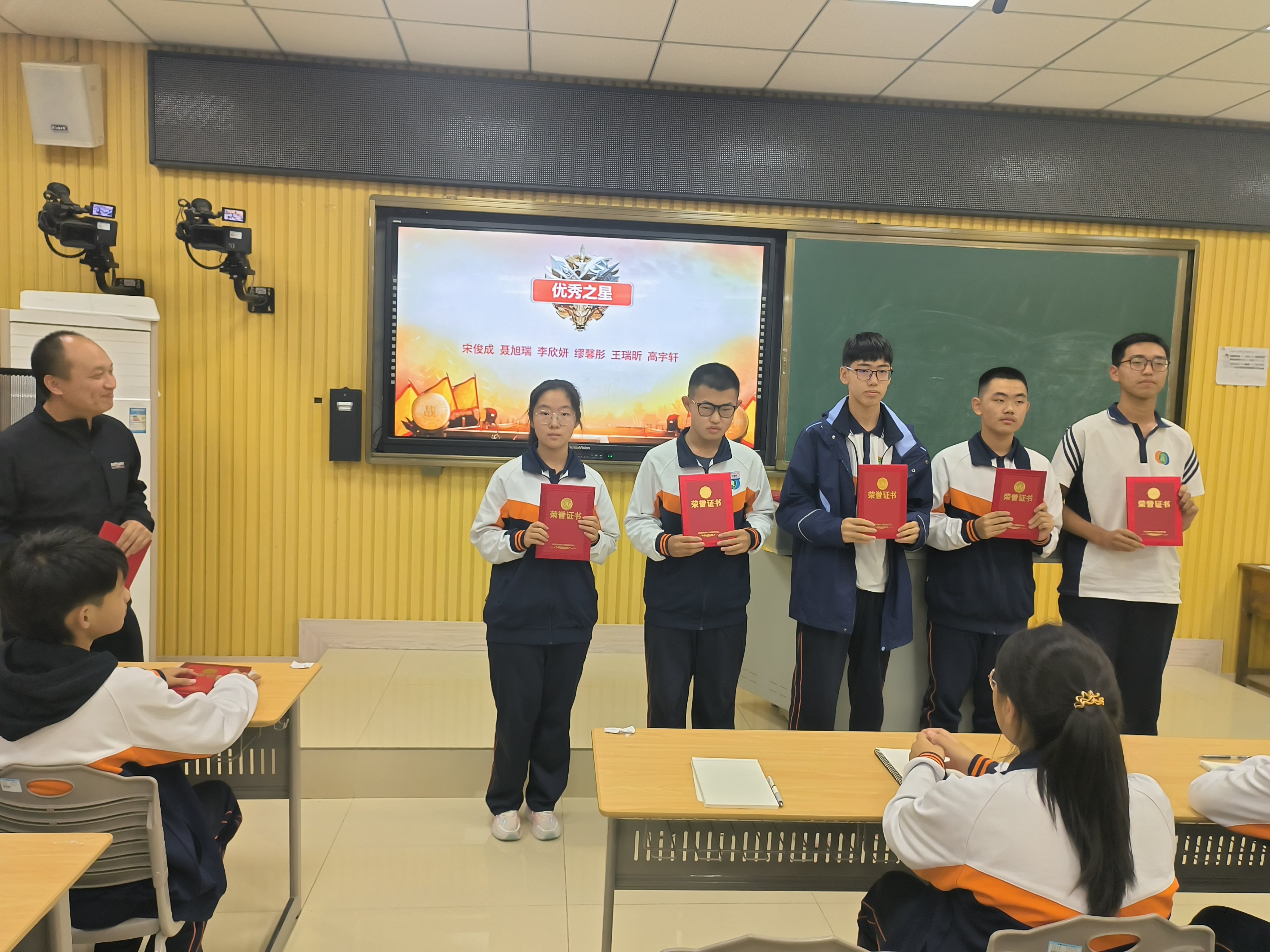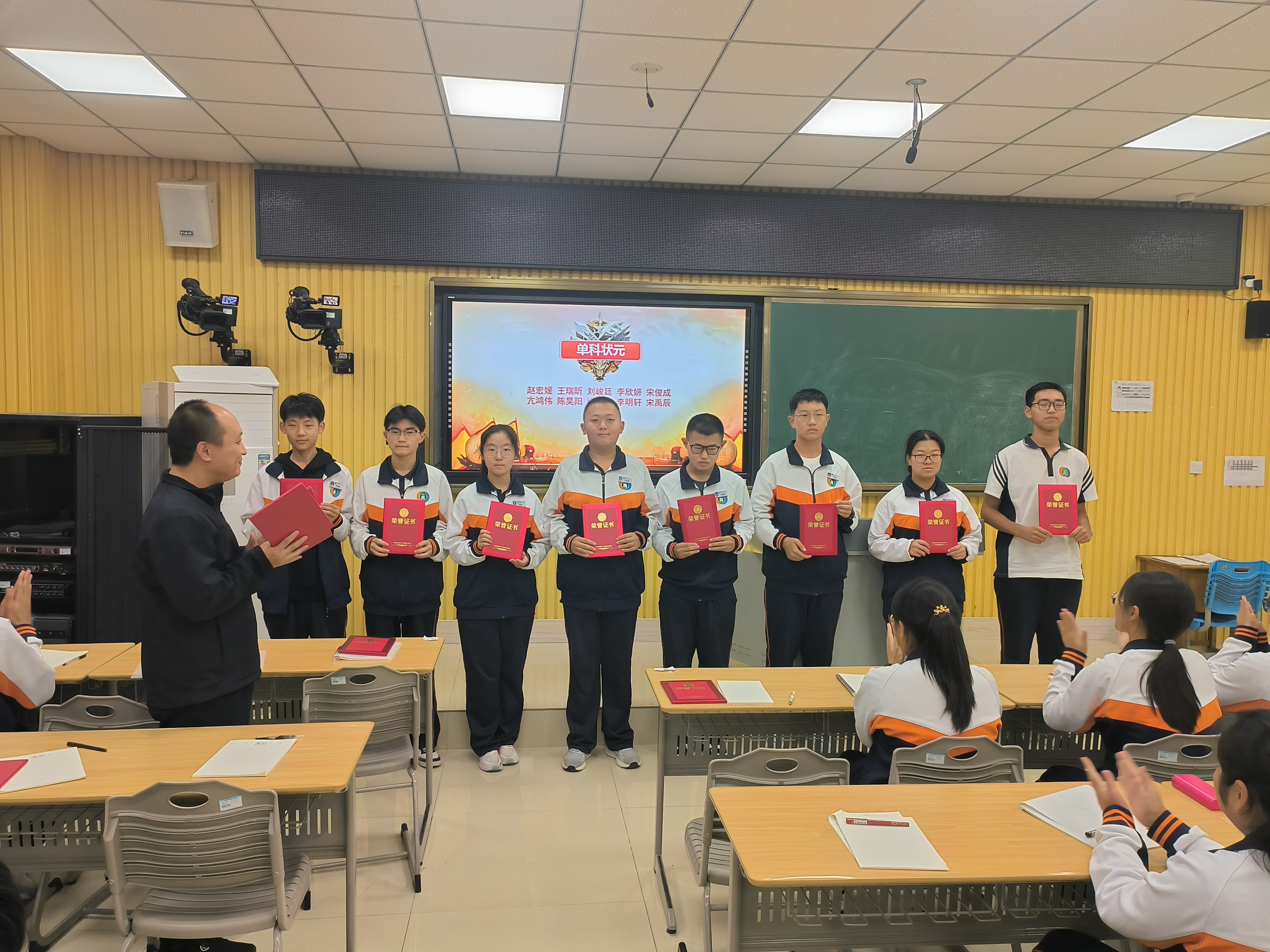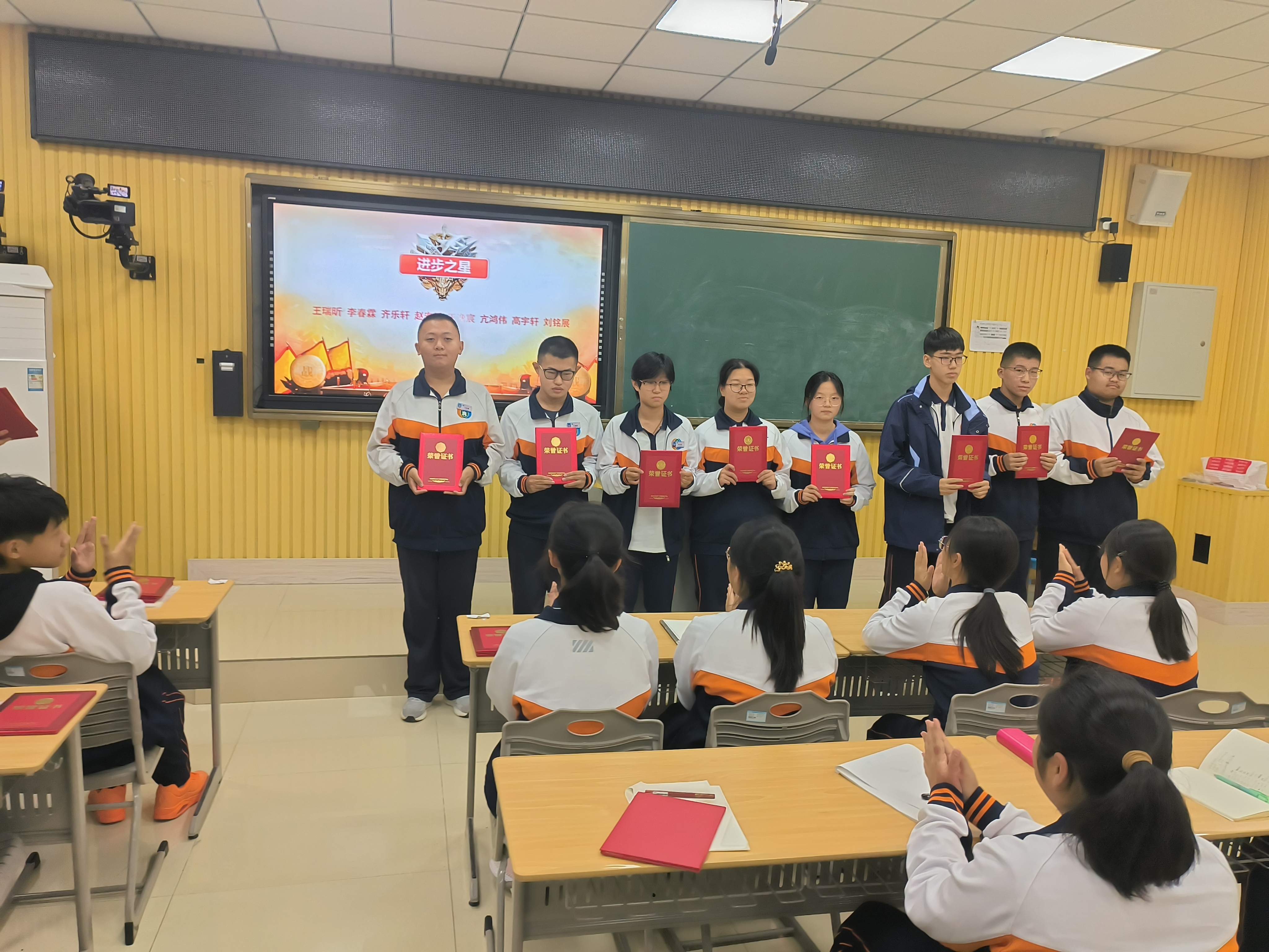 陈老师从月考成绩数据入手,从整体上帮助同学们分析本次考试的得失,勉励同学们从考试中反思经验和教训。随后对成绩领先和取得较大进步的同学进行了现场表彰,级部娄超主任亲自给优秀的同学颁发了证书。站在领奖台上,学生们的脸上洋溢着自豪与喜悦,这是一个多月以来,他们的努力付出得到的认可与回报。