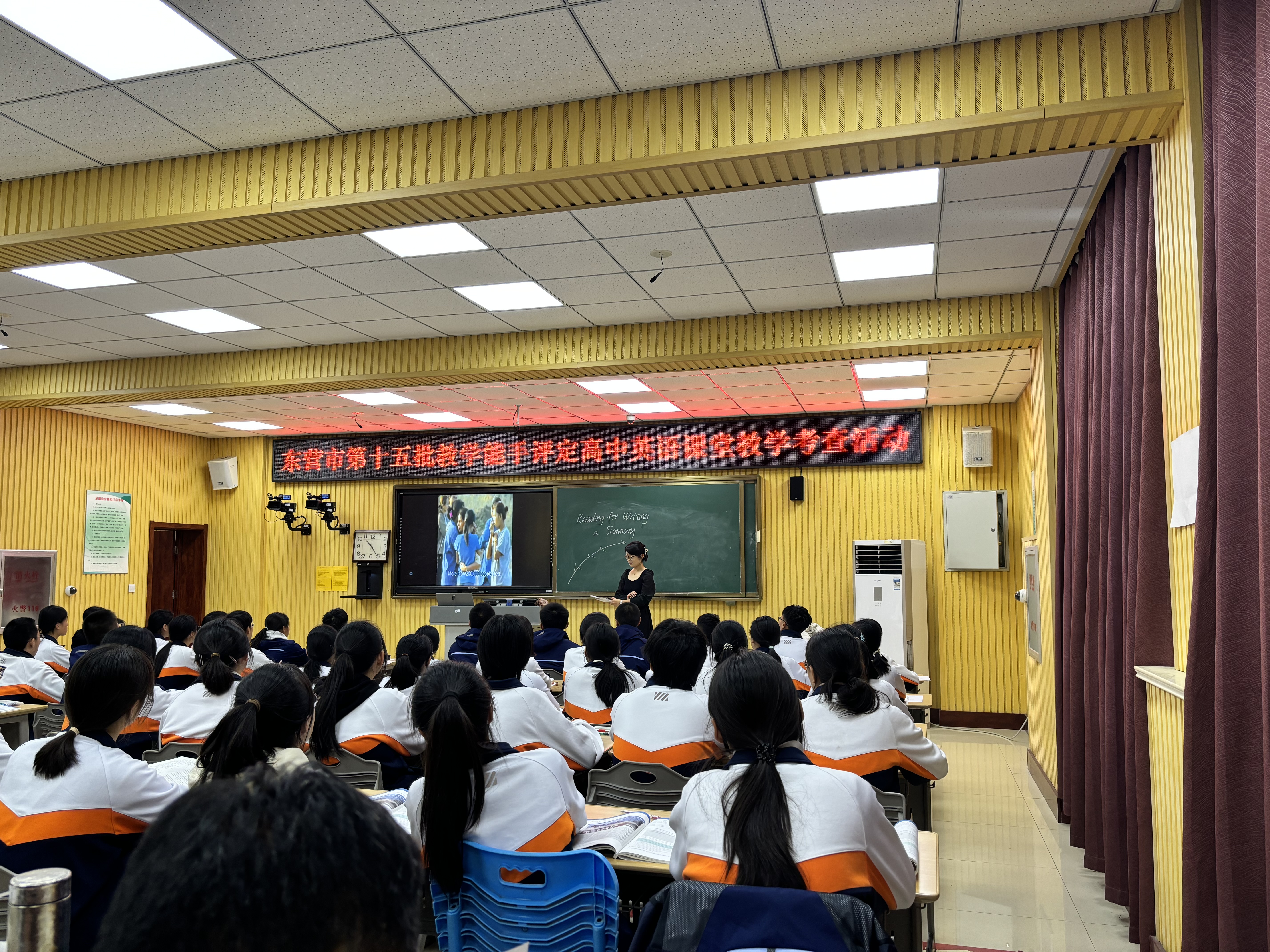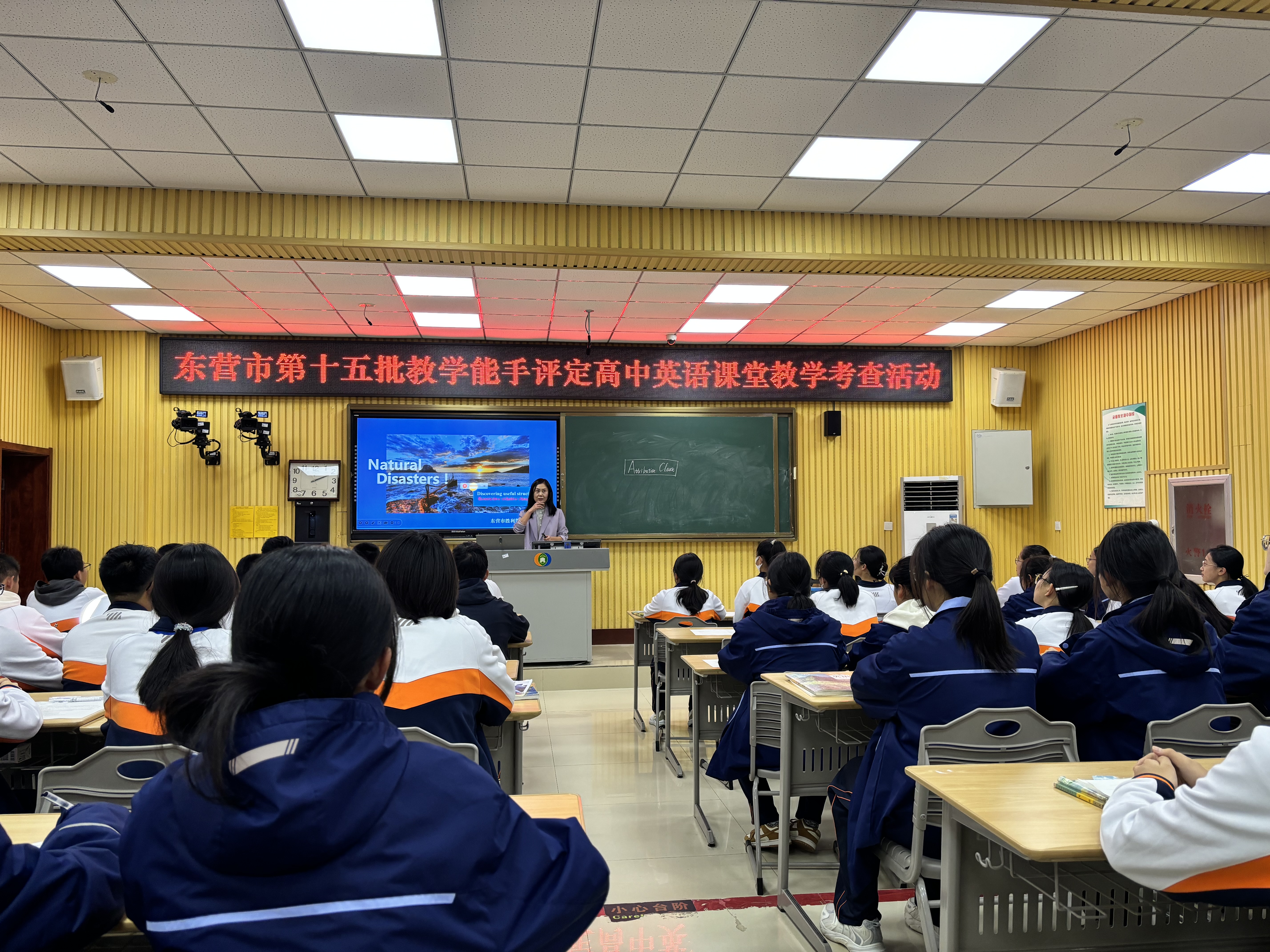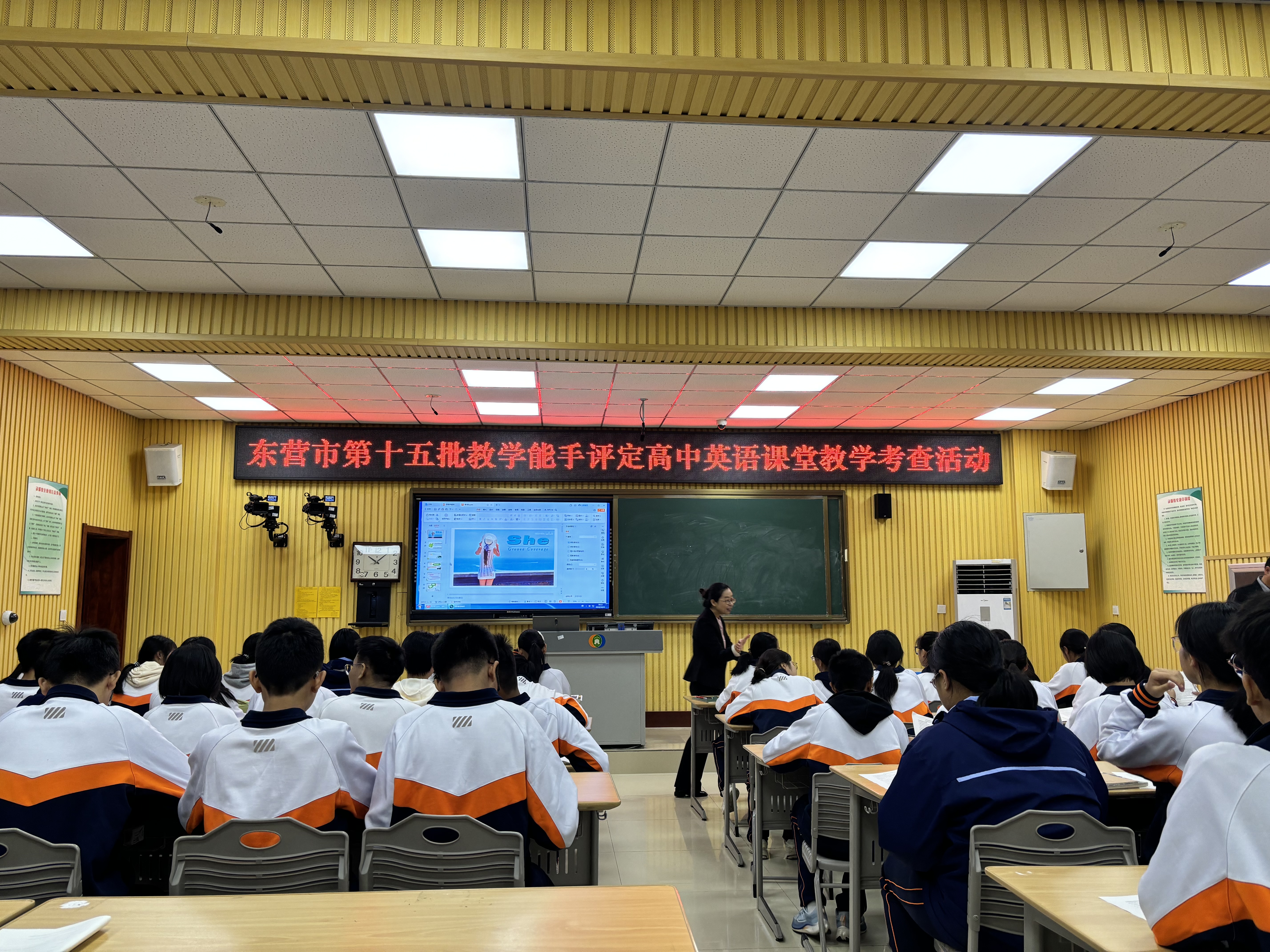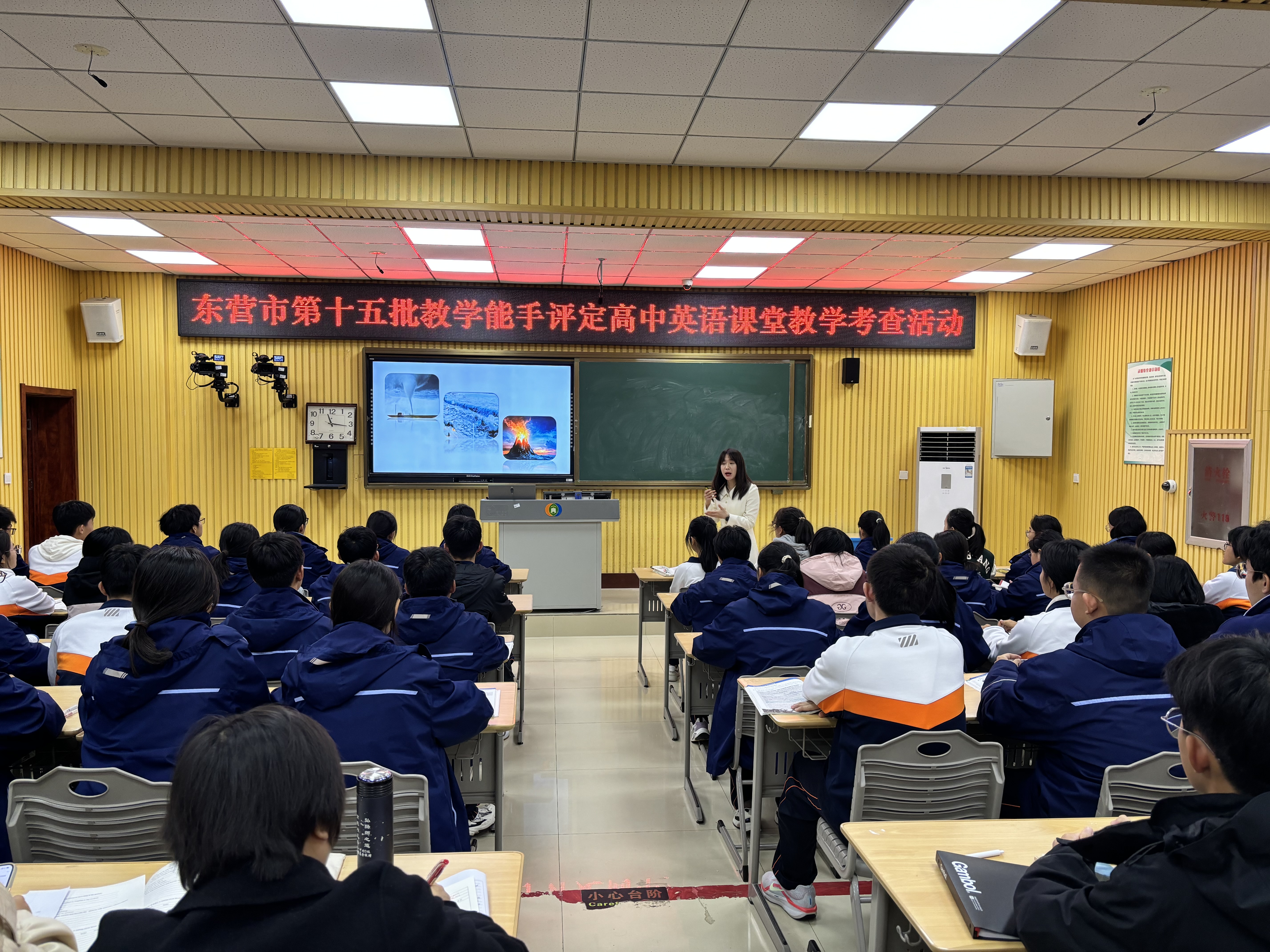 东营市教科院英语教研员崔洪兵老师等五名专家评委老师全程听课。全市高中英语老师积极参加听课活动、认真观摩学习九名老师精心准备的展示课,同时活动全程视频直播,确保不方便到现场的老师可以通过视频观摩学习。