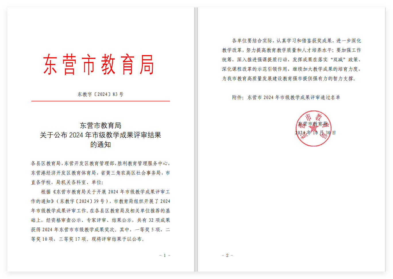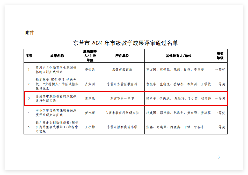 近日,东营市教育局公布了2024 年市级教学成果评审结果。由市一中党委书记、校长史本泉主持的教学成果“普通高中激励教育的深化探索与创新实践”在2024年市级教学成果评审中获一等奖。