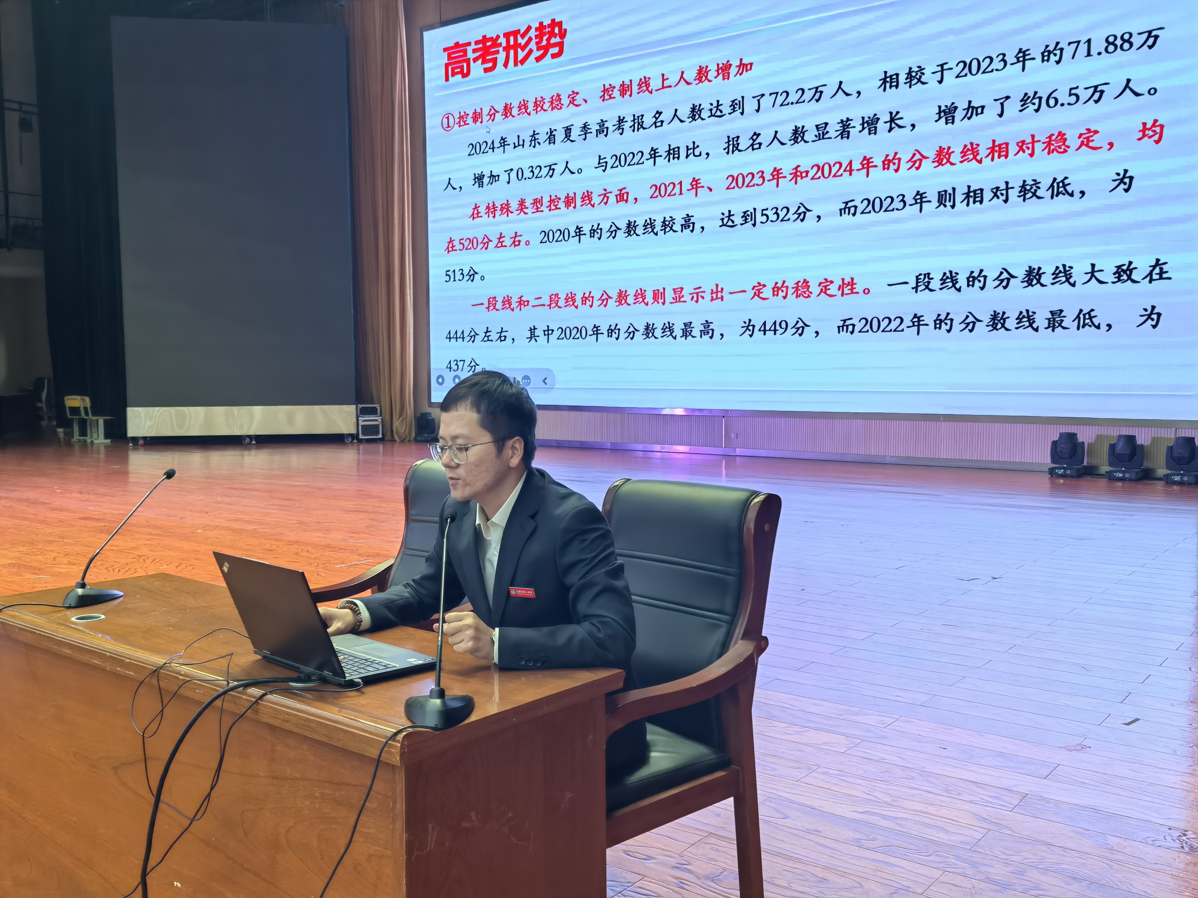 宋晓帅老师对综合评价招生政策进行了解读。宋老师分析了近几年的高考形势,在基本稳定的情况下,山东省新高考一分一段竞争加剧,因此综合评价招生有相当一部分的适应性群体。根据分析,适合参加综评的考生要注意积累赛事奖项,注重参与社会实践,以及努力争取获得省级以上的荣誉。宋老师还特别提醒家长和学生要时刻关注招生信息,并贴心提供信息渠道。