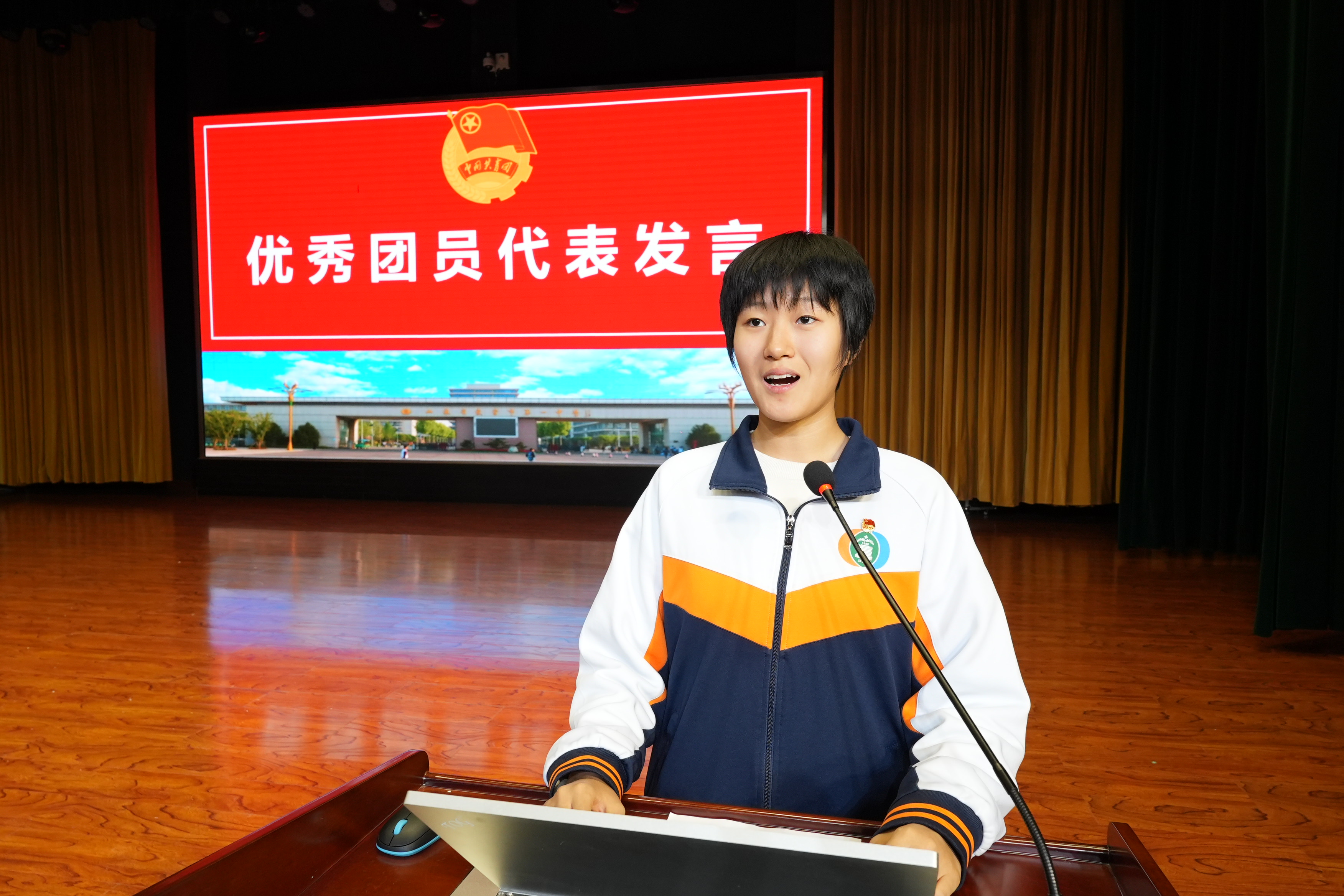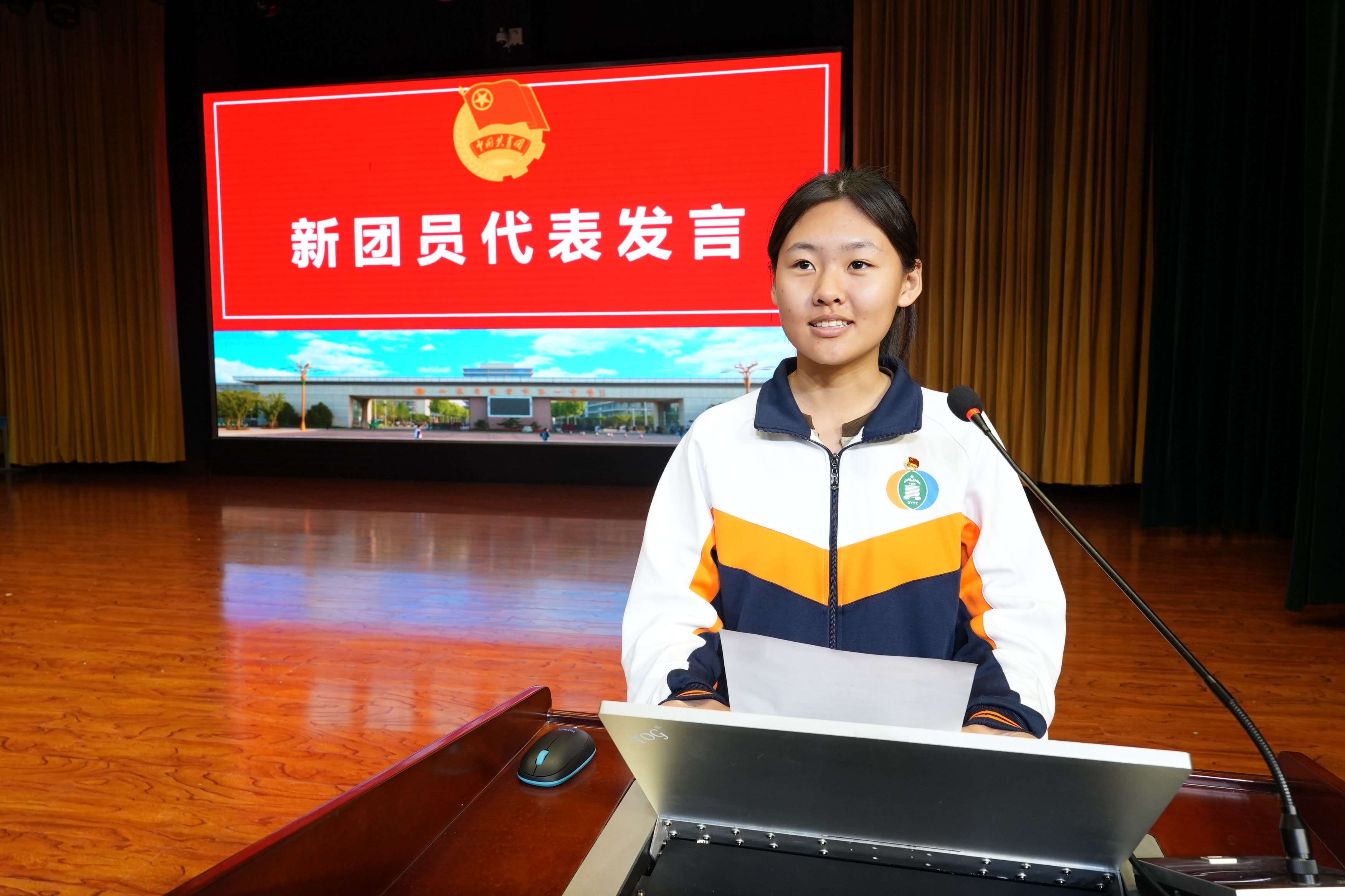 新团员代表高一26 班台正语同学发言,优秀老团员代表高一20班耿悠然同学发言。