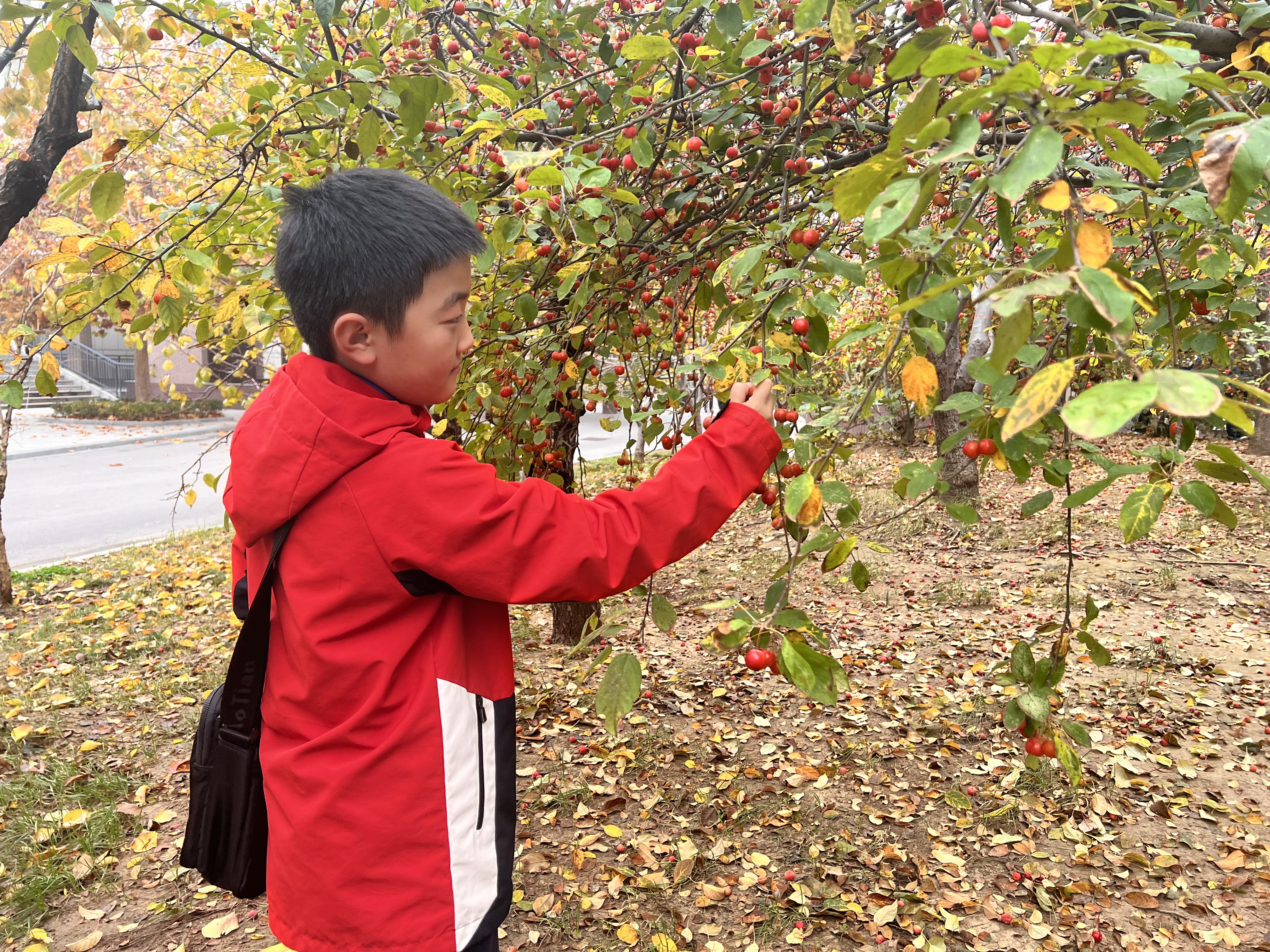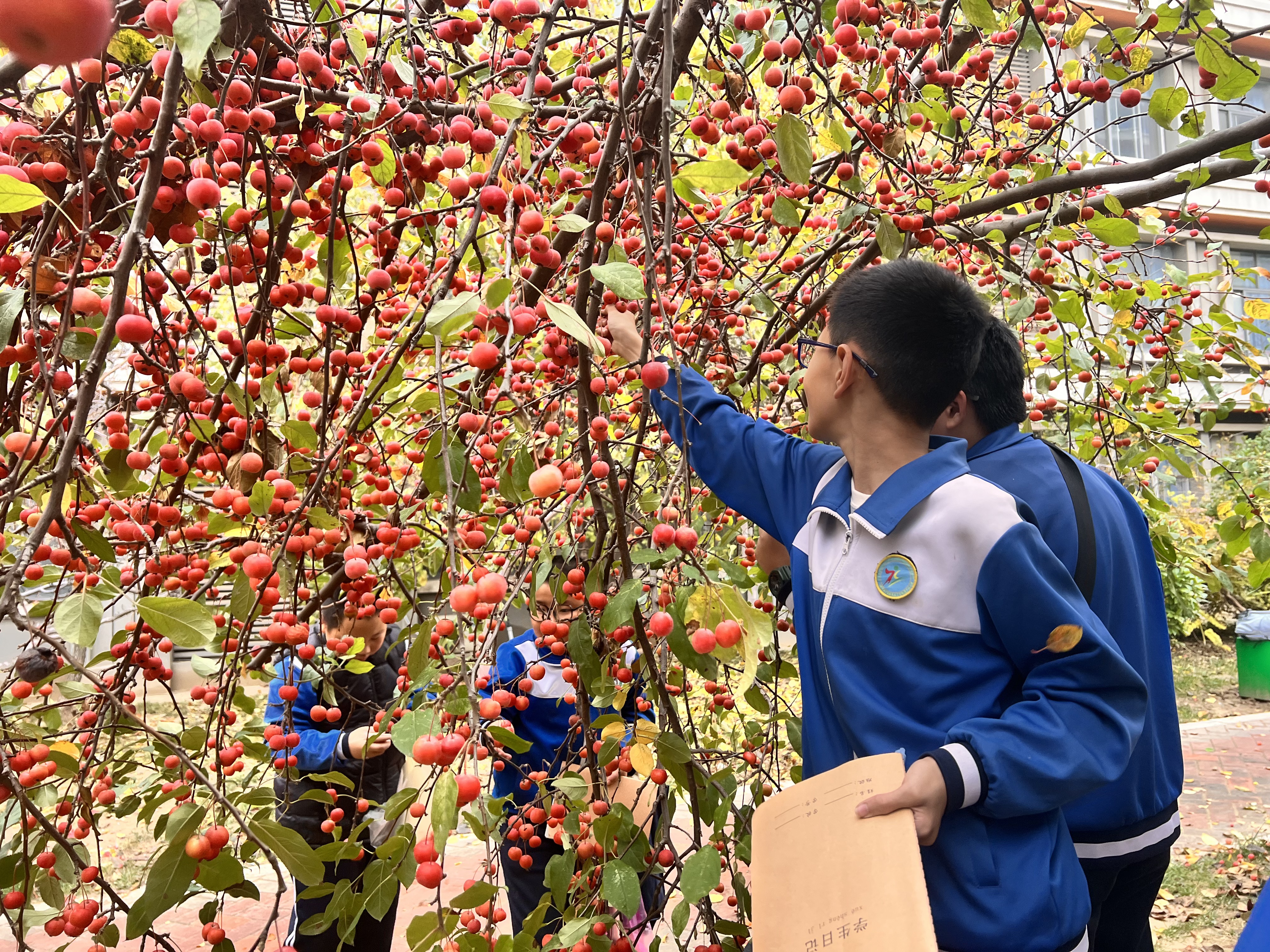 我校还组织农高区实验学校六年级的同学们参加了海棠果采摘活动。同学们兴致勃勃地穿梭在果树之间,小心翼翼地采摘熟透的果实。硕果压低枝头,喜悦飞上眉梢。