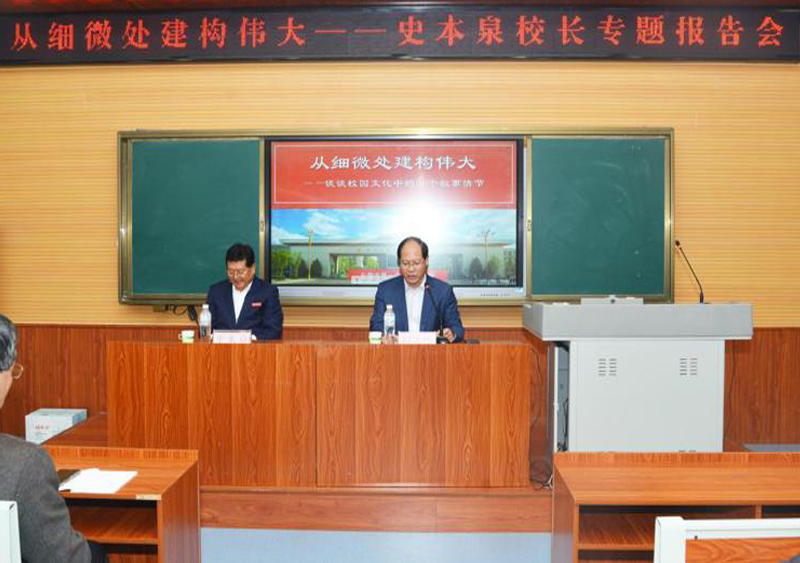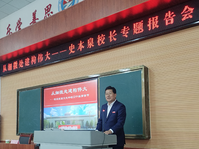 11月14日,东营市一中教育集团垦利校区举办校园文化建设主题报告会,集团总校史本泉校长以“从细微处建构伟大”为主题,从育人的温度、管理的精度、师资的高度、活动的广度、课程的宽度、文化的深度、校长引领的高度、学校美誉度等八个方面,围绕教育教学中的50个叙事情节,深入浅出地为全校骨干教师做了一场精彩的报告。报告会由垦利校区执行校长程志伟主持。